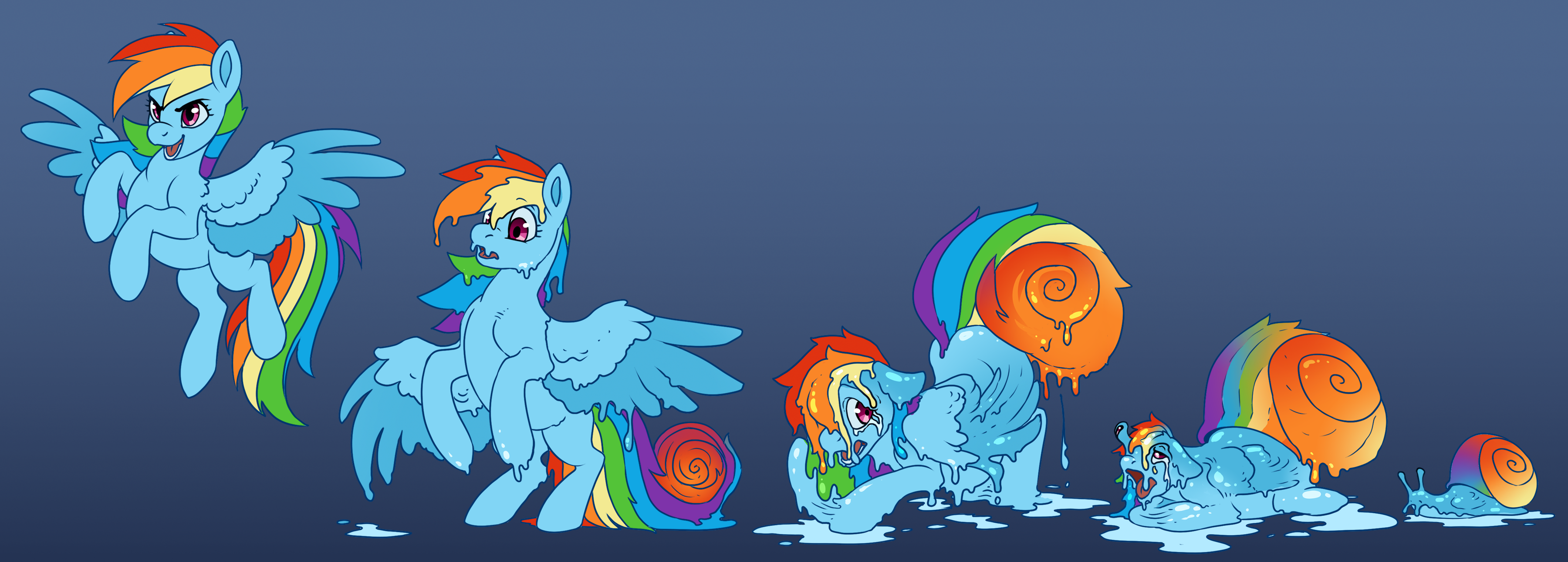 >>42899618That reminds me, for a little while now I've had this idea in the back of my head for an EQG fic...Basic idea is that almost all of Sci-Twi's friends have (by accident) completely screwed over a research project she was using to get a prestigious scholarship. Meanwhile, the Dazzlings are looking to try something different than their usual "popular band" gimmick (which they've done in decades past under various identities), and instead want to run a petting zoo where they can do daily music shows. So, on learning of Sci-Twi's situation, the sirens end up approaching her with the offer of funding and lab space, suggesting she get revenge with a very *specific* experiment: turning her friends into the dumb animals they are. Twilight would get her experiment and revenge, and the Dazzlings would get some "temporary" animals for their petting zoo. Twilight agrees, and tricks her friends into participating using a sneakily worded contract, after which they undergo slow, multi-week transformations into the creatures that Twi thinks are most ironic based on their personality and/or way in which they hurt her.For Rainbow Dash, that means becoming a snail.(Also, I'm declaring that EQG to non-sapient creature is valid in this thread, since I don't think /ptfg/ covers that. IIRC /ptfg/ only covers EQG to fully/speaking sapient Equestrian species.)