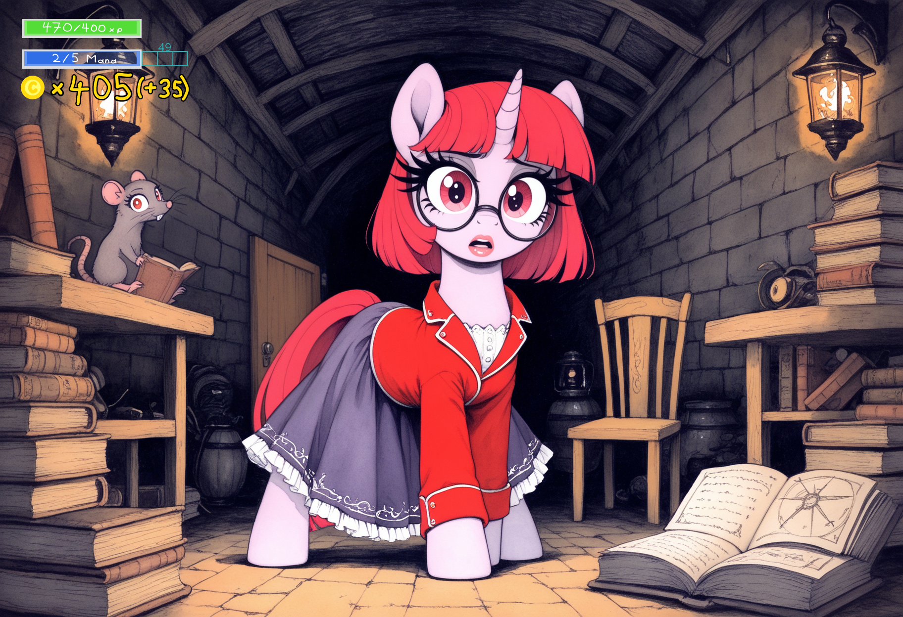 >>42948599>>42948618>>42948667>>42948686As she said she would, Ichorice produces a big flask of bright green liquid which she pours in the lock with a large dropper. Quickly enough, you start to hear a growing hissing sound as the metal starts to melt."Huh?" You hear the confused mare's voice inside. "What the…"On this cue, Knifepoint cleanly bucks the door open with a mighty strike of her back hooves. You quickly get inside as some red-maned mare is hurriedly trying to get back on her hooves, the shock having made her fall off her chair in a panic."Sorry for the intrusion." You start. "But I'm afraid one of your little protegees stole something precious from our client yesterday. Surely that was a mistake, I have no doubt about that, but we must still recover that one particular locket. Do you have any idea where it could be?"The mare in front of you considers your party. Ichorice and her vials may look less dangerous than she actually is, but when it comes to Knifepoint, her sheer mass and the fact her head is almost touching the ceiling make her a much more palpable threat."Well, what do you say?" You push your opponent a little. "We don't have all day."And as a bonus, you use your magic to make your big companion even larger, which makes the owner of this place take a fearful step back as Knifepoint now has to hunch over to merely fit in here."A-ah, well, a locket you say?" The mare in front of you replies, buying into your game. "Now that you talk about it, I think I remember that indeed I stumbled on an item like that. But like you said, this is just a misunderstanding, right? Surely that means there's no need to mention this place to your client, or to anypony else for that matter, right?""Of course." You nod. "As long as we get what we came for, it doesn't matter where from. What happened here can be our secret."Again, the mare appraises your words for a second."Then please wait here for just a second." She says, cautiously walking to the side. "I have it just in that room. I'll be back in a minute."You let the mare slowly walks out of view, hearing her hoofsteps on the stone and then the sound of hooves rummaging among many small objects."This is the one, right?" She comes back with a locket which matches the description the client gave you."It is." You nod as you collect the piece of jewelry. "Thank you for that. We will now be on our way."With the heirloom secured, you can make the trip back through the sewers, and return the locket back to the client. He is genuinely impressed you found it back in one piece so soon. As promised to the mare you got it from, you reply that you found it in a den of rats, among the trash they gathered to make their nests.>You completed the quest!>You gained 50 xp and 90 coins!>You recovered 1 mana (you have 2/5)>What do?>Spend the evening with some of your companions?