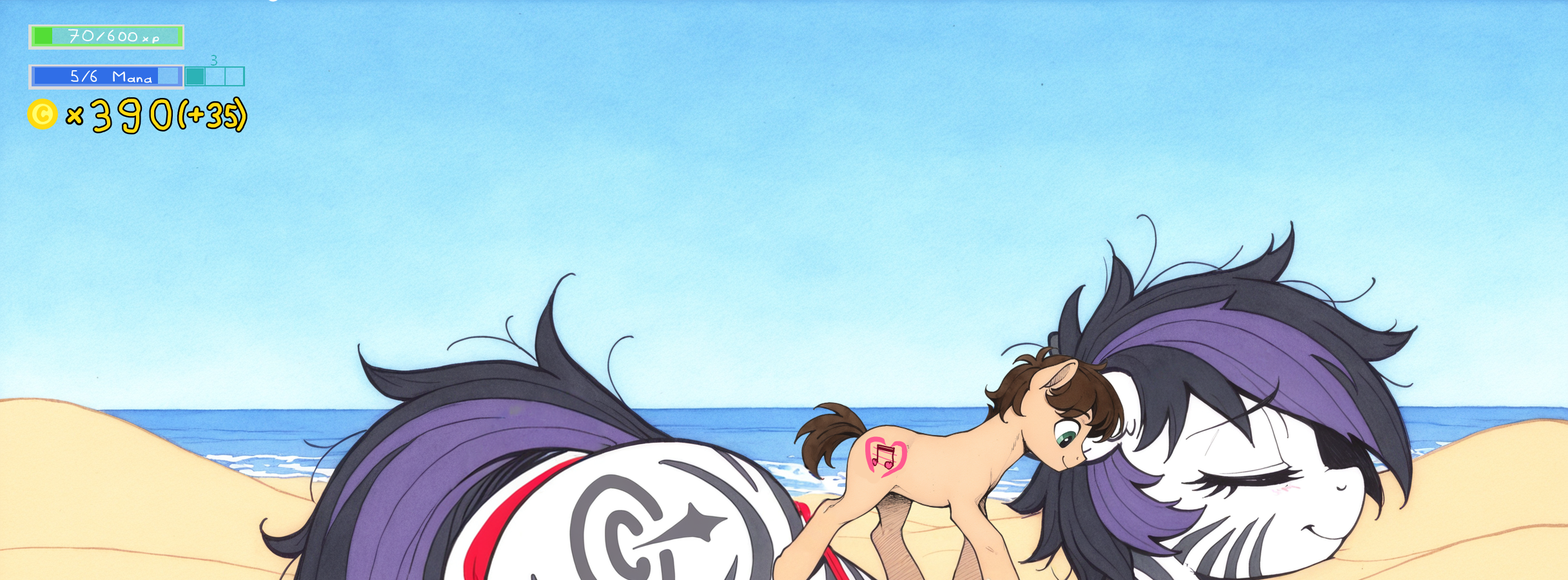In a world of fantasy and magic, all over the land there are ponies skilled in the arts of combat, magic, and everything in between who seek the thrill of adventure. They usually do so by accepting the quests offered by the honest populace that isn't short of issues for aspiring heroes to solve.You are one of such courageous ponies. You are a plucky earth pony, and a bard whose songs will magically improve the capabilities of your allies. You are a particular one, though, as you've decided to weave your strongest, most lecherous desires in your music. As a result, your powers can only affect mares, and you can reinforce them in more ways than a usual bard can. Unless noted otherwise, all the companions you'll join on your quests are mares as you specifically seek them out.As for the most recent events of your journey:While in Meadowburg, a quest to parley with a kelpie you had met in the past went south. After your companion attacked her, the kelpie took you hostage, and then brought you with her to the ocean where she kept you for a week in a state of magical daze and servitude.After that, she released you not far from Port Sunrise. You made it to the harbor city where you met a former companion of yours, Knifepoint, which you went on a quest with. The rogue zebra mare turned out to be very receptive to your growth magic, and decided to have some fun with you this night.You also exchanged a couple magical mails with your your companions from Meadowburg. Brass Compass and Chara will arrive to the port city in two more days.>Previous thread (#1): https://desuarchive.org/mlp/thread/42330176/#42330176>Previous thread (#2): https://desuarchive.org/mlp/thread/42455612/#42455612>Previous thread (#3): https://desuarchive.org/mlp/thread/42587627/#42587627>Previous thread (#4): https://desuarchive.org/mlp/thread/42795760/#42795760Here’s some information about your skills, inventory, the places you’ve been to and the mares you’ve grown.https://ponepaste.org/11646