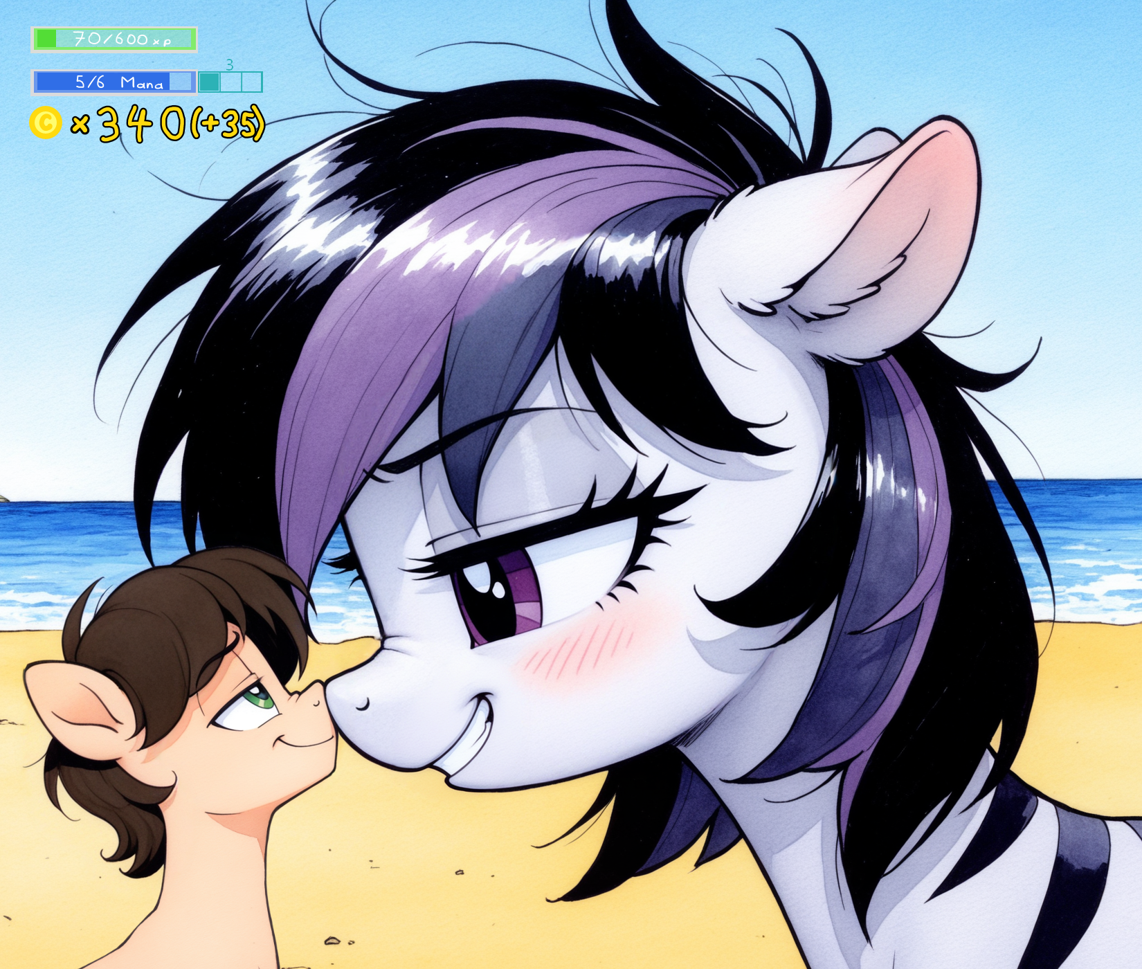 >>42973546>>42973672>>42973975>>42974478>>42974849>>42975135"Resist you?" You comment. "Do you mean that as resisting your seduction? Or where you thinking about intimidating whoever we face into submission?""Mostly option two. But let's not forget about option three." There, as she walks, the giant zebra casually bumps her rump into a nearby house, causing a little tremor that shakes the whole building on its foundations. You hear the sturdy wood groan as well as of some pottery breaking inside. Of course, no pony dares to tell a thing your giant companion for this gratuitous act of near-destruction, and lots of ponies scurry away towards other streets instead."I see that. Anyway, let's go with the red bikini." You decide. "I think this one will look better on you""Heh. Why did I even bother asking?" Knifepoint smirks. "Of course you'd pick the one that shows the most coat.""What can I say?" You smile back. "I just can't get enough of you."In addition to helping Knifepoint sew together the straps and the little fabric she intends to wear, you also buy a ball and a net to play with Knifepoint, and stock up on a whole lot of sun lotion to apply on each other, but mostly on your big friend.With the sun high in the sky and the warm winds over your coat, you make it to the beach. The whole coast around Port Sunrise has nice tracts of sand for all to enjoy. There are a few other beach-goers in the distance, and travelers on the road can see you from there, Knifepoint even more so of course, but aside from that you'll be on you own unless you decide to go meet other ponies. Though, the two of you already have everything you need to enjoy yourselves.You first readily run into the salty water, reveling in the rush of freshness over yourselves. Knifepoint is quick to use her body to make waves, literally so this once. Between her hooves touching the bottom at a much greater depth than you, and the sheer scale of her which allows a greater speed, she has a lot of fun turning the water around you into a raging sea. You do get a little worried when the mare's efforts aim at pushing further and further away from the shore, but the big zebra mare eventually hears your pleas and mercifully decides to let you get back to the land a little.Instead, with the help of a large rock that pokes out of the shallow water, Knifepoint decides to see how big of a divebomb she can make. The waves of her jumps are enough to make you travel 40 ft towards the shore, you end up asserting after many experiments. Similarly, you get yourself a thrill by diving into the sea from the cliff of Knifepoint's back. And then from atop her head. And then do so while she jumps herself. The zebra has a bit laugh at you for screaming at such a little fall. What could be scary about a mere 25' jump into the sea after all?You come out of the water some time later, feeling spent from the colder temperature and scrambling the water.