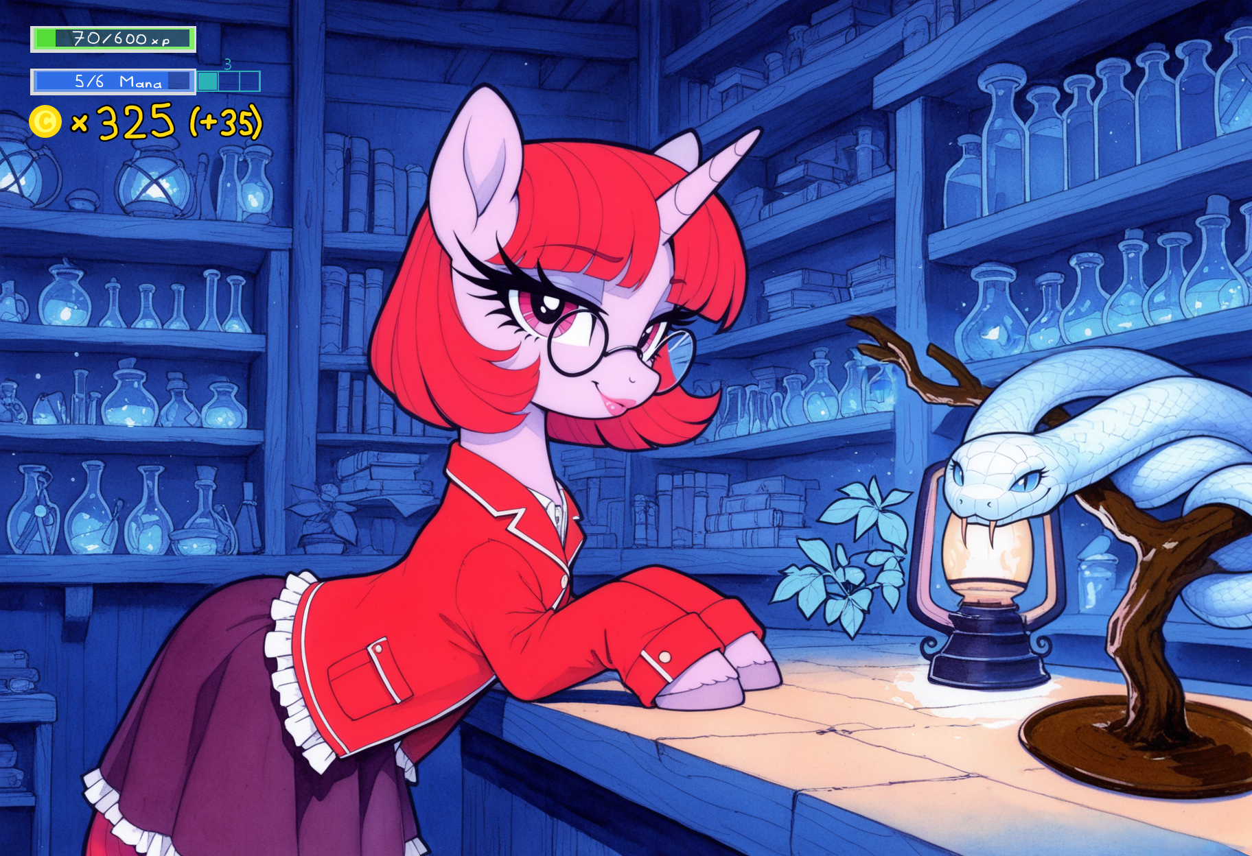 >>42998130>>42998321>>42998970>>43000431“Hello there!” You do your best to sound polite. “I learned of this place yesterday, as you may recognize my voice from the adventuring party that… ahem, bothered you last time. But I’m not here on anything related to a quest or anything this time. Please accept this small gift as a token of peace.”You hear hoofsteps approach from behind the wall.“Really now?” you her a voice hiss in front of you. “That alchemist companion of yours looked like she could have gladly poisoned this lot. State your business now or leave at once!”“W-well, I’m in search of services actually.” You hurriedly say. “You seem to be able to communicate with rats easily enough, and I wished you could use a spell to allow me to speak to them too. I had such an enchantment put on me in the past that allowed me to have a rat companion named Hilda at my side, but it faded away after I was separated from my party for a long time.”“Hilda?” The suspicion in the mare’s voice is replaced by curiosity. “Wait, who cast that spell on you last time?”“It was a witch named Ratchel.” You reply.“Ah, so it is her familiar you were talking about.” There, the wall in front of you suddenly turns transparent, and you see the mare from yesterday behind it, as well as the unhinged metal door on the ground. “Hmm… Well, you’ve made me curious now. How about you follow me upstairs to the shop. You know, where you’re supposed to get in when you visit somepony for services?”You accept, trying to stay on you toes as you pass through the immaterial wall and follow the mare in her den. After leaving the basket here as she instructs you, the two of you walk towards a door a the end of the corridor that opens on a flight of stairs. Up here, you arrive in a room that looks like the estate of an alchemist of some kind indeed, with vials of liquids with unnatural colors or jars and satchels of reagents stashed on the shelves along some books, candles or contraptions you don’t recognize. On the glass door to the outside, you can make up letters spelling ‘Thornea’s rituals’ on it. There’s also a rather large snake resting on a branch on the counter that eventually catches your attention. The creature is almost motionless, aside from turning their head to follow your movement with their uncannily still gaze.“And so you’ve met Ratchel.” The mare sits behind the counter, inviting you with a motion of the hoof to go where a customer would stand. “I didn’t expect to hear about her so soon. It hasn’t even been two months since she left.”“If you don’t mind me asking, who is Ratchel to you?”