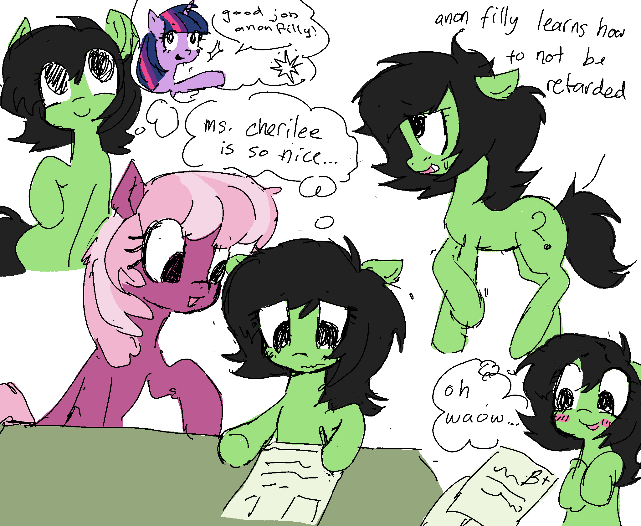 >>42999757The interaction below this image was too good to pass up>You reunite with your long lost friend>He disappeared a long time ago but now he's a colt living in Equestria >You're jealous especially after learning he was adopted by none other than Twilight herself >You go into the Golden Oak library excited to meet the mane 6 and live your fantasy as a human in equestria "So anoncolt, what's Twilight actually like, is she just like she is in the show?">Anon colt whinnies with joy"Oh absolutely, even better than the show! She is so loving and caring. Even though im an earth pony she still treats me like her own and Spike is a total bro too">You can hardly believe your ears relieved your friend has had a good time in equestria "So what do you plan on doing now that you're in equestria?">A smile creeps across your face"Oh, you know the usual, cum inside Rainbow Dash, see where the day takes me">Anon colt acknowledges fishing what looks like a laser gun out of a drawer"Oh, you won't be doing much of that">You look in confusion reading the letters on the side of the gun in his mouth>You barely react as the adorable little green colt points the gun at you"Filly-Ray?">You ask before being blinded by the purple light>Your limbs start to shrink as your body takes its new pony form>Your clothes become loose and baggy as you fall on your butt and look at your hooves>Your lips tremble as you look at your hooves in fear"Hooves? Im a pony?">You ask looking up to anoncolt"Yep, Twilight has been wanting a little filly for a while. I think you'll make a great little sister""Sister!?">You frantically feel your bits"My dick!!!">Anoncolt sets the Filly-Ray down, proud of himself "Dude, i know you, you weren't using it anyway">Twilight enters the Library excited to finally meet anoncolt's friend>Her eyes instantly eye the Filly in the pile of clothes"Anoncolt, what did you do!">Twilight's magic lifts you out of the clothes pile "He shot me with the Filly-Ray">You pathetically whimper as Twilight's hooves hold you tight>Twilight's heart pounds with pure love as she cuddles her filly tight"Shame on you anoncolt, why would you turn your friend into a...cute...adorable little filly">Twilight scolds before giving you a tight cuddle"Come with me little filly, you're going to be alright">Twilight flashes a smile to anoncolt as she goes upstairs >Anoncolt smiles with pride giving Twilight a cheeky wink back