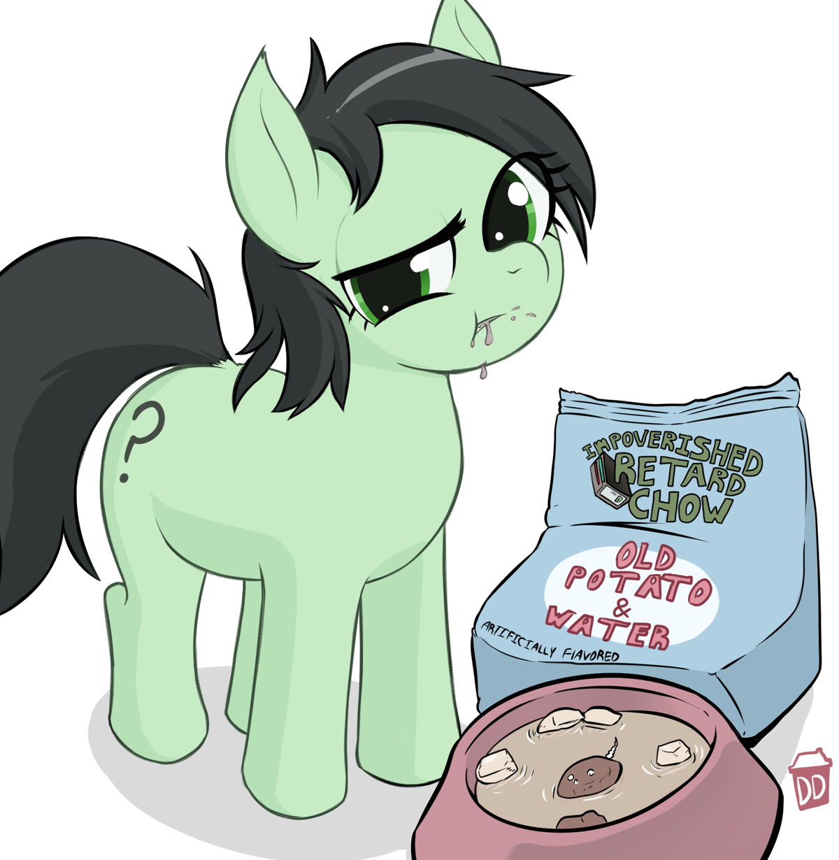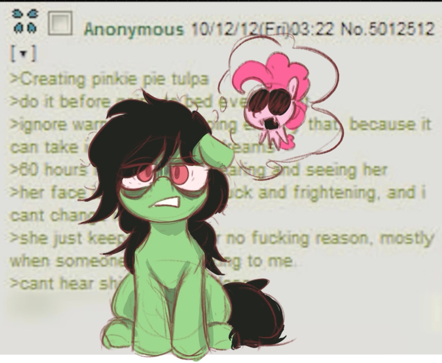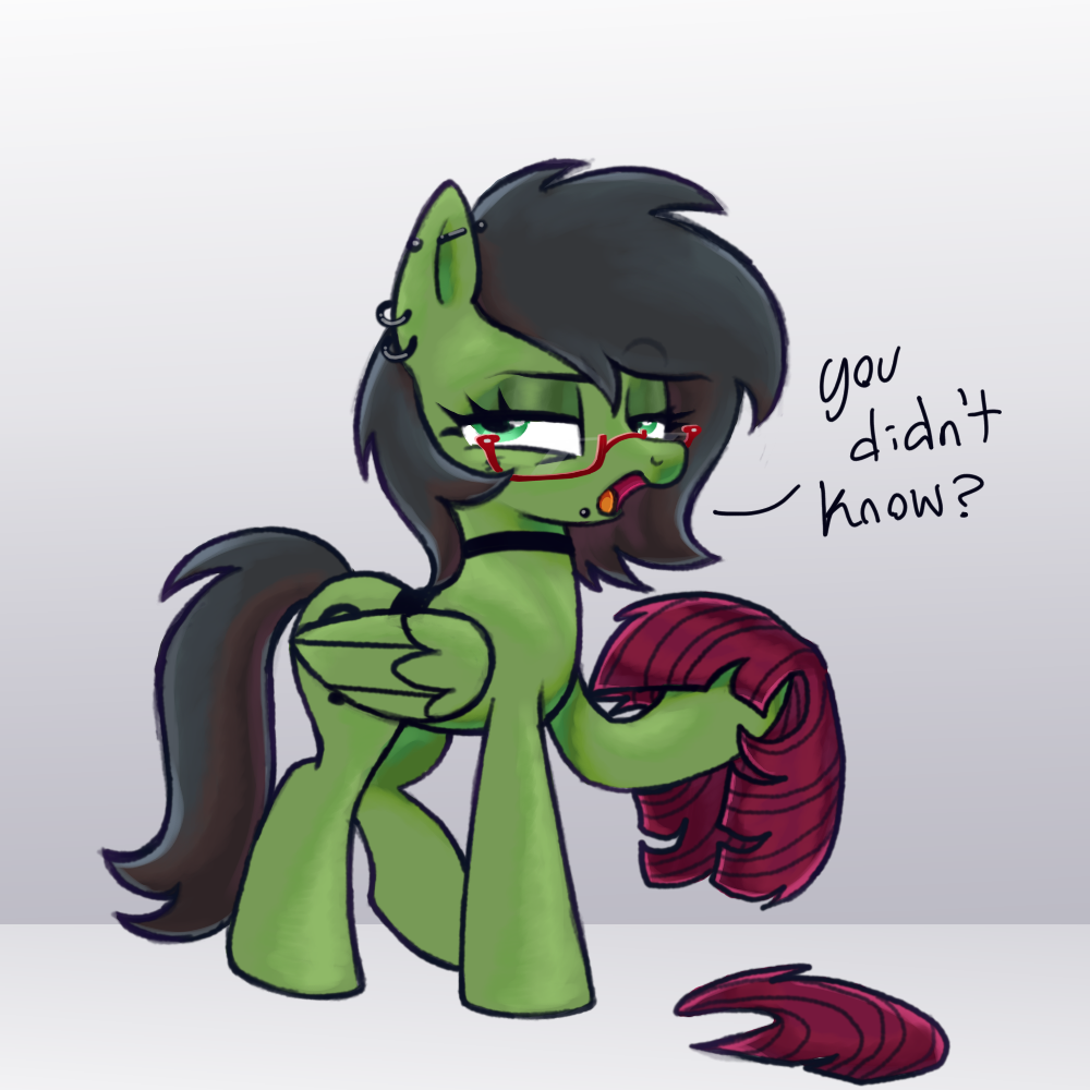 >The new filly, Anon, has largely settled into her foster home.>No headway has been made in finding out where she came from, and her vague answers of, "really far," and "You wouldn't have heard of it," aren't helping, but she's nice enough, if a bit odd at times.>Like, how she's been humming the same little tune all day long until her foster mom asks what the song is from.>"Just a little ditty from back home. I get it stuck in my head sometimes.">"Oh? Does it have lyrics?">"Mhm! Wanna hear them?">"Well, sure, sweetie!">Anon proceeds to clear her throat and starts to sing.>(To the tune of the Oscar Mayer song)>"My breakfast had a first name, I know not what it is.">"My dinner had a last name, but ignorance is bliss.">"I do not ask such questions, I just consume their flesh.">"The elders ensure all us that this is for the best!">She beams up at the mare and asks, "See it's kinda catchy, right?">The mare's face is frozen in a smile for several seconds before she clears her throat, "Um, y-yes, that is a very... interesting song. A-anyway, I 'm going to get started on making the family dinner. I mean, making dinner for the family!">After a quick nervous laugh, she rushes out of the room just as Anxon snickers to herself.