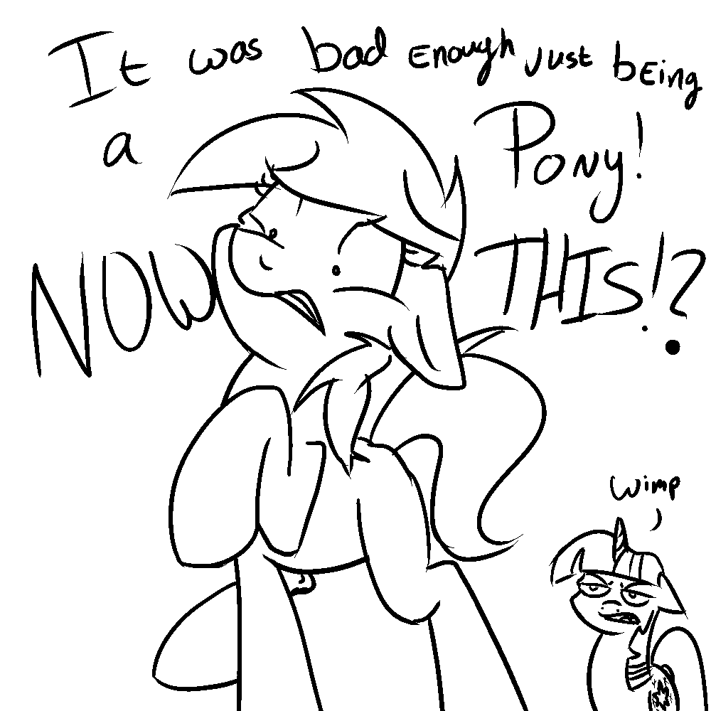>>42989609>You wander through the streets of Ponyville >The streets seem alien to you>The normally laid back cheerful ponies are all eyes forward focused on their mission to keep King Mahrek happy>You wish even one pony would show you a smile so you could pretend everything is fine>You hear quiet sniffling from a bush>Maybe another pony struggling to cope with the visions you think to yourself >You look in the bush and find Twilight hiding inside>Twilight gasps with fear>They found me! She thinks to herself >Struggling to get to her hooves you calm her down"Twilight! What's wrong? Did you find the others?">You ask as Twilight realizes you're not under Mahrek's spell"Wait, Nonny, you're not under his control?">Seeing everypony around totally acting utterly insane and crazed, you understand what she means even if you don't see the chains"What? No, im fine, what about the elements of harmony. Rarity, Pinkie? What happened to them?">Twilight sniffles once again the pain of seeing all her friends turned into servants of Mahrek was too much to bear"They, all gave in, Pinkie is making Mahrek a party, Rarity is finding gems for his coronation, rainbow dash is off with the wonder bolts training for an air show, and Fluttershy is refusing to leave from under her bed. IT'S HOPELESS!">Twilight shrieks briefly getting the attention of ponies bustling around the town"Unless i can find some way to free them from his spell. I can only do one at a time and i can only do it for a moment, his magic is too strong">Twilight pauses for a moment trying nto understand why you aren't submitting to Mahrek's magic>Twilight cautiously approaches the subject trying to come up with a reason"I don't understand though, it seems as though im the only one immue to the magic, and you apparently. I must be immue because im an alicorn, which would explain why Mahrek wants everypony to bring me to him. But I can't explain why you are immune. You're just an earth pony, it doesn't make any sense">Twilight goes limp nearly giving up as the inexplicable nature of your immunity weighs on her"Well, im not just an earth pony, im a human. That must have something to do with it">You casually mention as Twilight's eye's grow wide with delight"Oh, nonny, i can't believe i forgot you were a human">She pokes her head from the bush tapping her hooves together "It makes total sense now, his magic works on ponies but not on humans">She tries to think of a plan to make use of her newfound knowledge however she depressingly can't think of anything >What would a young Alicorn and a random earth pony hope to accomplish against King Mahrek "Oh, what's the point, we would need hundreds of ponies to even stand a chance at beating King Mahrek">Twilight sinks into despair wondering if Celestia, Luna, or Cadance are even ok"Even the legends said it took all the alicorns united to trap Mahrek in his prison. Oh Nonny, what are we gonna do!"
