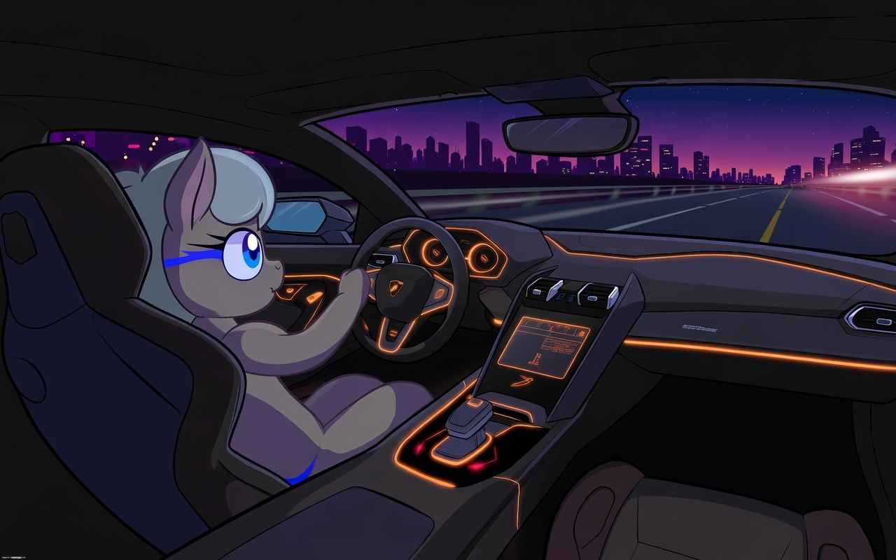 >buckle up as she revs the engine once, just to hear it growl>she pulls back onto the road, smoother this time, almost civilized>for about thirty seconds>suddenly she downshifts hard, punches it, and we're blasting down a wide boulevard again>"Just one more quick run, pleb. I need to feel the top end. You're with me, right?">city lights blurring, wind roaring, Kavinksy style music cranked up loud>then in the rearview, blue and red flashing lights>police carriage with crystal sirens closing fast>the remains of my human brain screams ABORT ABORT THIS IS HOW YOU GET ARRESTED>hooves dig into the seat, heart trying to escape chest>"Uh, Spoon? We have company.">she glances in the mirror, eyes lighting up like Hearth's Warming>"I noticed, contact guards at 4, tally-ho!">instead of pulling over she actually hoof slams the pedal to the floor>Sweet Jesus of Nazareth she is talking to me>"I have angered them, it's normal. They do a good job, you know">shifts hard into higher gear, redline bouncing as she redlines the revs>tilts her head, but keeps scanning the road with attention>she's talking something proper to her logic why this car is affordable on the long term>"If you're rich, you buy speed. If you're poor, you buy a haywagon, slow, cheap, and you never get fined because you're never fast enough to matter. But you lose time.">laughs like that's the cleverest thing ever even if her voice is muffled by the engine's roar>then gets this thoughtful little filly look, ears perked>"As Starswirl once said, 'Time is the only river that flows one way, but the swift pony rides its current instead of drowning in it.">sirens dopplering behind us, lights strobing but falling back and vanishing>"That means if you control speed, you control time itself. That's what's important.">she says it so proudly, like she actually understands it>"Mom said I should be home before 9, so gotta hurry a little bit.">look at her, look at the road. I'm getting it>sign says "Canterlot 350Mi">"Spoonmare, I'm together with your plan.">We're leaving Manehattan racing against the night on the highway and streaks of light>Nothing exist behind us, only the past
