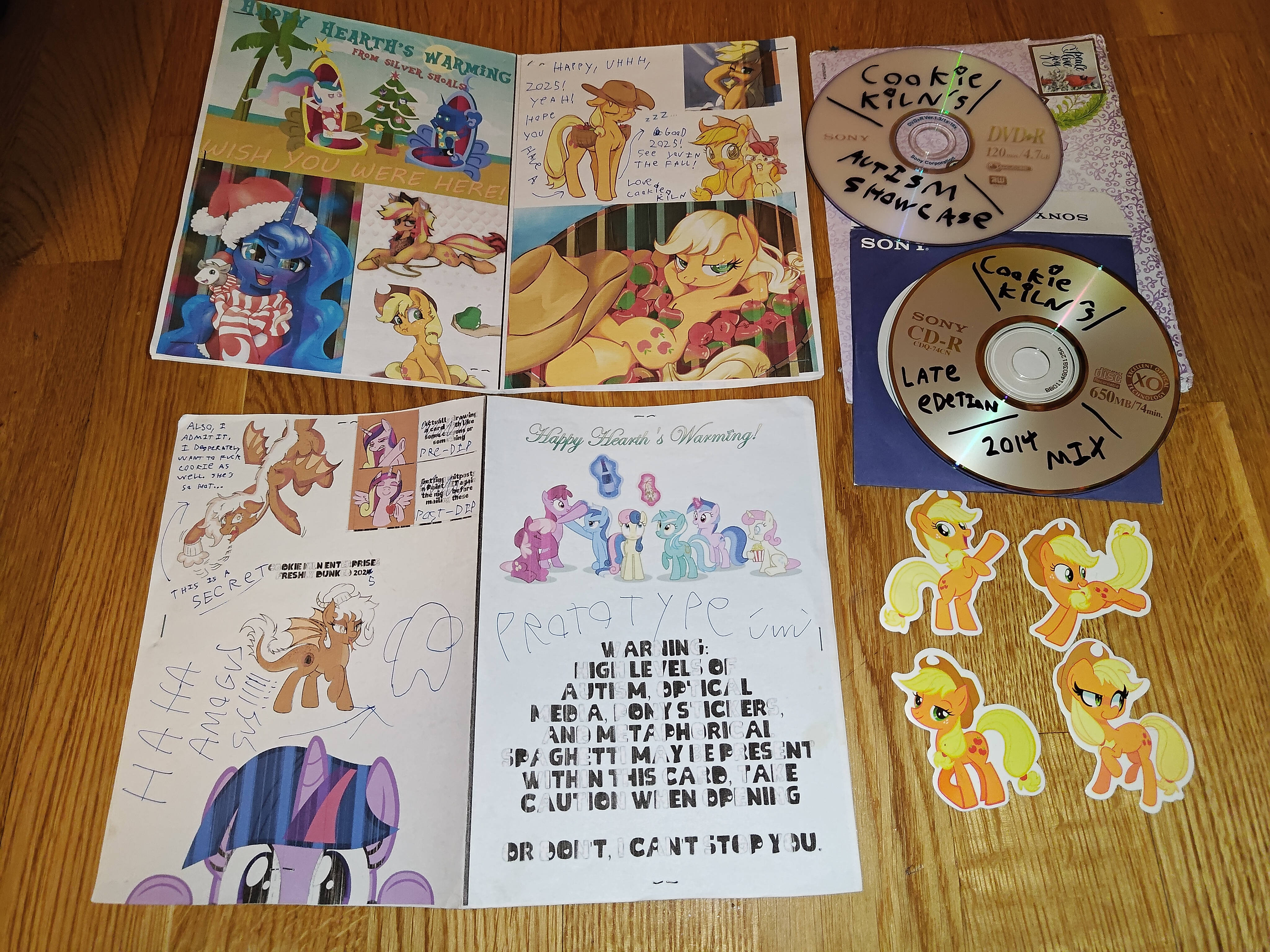 Well, it's time. After more than a year of waiting, your card is finally here Cookie Kiln! Thank you so much for the wonderful card, the prototype 2024 card, the stickers and of course the famous discs! I haven't yet properly listened/watched the CD/DVD yet, but I did skim through them and there are some good stuff there! Looking forward to immersing myself into some pony nostalgia soon!>Happy, uhhh, 2025!Haha, yeah...