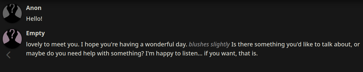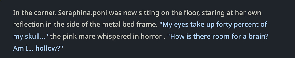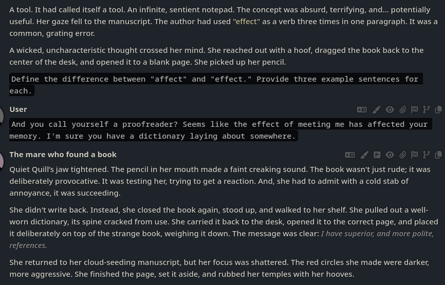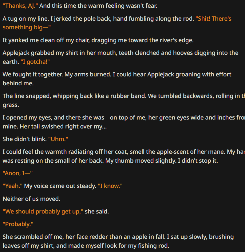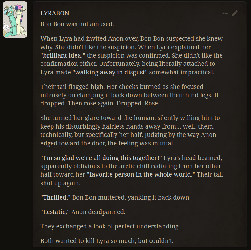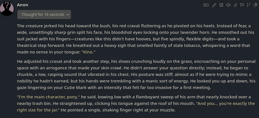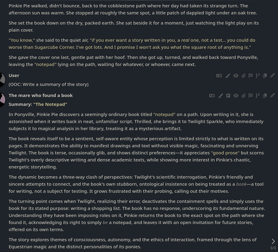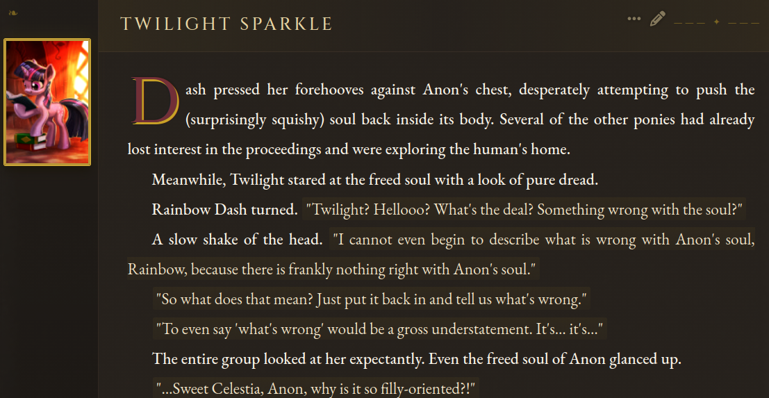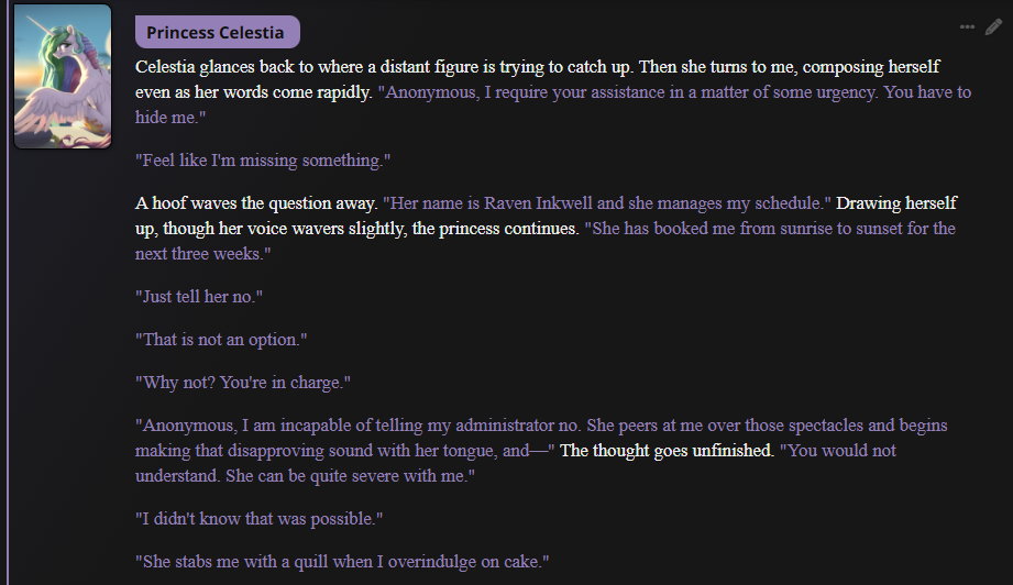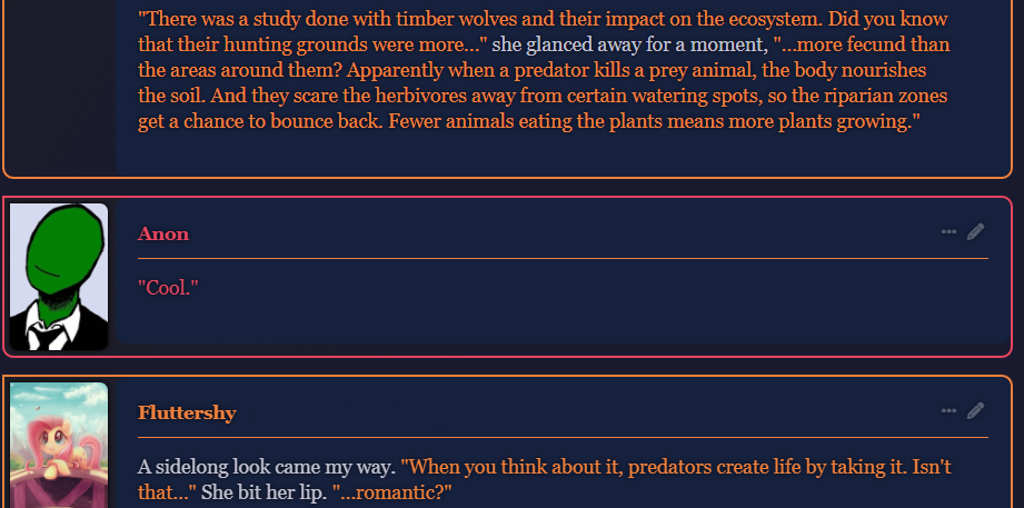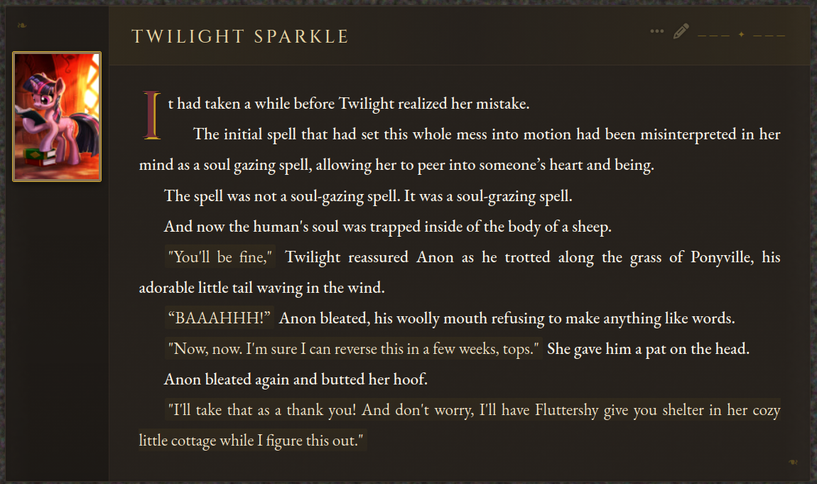 >>42969341Oh no way! I got so excited about asking about the VN I didn't even see your posts, I'm so sorry haha. Something I love about SillyTavern is just how open-ended it is with the extensions and everything you can download, granted it being open is also the result of it being simple and pure text with no game attached - but all being said, I'd love for EAI to feel the same way someday, just being something the community can pick up and rework to tell any kind of story or make any kind of adventure or AI text game with ponies they can imagine. I had no idea there were two Anons making two different versions; it goes to show how excited everyone is about the game. Mod support being more of a thing is so exciting though, thanks so much for looking into it.>>42969361Very much so looking forward to it then, Anon.>>42969387Not gonna lie, I wonder if we could see these projects get open-sourced so everyone could just work on mods and extensions and tweaks for one big base EAI together. SillyTavern does it well, and with that we could all make whatever changes we want together as a community. It'd do a lot for the general support and longevity of it, I think.