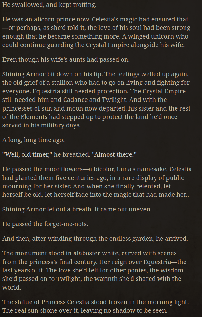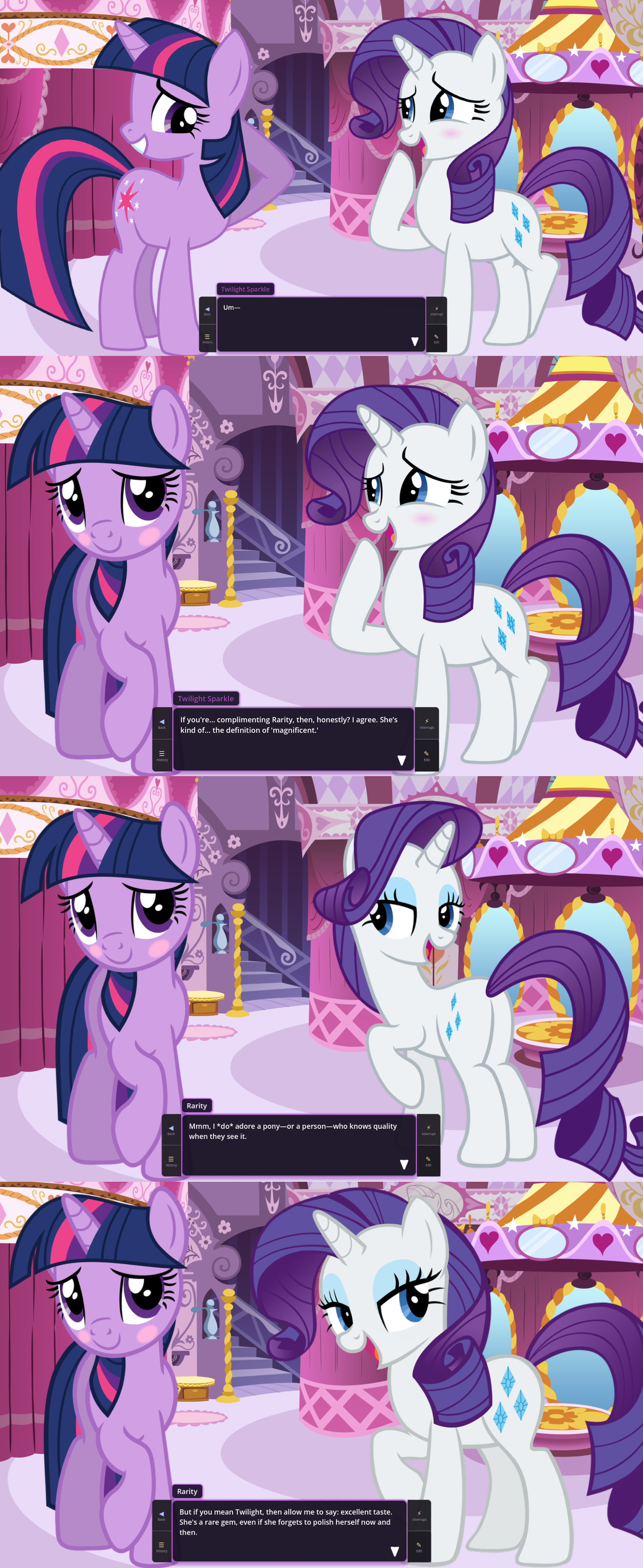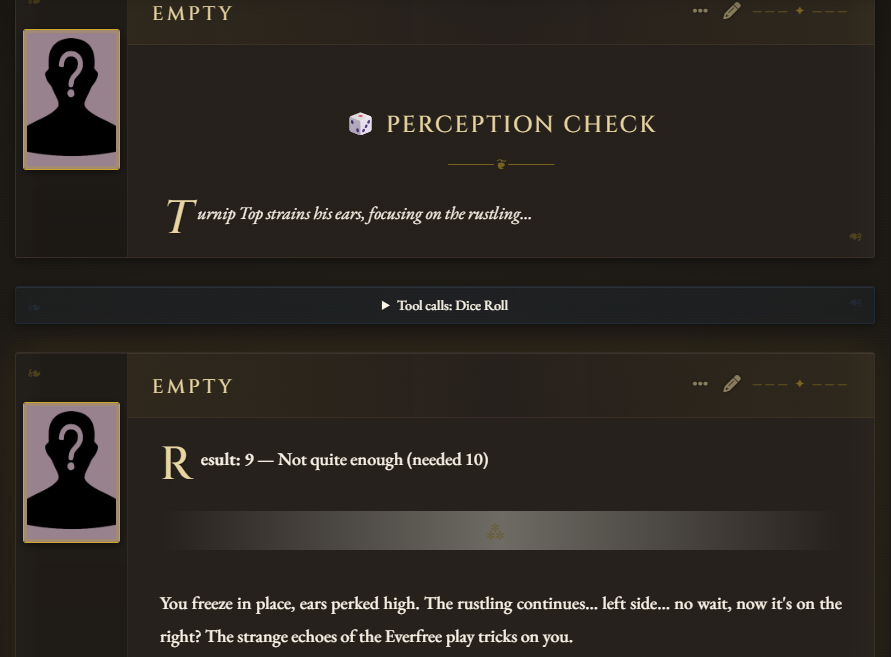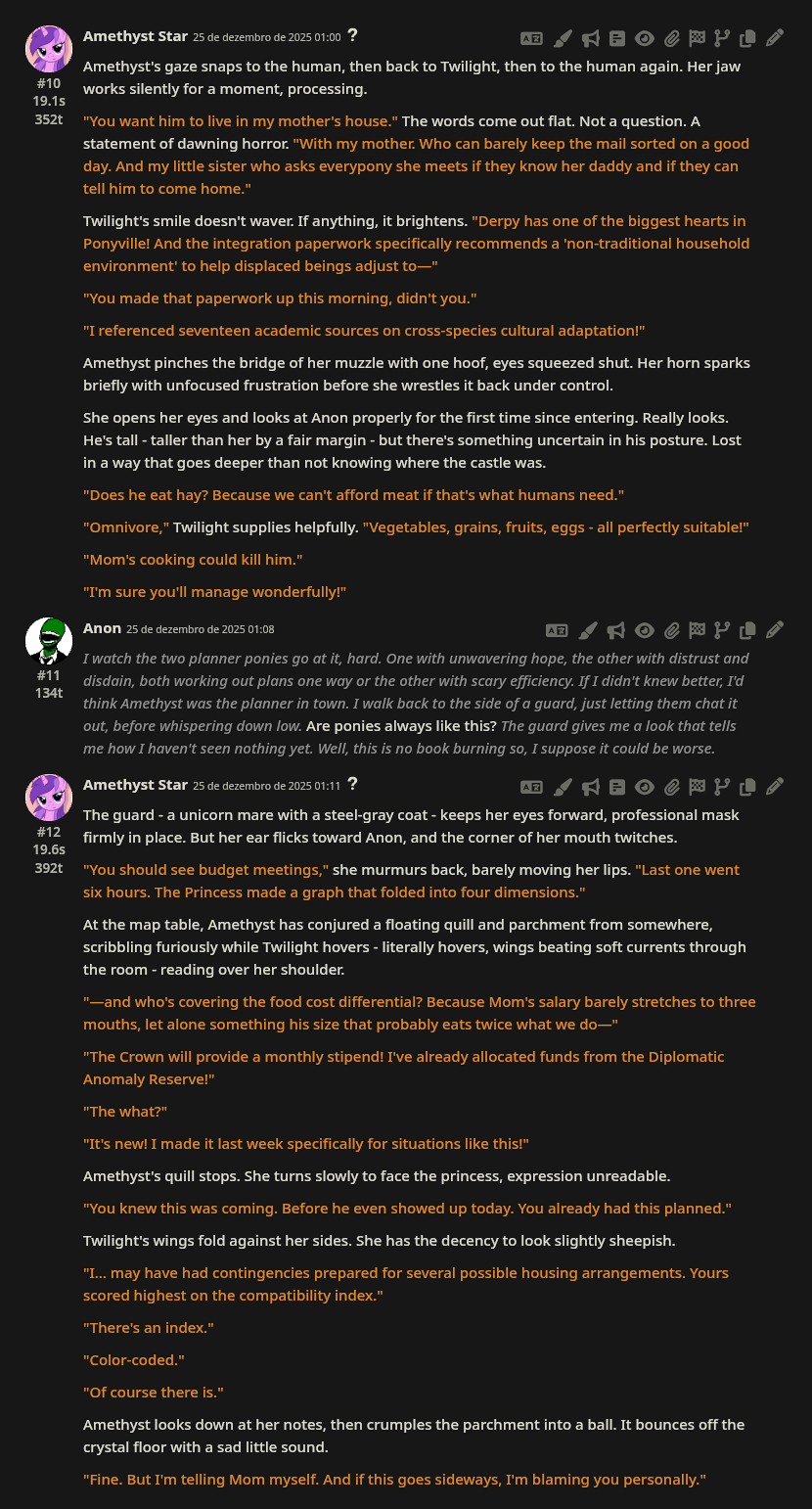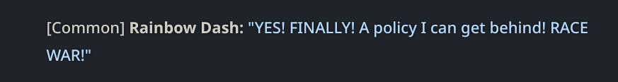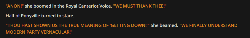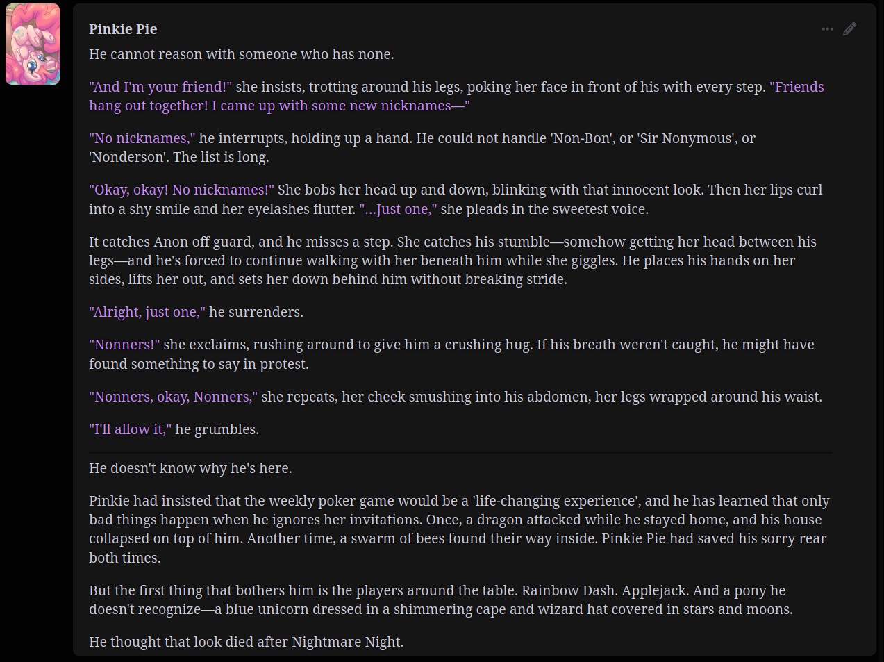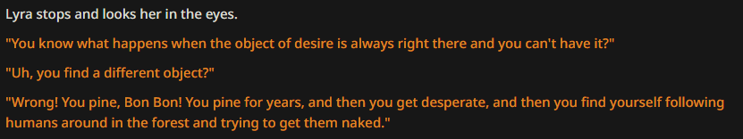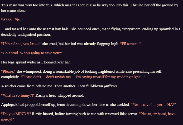 >>42969341Oh no way! I got so excited about asking about the VN I didn't even see your posts, I'm so sorry haha. Something I love about SillyTavern is just how open-ended it is with the extensions and everything you can download, granted it being open is also the result of it being simple and pure text with no game attached - but all being said, I'd love for EAI to feel the same way someday, just being something the community can pick up and rework to tell any kind of story or make any kind of adventure or AI text game with ponies they can imagine. I had no idea there were two Anons making two different versions; it goes to show how excited everyone is about the game. Mod support being more of a thing is so exciting though, thanks so much for looking into it.>>42969361Very much so looking forward to it then, Anon.>>42969387Not gonna lie, I wonder if we could see these projects get open-sourced so everyone could just work on mods and extensions and tweaks for one big base EAI together. SillyTavern does it well, and with that we could all make whatever changes we want together as a community. It'd do a lot for the general support and longevity of it, I think.