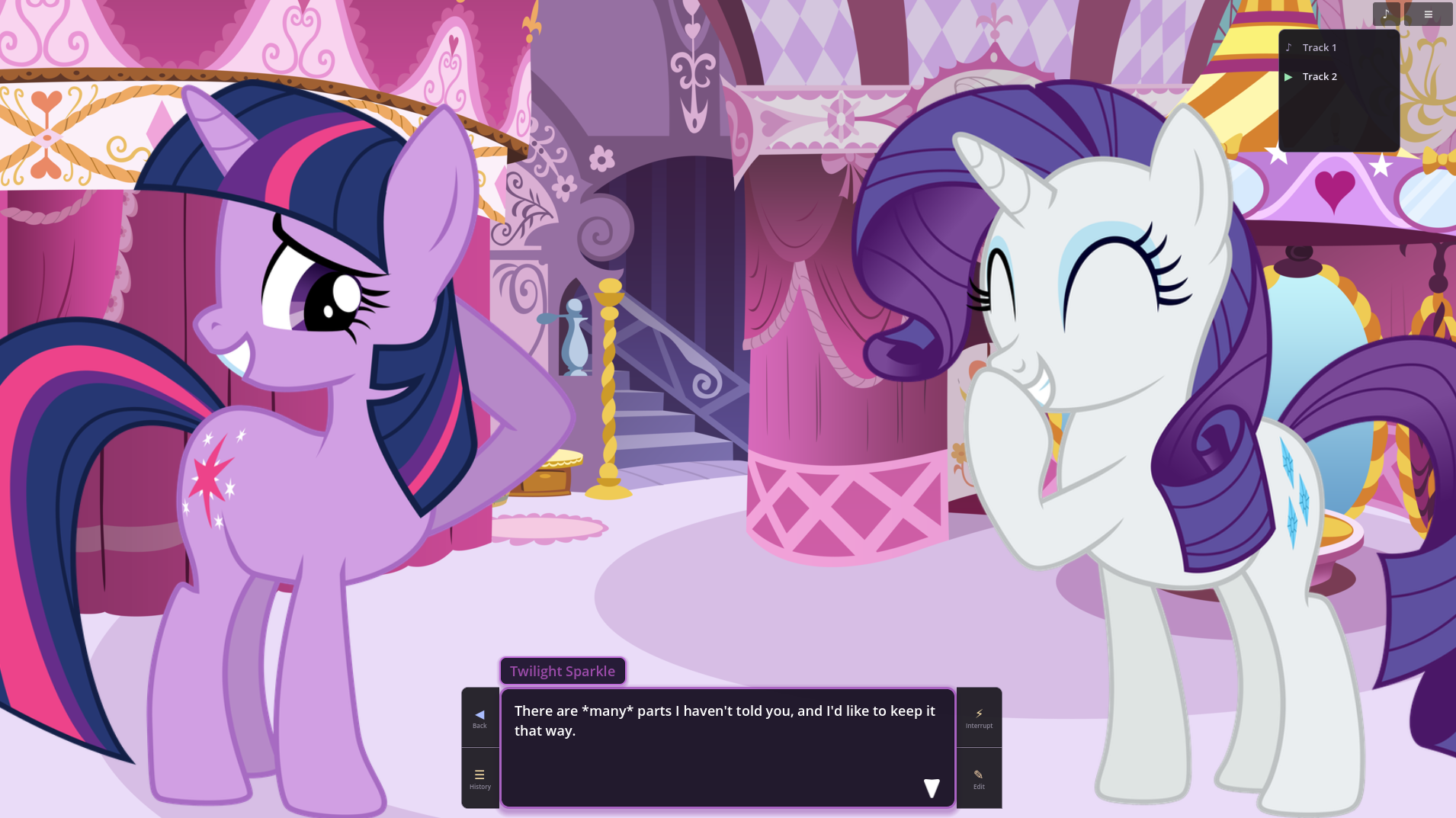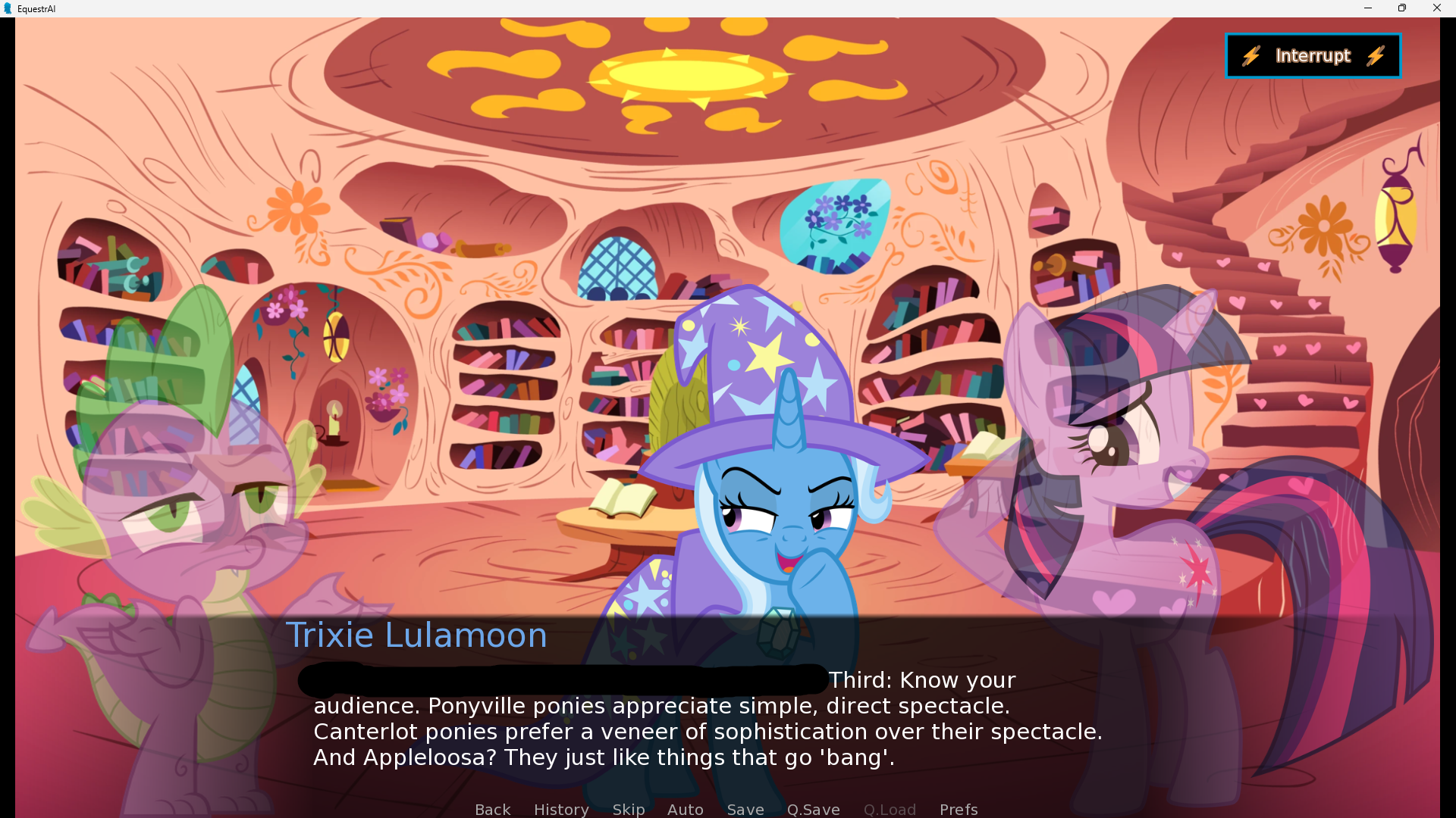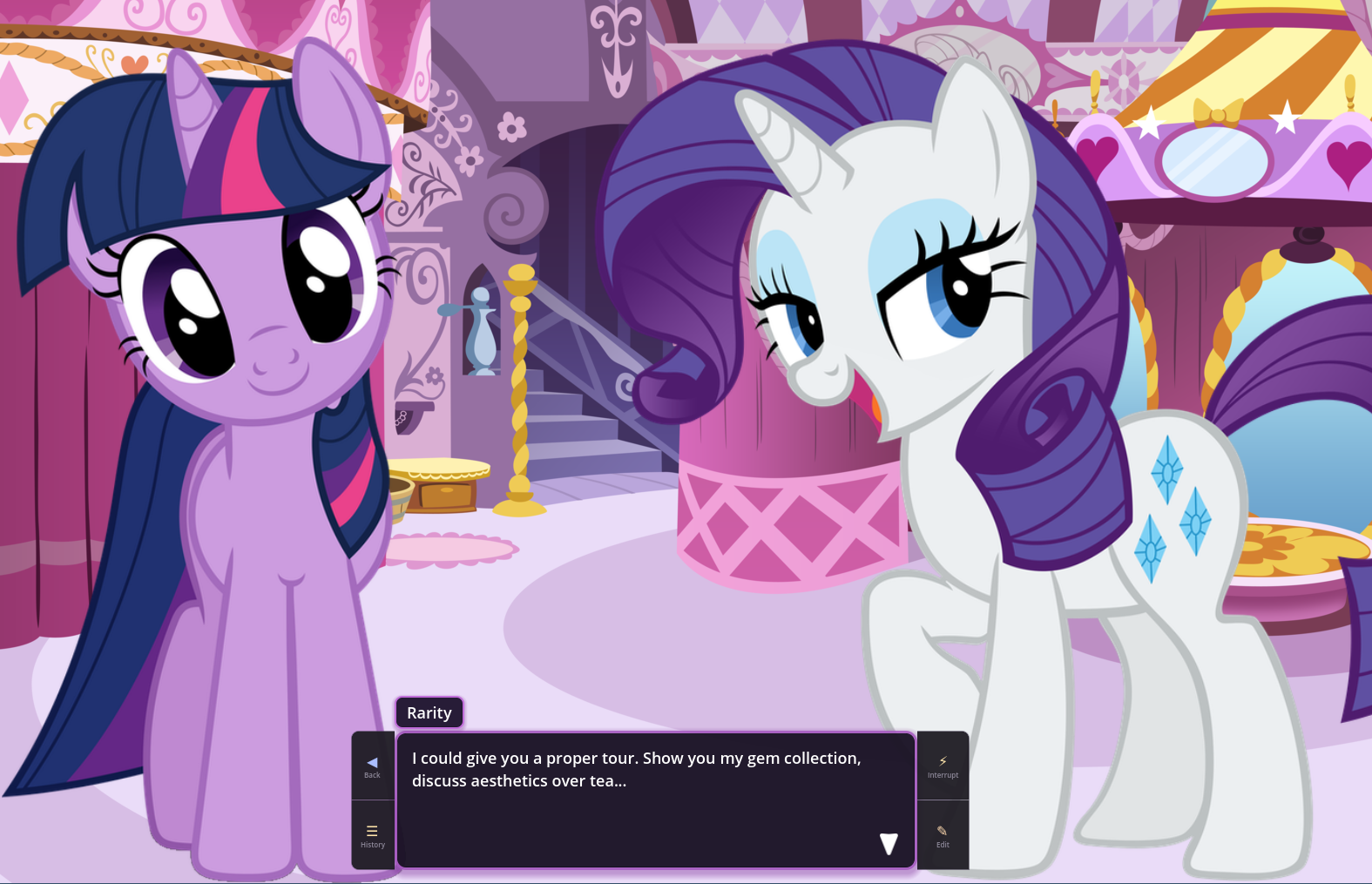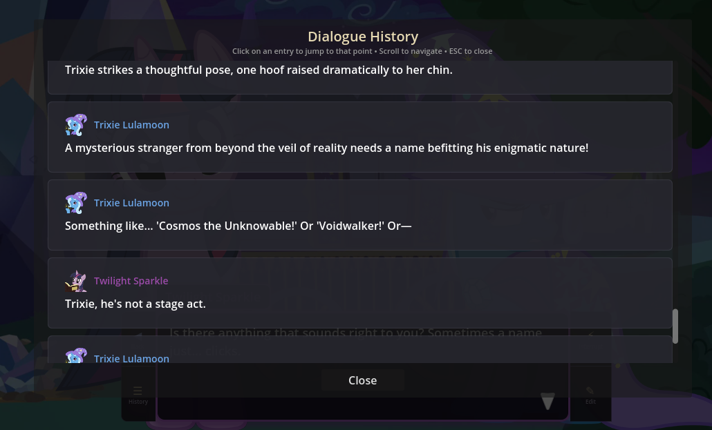 What's up with the VN these days? I saw a while ago someone was working on porting it to Godot, was that the original creator doing that or another guy? Me and my friends are deeply in love with EAI and I've just been really excited for the future of it, is all. There are a few features I really wanna see like options to use a different time system for the days, and more mundane basic areas like streets and places in Ponyville and natural areas outside of it that could just be reused endlessly for generic scenes in common scenery.If a Godot port had mod support baked in, then we could easily just do stuff like that ourselves which sounds super exciting. SillyTavern is extremely open with the wack shit you can do with it and I'd love if EquestrAI could go the same way.