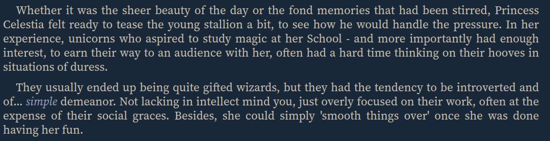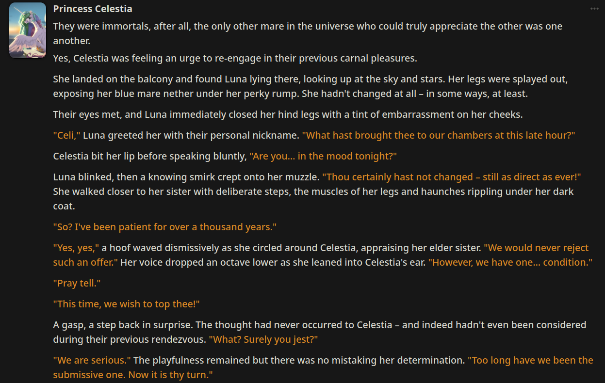 >>42986923>It does seem MLP smart and knowledgeable.This is the most important part imo. The rest is solved though a good preset like everything else.