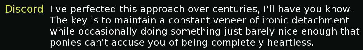 >>42972904Hey Anon... Discord isn't in the VN, how did he appear in your story? That's strange