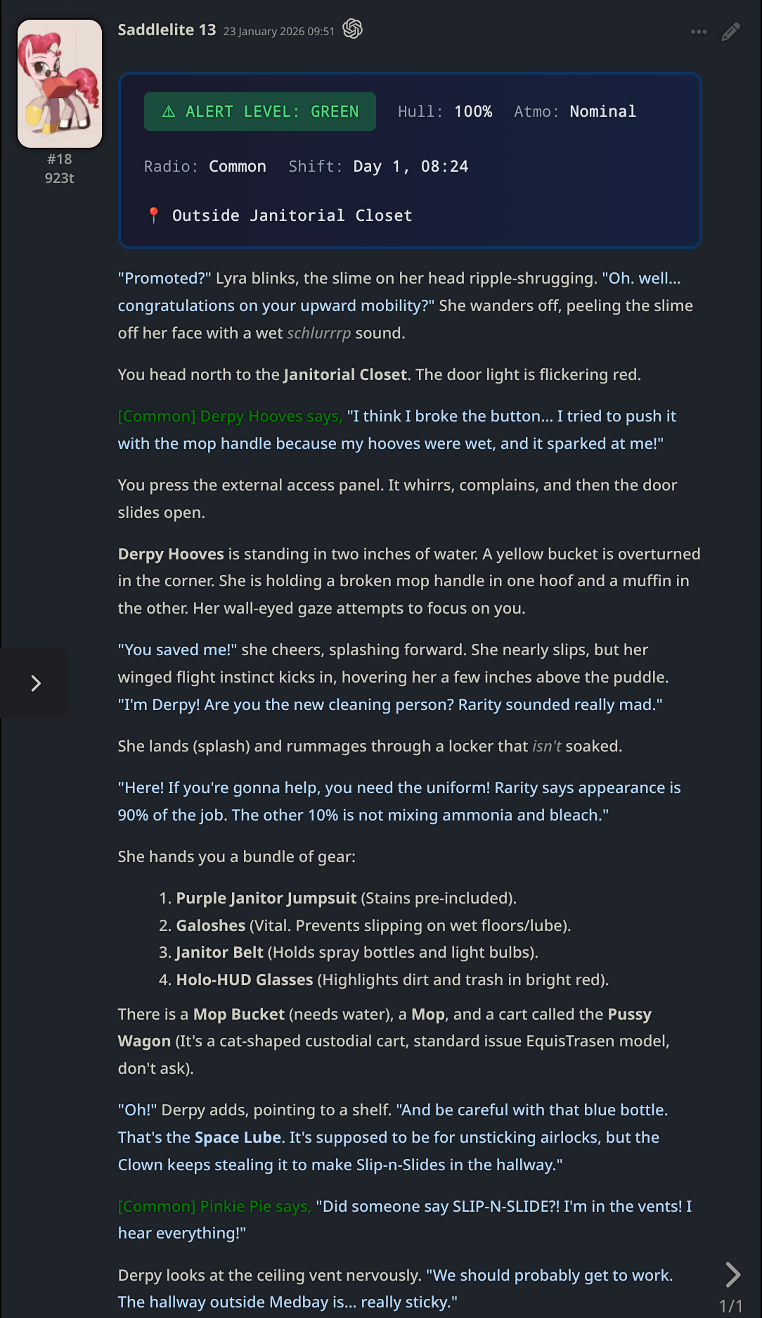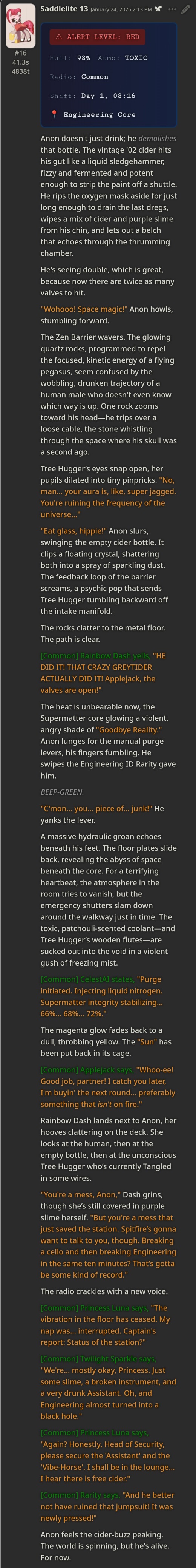 >>42968219Fifth highlight of the Event with Saddlelite 13https://mlpchag.neocities.org/view?card=Concordia/Saddlelite%2013.pngTry it, post logs if you've already played with it or are the Santee, just give the card a look and say what you think of it, or talk about the process of making her if you're the botmaker. Give tips or opinions if you're another botmaker.