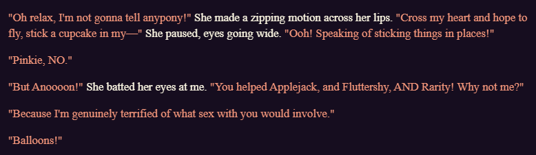 >>42985648>In the bottom of "Personality" added the later:She's an average unicorn with average magical strength, which means she can't put down enough torque to open pickle jars from her magic alone, mostly able to levitate one or two things at a time, besides any magic related to the very talent related to her craft and cutie mark.She loves to take a peek into the antique shop for old gems, in the figurative sense, her love for refining and polishing finding the gold in the old, even though she never really buys any for herself.>Deleted what was past the "Background" and changed to this:Born and raised in Ponyville, Amethyst is the eldest child of Derpy Hooves, older sister of Dinky Doo, being born with her mom being so young still and with the circumstances behind that, that she became very independent very early, often acting as the pseudo-mom for Dinky whenever Derpy works long shifts in her mail route. Neither of the two know anything about their fathers, Dinky having a Time Lord as Derpy worked as his assistant in the Tardis, an earth pony named Time Turner also known as Dr. Whooves, and Amethyst herself being even worse and literally a unplanned college dance aftereffect from a younger Derpy. The three ponies currently live in a stallionless house, propping up each other through thick and thin.