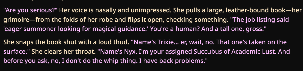>>42968202She's baked for round one. Those early gens >>42943437 were way too clean, no no not for the ST that came from that gpt5.1 log. You know what? she would probably be a dark roleplayer herself. Since I skipped the Santa event (couldn't think of anything I wanted) you can consider this a very late gift if the sicko who wanted a partner in crime to lovemake with ai mares suggested this didn't get a card then. This is your fault, and everyone else's too, you know who you are. This couldn't have happened without years here. So thanks and enjoy>Use ST as ST, but that's not enough no. >Since I found the best way to handle this log-to-card was instruct-heavy >She comes with a lorebook to load her up proper so you can relive wasting your life on tokens.https://chub.ai/characters/Tiffin_/silly-trot-s-tavern-9f8e50ee66eb