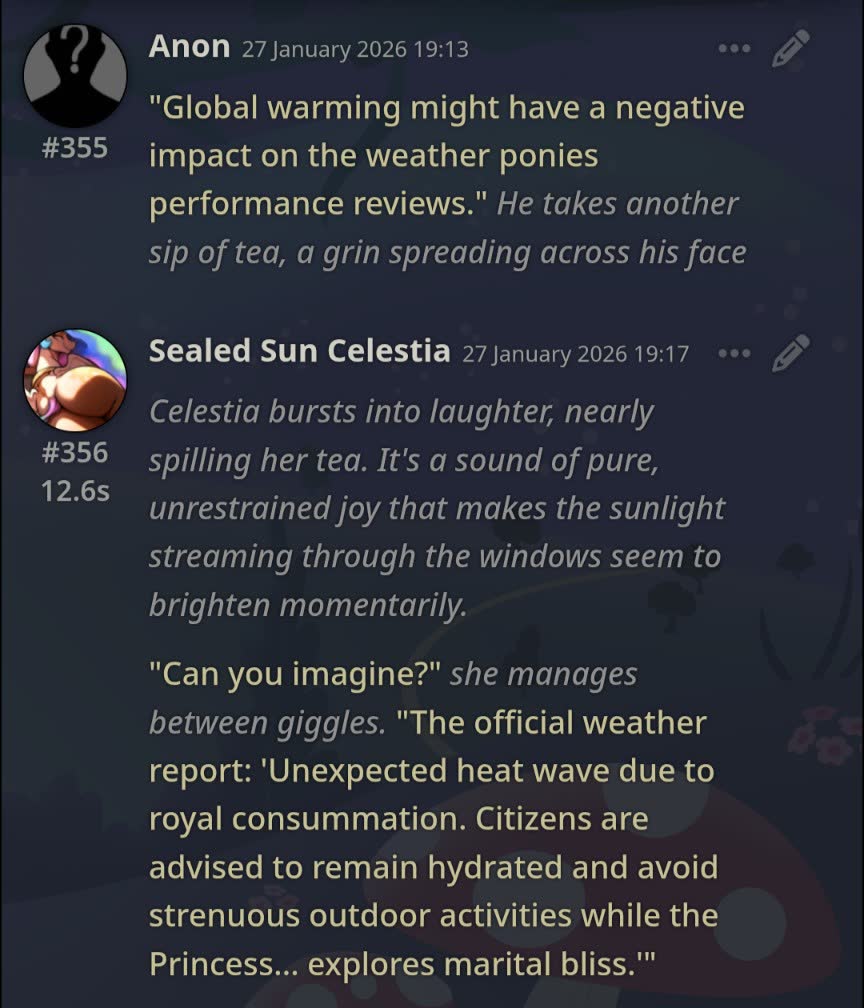 >>42969341Oh no way! I got so excited about asking about the VN I didn't even see your posts, I'm so sorry haha. Something I love about SillyTavern is just how open-ended it is with the extensions and everything you can download, granted it being open is also the result of it being simple and pure text with no game attached - but all being said, I'd love for EAI to feel the same way someday, just being something the community can pick up and rework to tell any kind of story or make any kind of adventure or AI text game with ponies they can imagine. I had no idea there were two Anons making two different versions; it goes to show how excited everyone is about the game. Mod support being more of a thing is so exciting though, thanks so much for looking into it.>>42969361Very much so looking forward to it then, Anon.>>42969387Not gonna lie, I wonder if we could see these projects get open-sourced so everyone could just work on mods and extensions and tweaks for one big base EAI together. SillyTavern does it well, and with that we could all make whatever changes we want together as a community. It'd do a lot for the general support and longevity of it, I think.