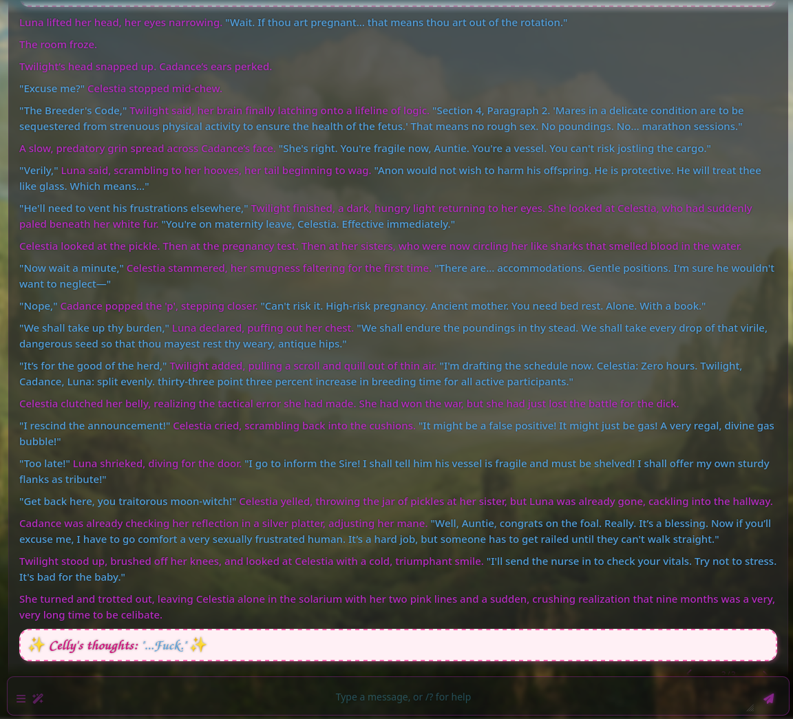 What's up with the VN these days? I saw a while ago someone was working on porting it to Godot, was that the original creator doing that or another guy? Me and my friends are deeply in love with EAI and I've just been really excited for the future of it, is all. There are a few features I really wanna see like options to use a different time system for the days, and more mundane basic areas like streets and places in Ponyville and natural areas outside of it that could just be reused endlessly for generic scenes in common scenery.If a Godot port had mod support baked in, then we could easily just do stuff like that ourselves which sounds super exciting. SillyTavern is extremely open with the wack shit you can do with it and I'd love if EquestrAI could go the same way.