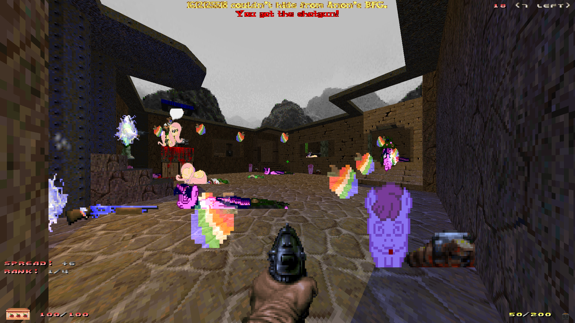 >>43007780>HudCompanionLooks good. Are these sprites from the desktop ponies? I used a stallion sprite from desktop ponies as reference for the mini shining armor rocketlauncher wep item but i had to simplify it a lot because ofc.>The mugbox is pretty small, can you expand it?I believe i can do that but i need to check if it would work on vanilla. I want everything that can be used on dos vanilla to be compatible with vanilla. mulpgizmos items aren't compatible yet because sprite replacements needs dehacked on vanilla and i will only do that work once i'm done with it.>Are you thinkingSometimes.>cutting the front animation frames of the player textures you already have?I was thinking about for example moving the doomguy mugshot a little to the topleft, cropping his head a little and keeping a pony head (cropped from the mlponline sprites, the source for the skin pony sprites) on the bottom right. Haven't done anything yet, just ideas.>separate source sprites with new animations?Maybe, i will see.>Don't you also play with the fullscreen display type?I usually use the normal hud but i switch to the other one when i want to take prints or see how it looks like with the items etc. Sometimes i forget to change huds back.>And for the back where it isn't visible? A badge/cape or something?I initially thought about ribbows but it would be much better and more effective to teamcolor the rider's back. Should be enough, probably.>>43007794>the SSG is cringe and for nerds.SSG is the best thing ever, except when i miss my shots.>never knew about it before and it ticked almost all my boxesIt's niche.>no ponies though yetWas thinking about ponifying it but i should focus on finishing the stuff i started first. I have decided to rename truecolor to mulpgizmosvx_zan.wad for the next version because i have changed the items light colors (e.g. the apple now has a red light instead of blue). I changed the bfg ball and explosion light colors as well. Oh, if you want to try your hands on the qcde voxels, you can paint them with magicavoxel. I try to keep the silhouette for the replacements but you don't need to follow that rule.>that OST and those coversThose are from the doom neondm wad for zandronum. It is meant to be played with freelook, jump and custom weps (eonweps).>We were both in an EU server and had some pretty competitive duels.The hitreg delay is pretty funny though. I've heard Q-zan is currently being debased into zandro so we might not need a fork for that wad anymore, or the net enhancements.>Bulk BicepsNot sure if mlponline got Bulk Biceps, good luck.