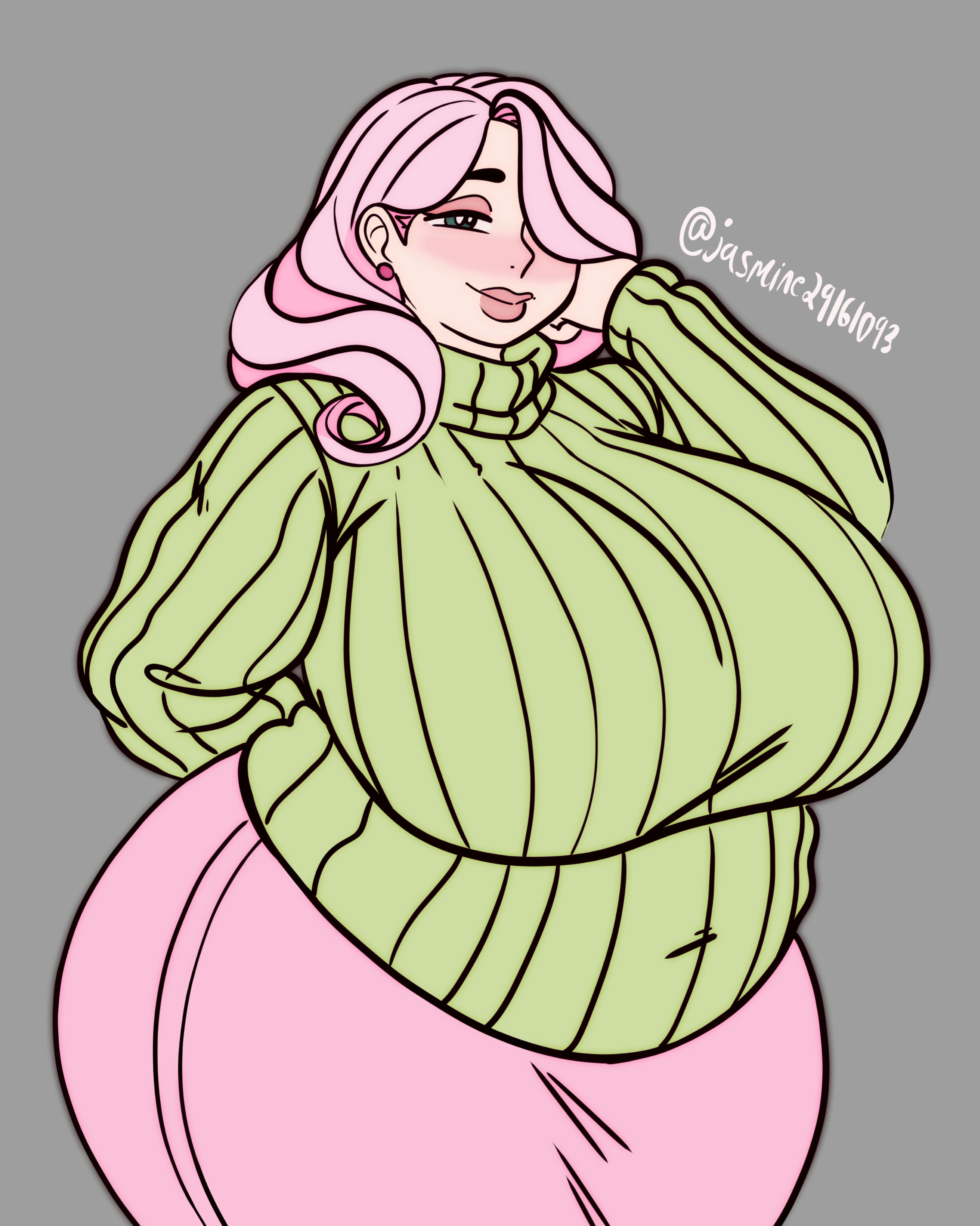 This was a normal sized sweater before she stretched it around those melons.