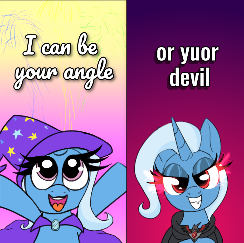 >>42984767Trixie is just so Writefaggable it's hard to resist the urge. My most recent idea was if Sci-Twi suddenly appeared in Equesrtia, who would she gravitate to, Twilight or Trixie? It's pretty obvious that she'd quickly become best friends with Trixie. The only real conflict might be over whether she might displace Starlight as her best friend.