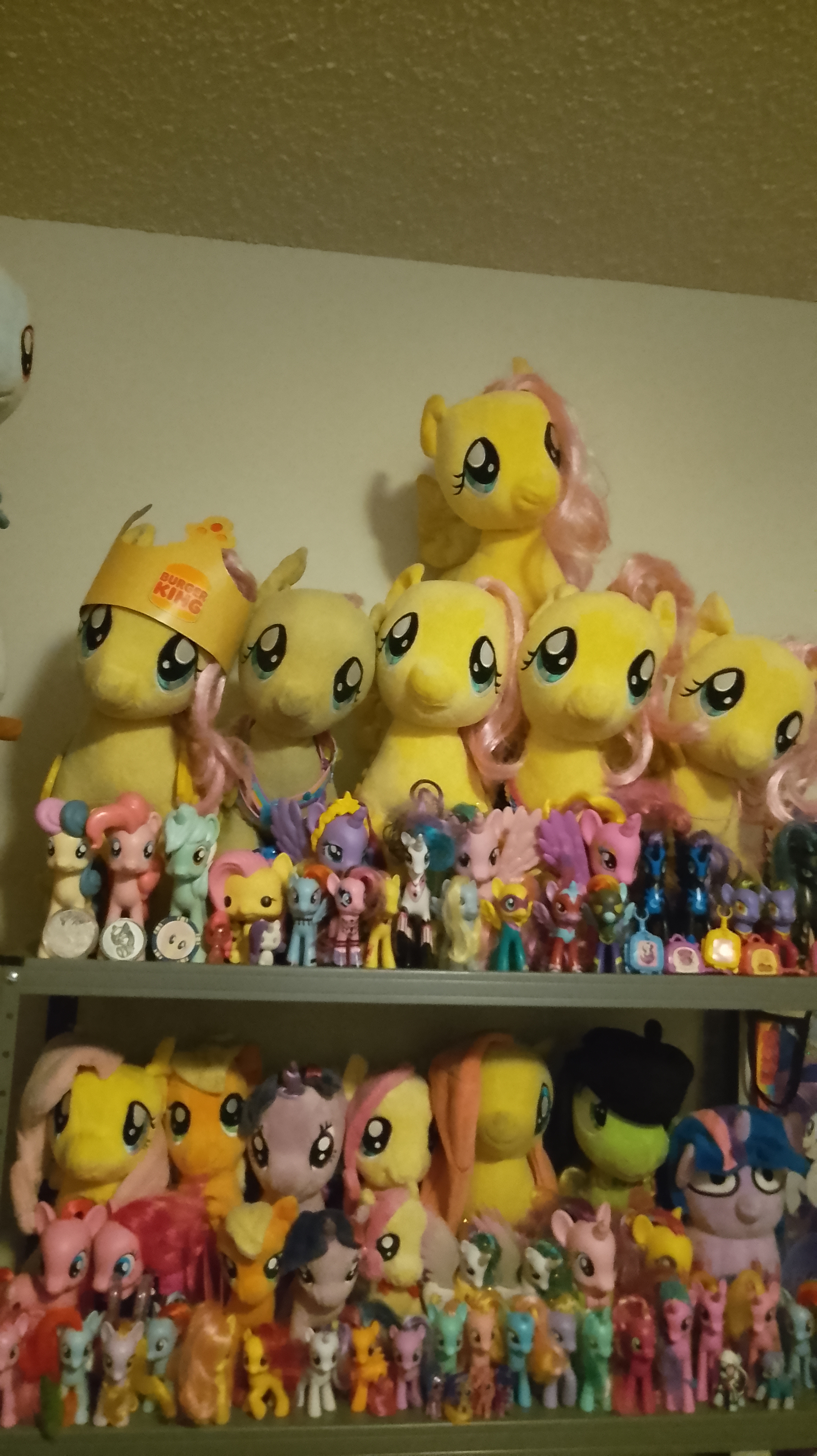 Not counting a couple of plushies that are too big to fit, here are all of my Fluttershys (and a few Poseys, the G1 proto-Fluttershy)