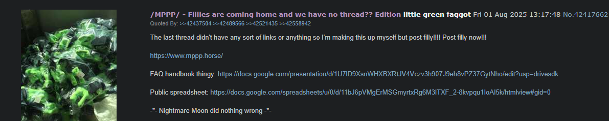 "Happy Valentine's Day" EditionPost and talks about pony merchandise, official or not.Discuss plushies, figures, clothes, books, pins and more! And new ways to add ponies to our life!>is selling your products here allowed?Of course! Absolutely allowed.>can I talk or post here about my crafting even if what I do isn't for sale?Yes! We accept merch in all its forms.>where can I find the old threads?They are all in the Links Index Pastebin, after the links section.>where can I find the video/collage of the anniversaries?They are at the bottom of the Link Index Pastebin, after the archived threads section.=== Links Index Pastebin ===>https://pastebin.com/UhL9KNZFHere is a pastebin that contains all the links posted and discussed here. Mainly pony shops, but also rare/little known products, figuremaker contacts, among other things!=== Main Links ===+ List of Active Plushmakers: https://docs.google.com/spreadsheets/d/1sUvaUhFKC37T7ilpriTX82M1_p4a5XR5DUaWlptCSz0/edit#gid=314530747+ List of Public Plushie Patterns: https://docs.google.com/spreadsheets/d/1piwF9h_rXBmWkcHXxtr54drnD1eKJfiWh66x8nu_CQw/edit#gid=0+ OP Plush Pattern (with instructions!): mares.horse/p/plush.html+ Verity Plush Pattern (with instructions!): files.catbox.moe/4qd3za.pdf+ /mlp/ Patches/Stickers/Desk Flags: neighsayerpatches.com+ 4cc Jerseys, Pins: etsy.com/shop/zemming+ Wallets: https://shop.mares.horse/+ HorsePussy Books: amazon.com/gp/product/1660812933/ & amazon.com/gp/product/B086PLNPYF/Feel free to suggest links about pony stuff to be added here and in the pastebin!Previous Thread: >>42961245