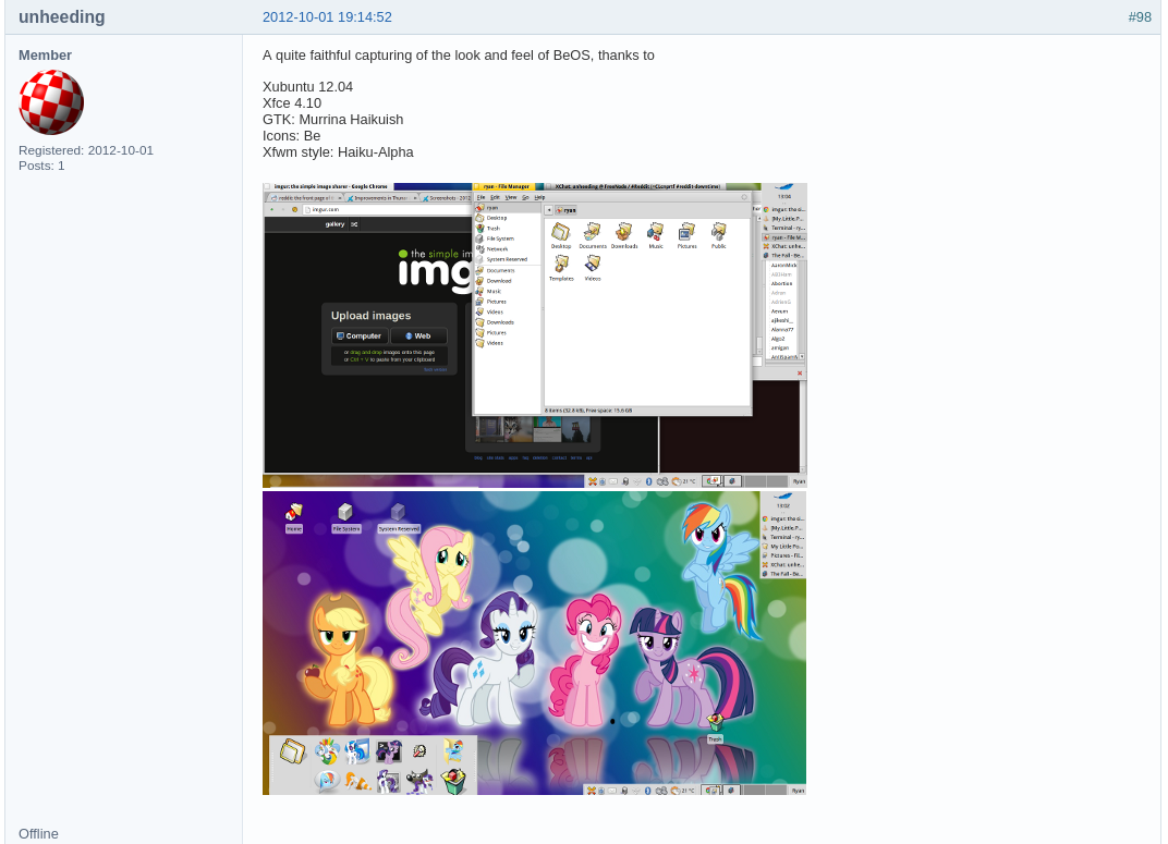 >>42991230>>42991279>>42991001It's XFCE themed to be like BeOS/Haiku.https://forum.xfce.org/viewtopic.php?id=6702&p=4Pretty bizarre forum as there are people using screenfetch already back in 2010, way ahead of the reddit linux trend and in general people having desktop threads since 2006. It is weird to see it so early on, at least for me as I always felt it was a trend made up around 2012+. Anyhow, most screenshots are dead, however there are a few ones in 2007 threads that are still hosted on photobucket.
