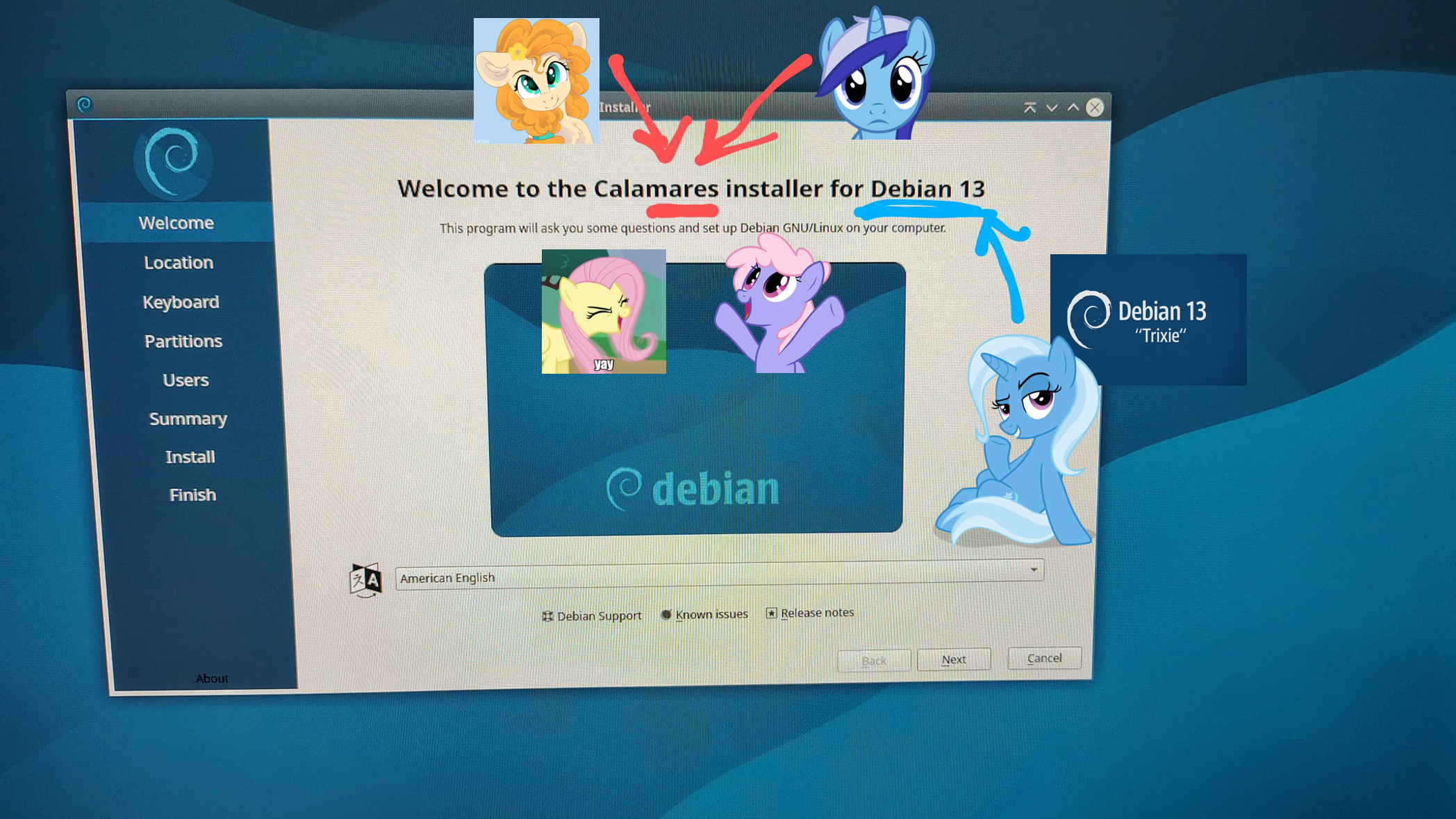 Thank you for the kind sentiment everypony but I installed gentoo, just compiling programs now (Konsole and Librewolf-bin is all I have so far)No encryption but it's a desktop anyways whats the usecase. Sour Grape, which mare is that? I haven't heard of her
