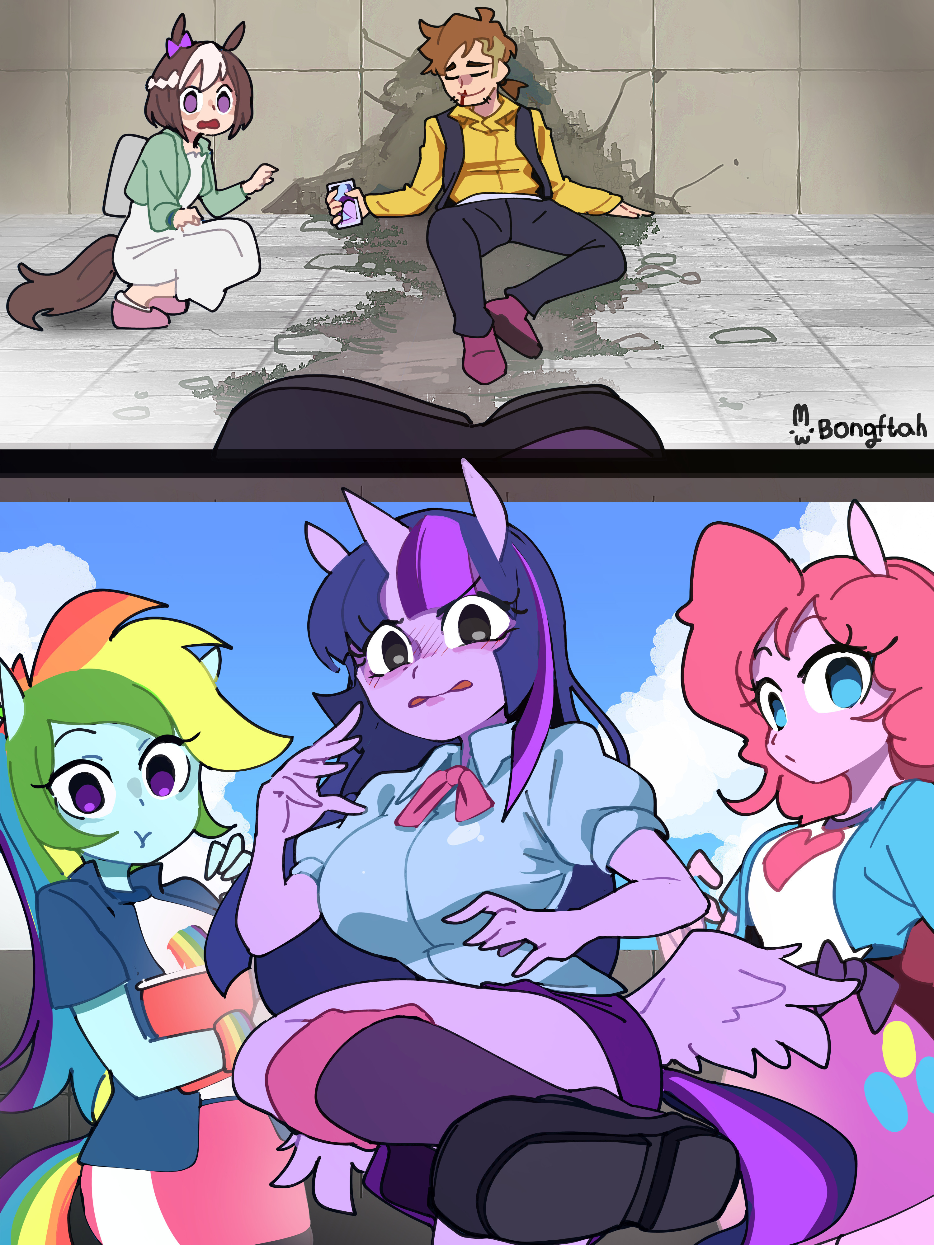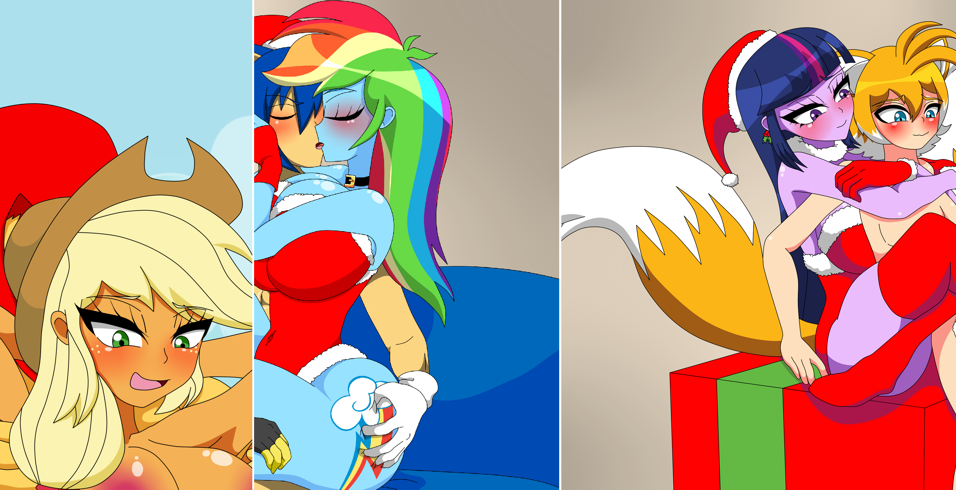 >>43007684As I reeled from the shock of seeing all of this, I still managed a polite "Hello everyone".>Everyone smiled and replied in unison "Hello Anonymous."Nervously I said, trying to reassure myself "Alright, due diligence is always first. Fluttershy are you okay?">Fluttershy smiled and said "Yes I'm okay Anon. Thank you for asking.">Sweetie Belle couldn't take it and exclaimed in frustration "Are you kidding me?! Applejack and Rarity look like this and you go talk to Fluttershy?"I calmly responded "Absolutely. The last time I saw Fluttershy she was bleeding, so checking on her first is absolutely the correct behavior here.""That said, It's also true Applejack and Rarity look so appealing that my words are failing me.">Rarity giggled at that and I started slowly walking towards her and Applejack.>12 feet away.>It was like my feet were moving on their own.>10 feet.>Applejack was inviting me with her hands and her mouth.>8 Feet.>Rarity was inviting me to hit her target.>6 feet.>I could FEEL the other girls urging me on!>4 feet.>The cheerleaders kept humming that damn tune.>2 feet.>One hand went out towards Applejack and the other to Rarity.