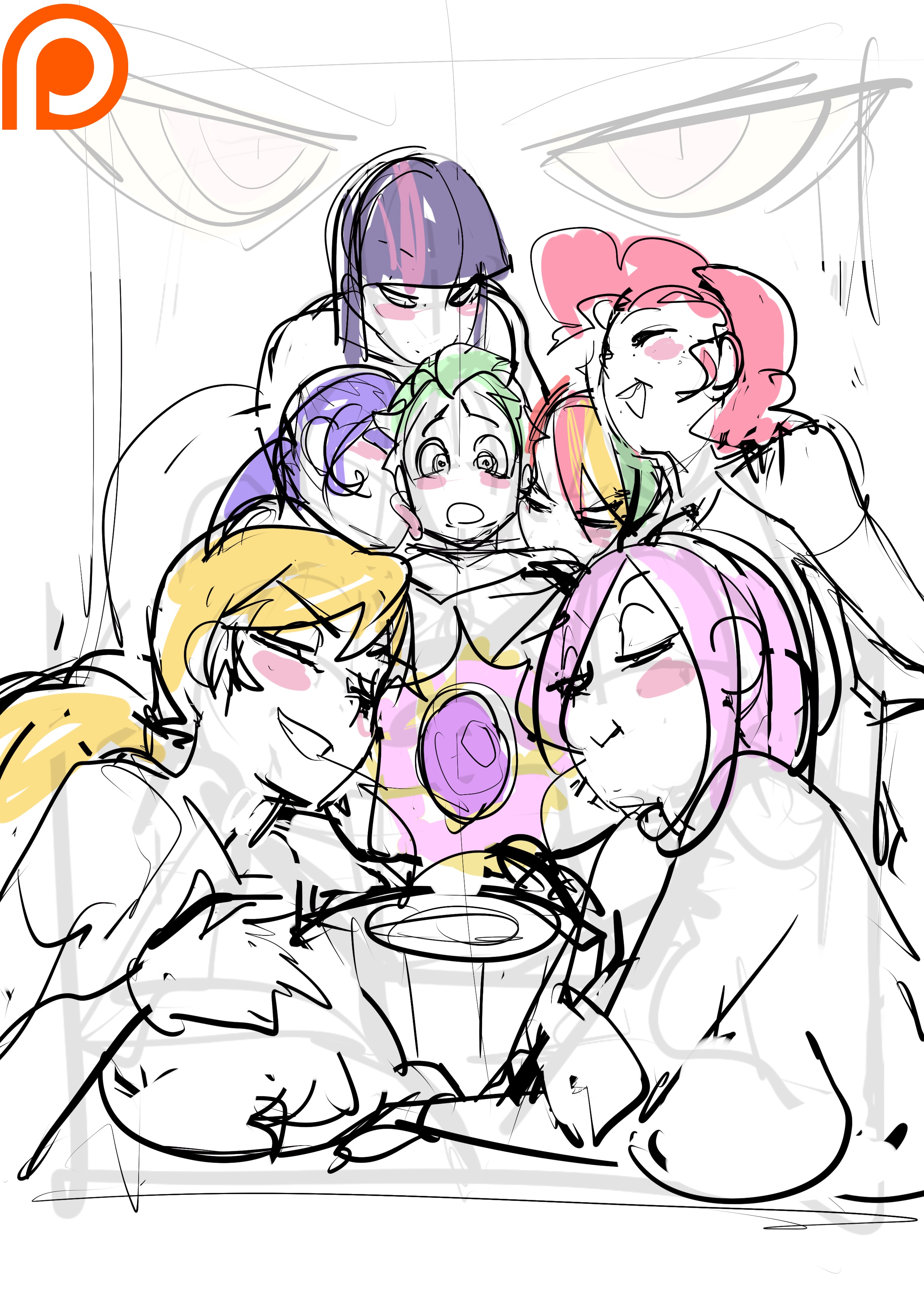 >>43007676>The girls lined up as my Queen explained.>"My King, it's time for you to enjoy a fun game we came up with. You'll recall last Tuesday you wound up between Rainbow and I. The next day you offered Fluttershy something you called 'Ladies choice' and we ALL liked that idea. So we've applied some 'Boyfriend's choice' into this game.">"As before one girlfriend will be in front of you and one girlfriend will be behind you. They will both be VERY close as you should well expect.">"Each girl has chosen a theme and a singular action based ON that theme. One action if they are in front of you, and another if they are behind you.">"The girls know only their own actions with the exception of me, since someone had to keep you from combinations that were too.. excessive.">"Still, some combinations will be spicier than others.">"Which brings us to the Boyfriend's choice. YOU, my King, will choose who is in front of you and who is in back of you. And afterwards, the Pussy Wagon waits for you if you can no longer wait.">"Now make your choice please.""First please let me say I'm amazed by the thought you've all put into this. Now last time as I recall, the aggressive Rainbow kept pinching my butt which caused me to thrust up into my Queen, who is taller than me.">Rainbow and my Queen both said in unison "Good times!" with big smiles."So by that logic, I should choose the smaller senpai for in front and the unaggressive Fluttershy for behind me.">Both girls smiled."So that's obviously a trap." I continued.>Fluttershy and senpai both gave a disappointed "Aww.""So I may well be best off with a random choice." "I'll say Applejack for in front of me and Rarity for behind me.>My Queen asked "Is that your final choice?""Yes. Final choice." I said.>My Queen informed me "Very well. Our hard working farmgirl Applejack has chosen the theme of 'Hands on' and when she is in front of you, she gets to put one hand behind her to see what she can get her hands on.">A chorus of approving "OOooooohhs" went up from the girls.>My Queen continued "Our stylish seamstress Rarity has chosen the theme of 'Clothing obsessed' and when she is behind you she gets to play with your waistband.">The girls didn't understand this one until Rarity mimed putting a thumb through both sides of my shorts and pulling down.>Holy crap. But there was an issue."Umm, wait a moment please.">To my surprise, all of the girls said "No." and started pushing me towards Applejack!