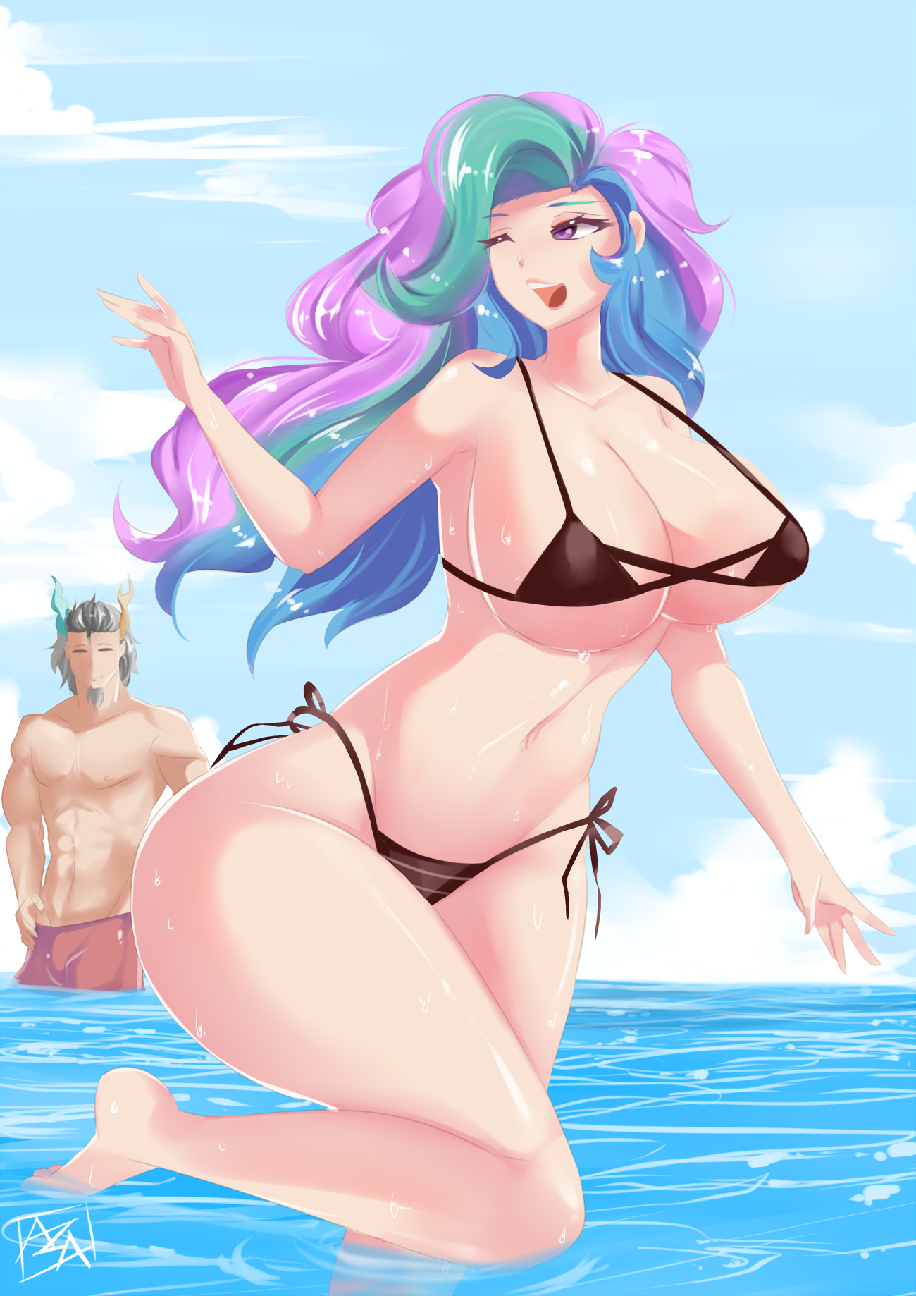 >>43067175>>43067523Honestly I would like to continue it, at least this once, mostly to vent my frustration at the lack of human(oid) Dislulestia art in a creative manner. So here goes, I guess:Rather than a direct answer, the spirit of chaos teleported Celestia’s behind them, then jumped at the two sisters pinning them down above the soft sheets. The princesses sticked out their tongues, clearly expecting a kiss. Discord wrapped his own around both of theirs, pulling them both into a triple kiss. It was long and slow exchange of passion. When the two sisters opened their eyes the draconequus had already repositioned himself, pushing the two sisters between his manhood.>C: “Can’t decide between us?”>D: “Decide? Now why would I have to do that?”>L: “W-what is…”Both Celestia and Luna both shuddered at the sense of their lower holes, both of them, being touched.>D: “2 serpentine parts below the bell, 4 extra penises.”>L: “W-w-w-wait, we haven’t even cleaned our anAAAA-“>C: “OOOOOOHHH!!! HOTHOTHOTHOTHOT!!!”With the a single finger tap, the sisters felt an extreme mix of pain and pleasure, as the draconequus magic transformed the contest bowels into a thick aphrodisiac gel.>D: “There, problem solved”>C: “OoOoOo, that was almost as bad as that time I tried the enema Twilight made”>L: “Never… do… that… again…”>D: “Sorry.”Discord plunged his serpentine cocks into the holes of Celestia and Luna, both gaping from the aphrodisiac while his fifth, bovine member, rubbed the clits of the two sisters, still tightly holding each other after the shock. The alicorns couldn’t stop cumming. Not that the draconequus wasn’t feeling it though.>D: “OOOH, so good… As an apology… By my power… as lord of chaos… I pronounce you two… wives...”>L: “AAAhhh… Celestia…”>C: “Luna…”