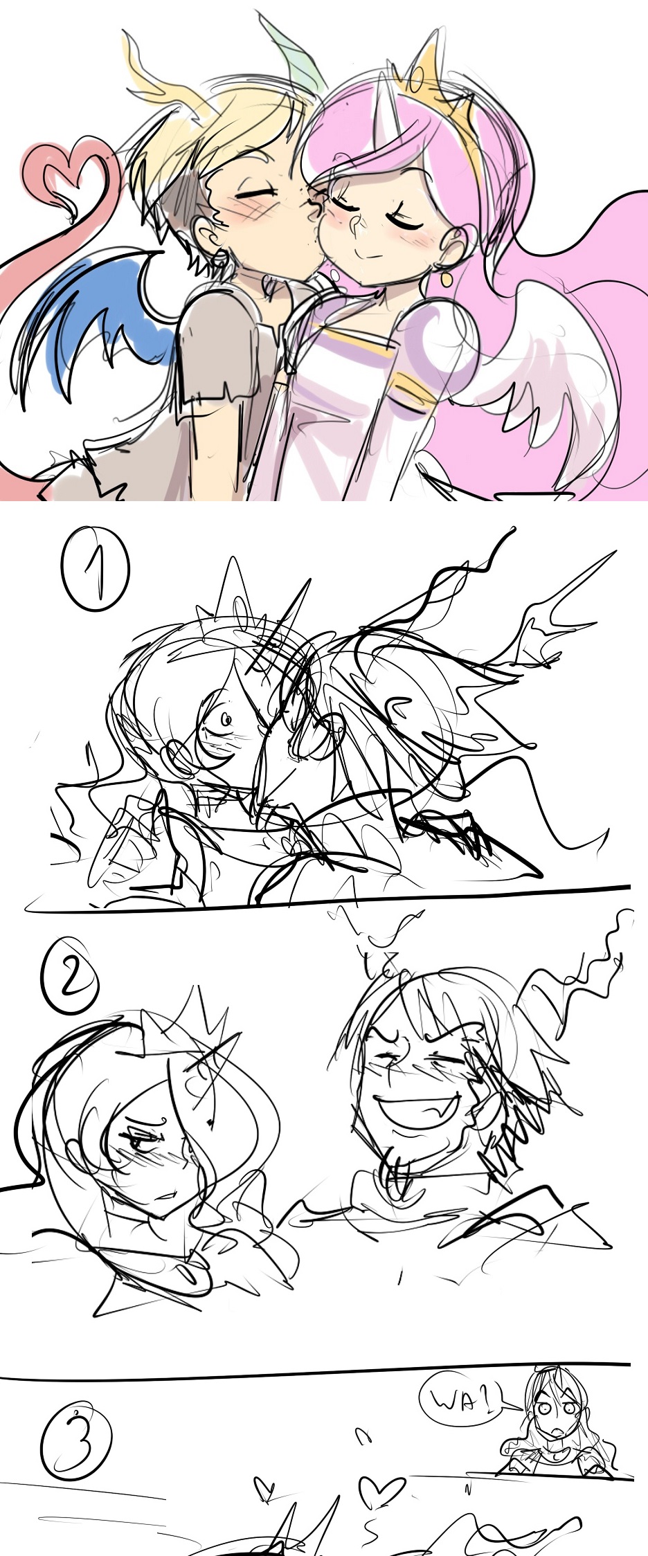 >>43066373The two locked eyes with each other. The day they first met still felt like yesterday: The day a little spirit pranked away the monsters surrounding the two lost and hurt little sisters.>C: “What happened to us?”>D: “Oh, easy: All living alicorns were cursed by the Shadows, a civil war broke out in Skyros, Star Swirl the Bearded Prick made you his students and part of the snobby unicorn nobility that forbid you from interacting with me, I felt betrayed and got frustrated with pony society, my pranks and aesop-style trickery got increasingly extreme and->C: “Discord.”>D: “… Ruined the mood, huh? Sorry.”Discord was about to finger tap himself away, when he felt princess Celestia’s grab.>C: “N-No, it’s ok, stay.”He could see the princess caressing her cheek, the same one he had once kissed as a dare.>D: “Hey, Cay-Cay?”>C: “Wha-“Celestia could feel the draconequus long tongue, wrapping around hers, slowly caressing it. The shock quickly melted away, but as soon as she had gone completely numb, the kiss broke away.>D: “Heheheh, knew it’d taste like cake.”>C: ”Tsk, you fucking tease.”As soon as they locked eyes again they immediately went for each other’s lips. The party was fun (once ruined), but now it was time for another one. A party of two… or so they thought.