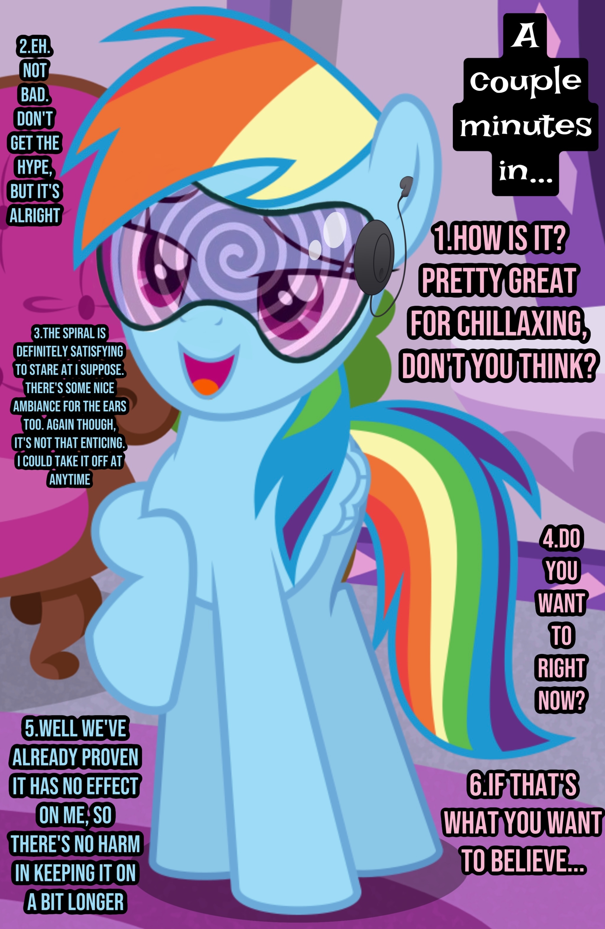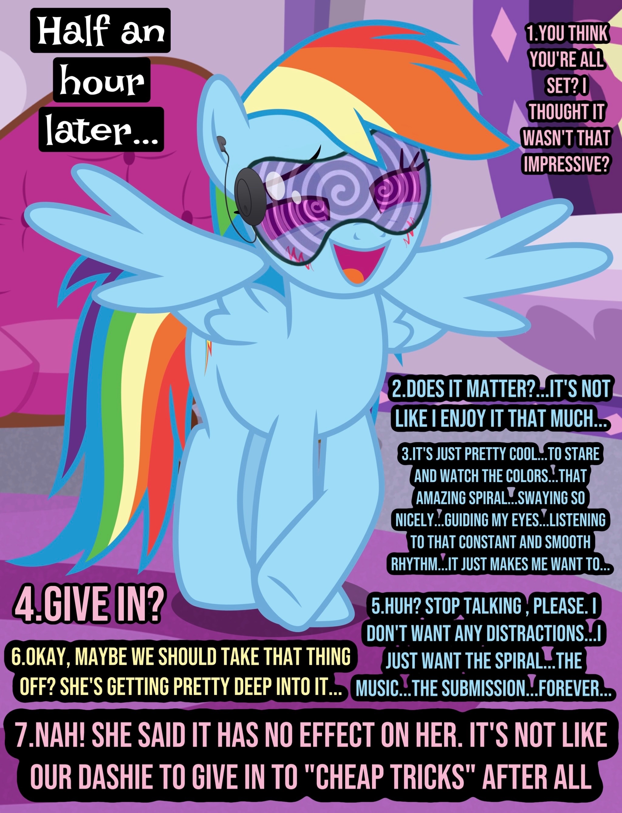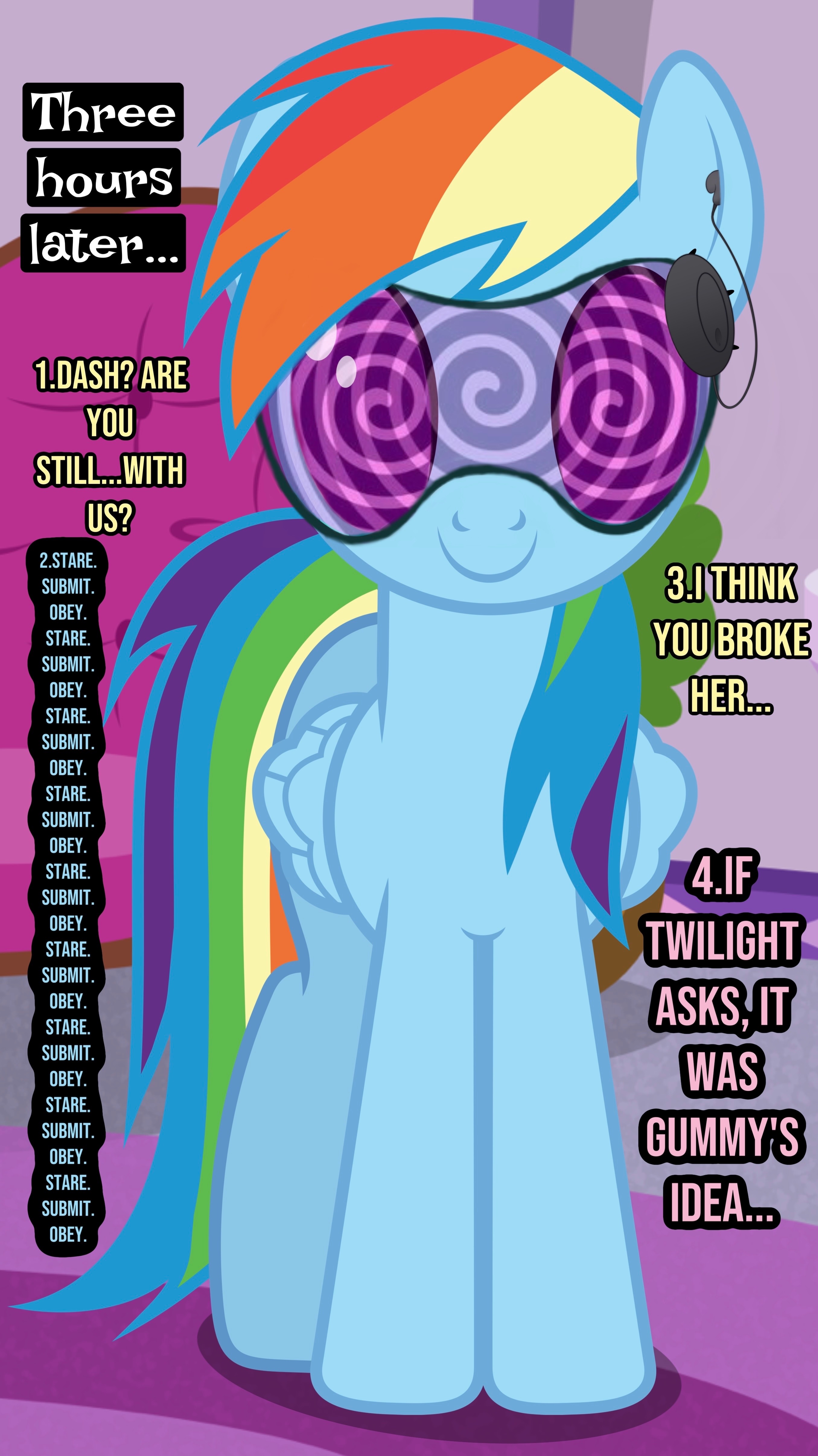 Previous thread >>42966968Originating from a thread about a niche form of hypnosis, now encompasses varied hypnosis methods from spiraling specs to subtle spells, swinging watches to wafting brews. Post anything and everything about controlling a mind. All ponies (mares and stallions, fillies and colts) are welcome and encouraged. Greens and other content only tangentially related will be better recieved in SPG or SiM depending. Good rule of thumb is if it doesn’t involve taking control of a pony’s mind, it probably goes somewhere else. (e.g. no slavery without mind control scenes, IRL self-hypnosis audio, or tupperware rp)Thread archive https://ponepaste.org/9352