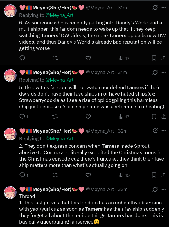>>43017068so far the dandy's world episodes lack the depth that mlp built up to, and i imagine tamers enjoys having some variety in his creative outlets.also I doubt the dandy's world fandom will be as undying as mlp's in the long run. give it another year or two and there won't be a reason for tamers to make another dandy episode.honoring content-starved dying fandoms with his presence sounds like a good move to grow his fanbase though. you come to see your favorite ship one last time, you stay for tamers12345 kino.