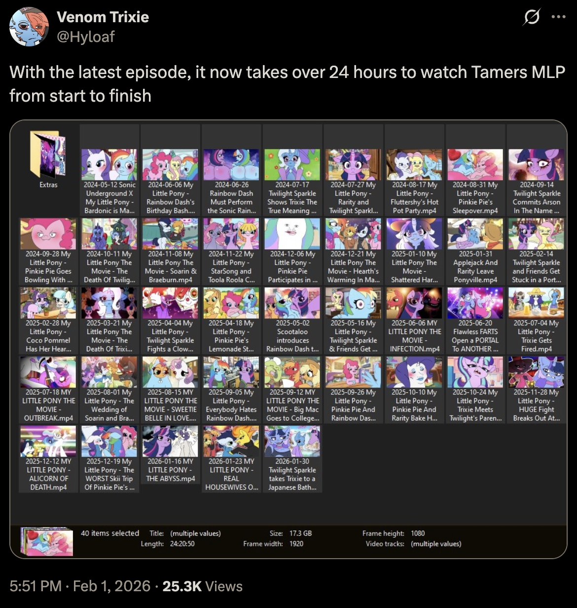 >>43016976>In 5 or 6 years there will be enough Tamers12345 MLP content to warrant its own week-long anniversary re-watch stream