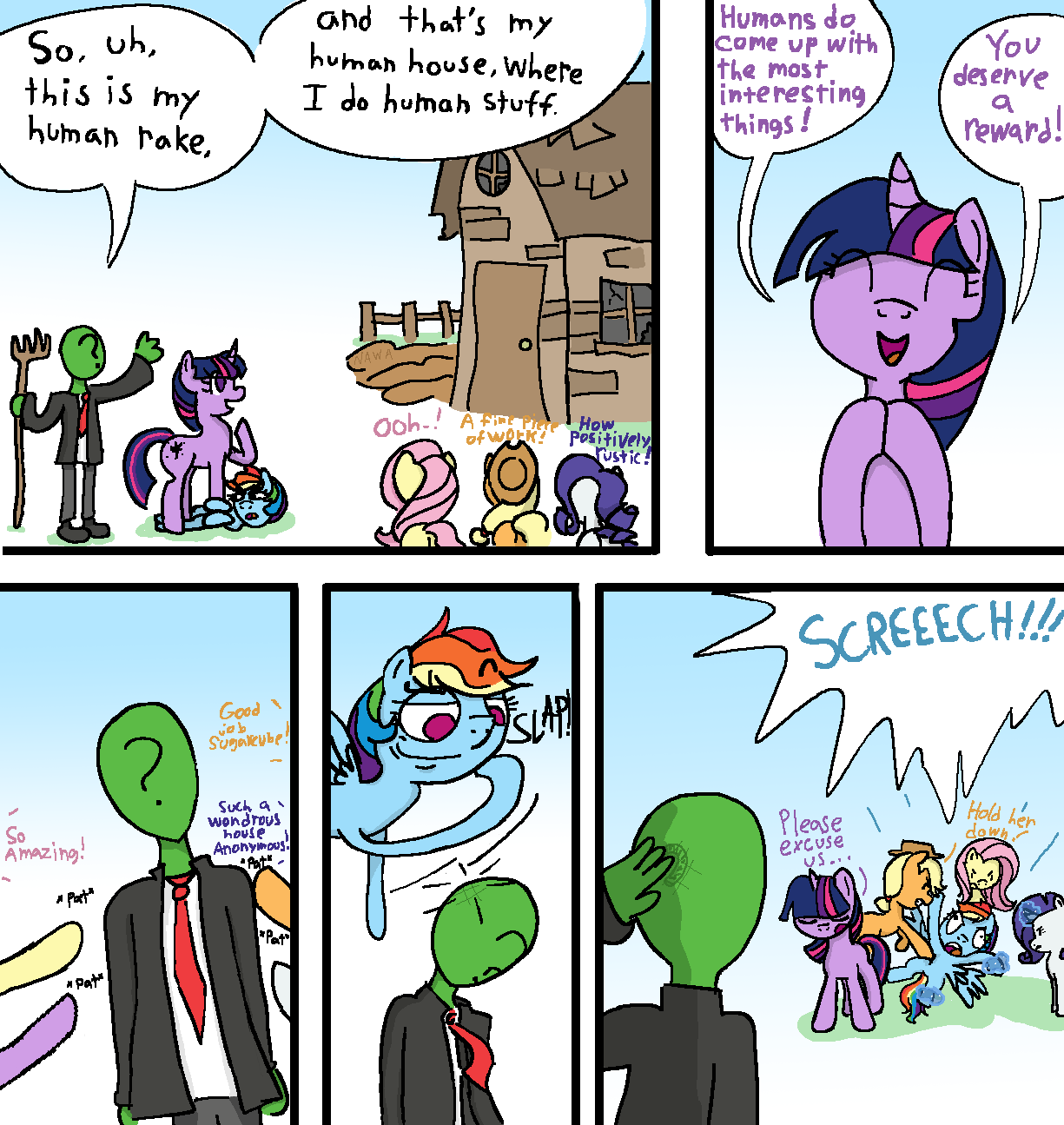 >>43065692>Bit of an unfounded concern, that>As mentioned before, you're far from the only human in Equestria>Hell, there's a fair handful of them in Ponyville>Most of them are fairly docile, and aside from giving you a weird stare with their not-all-there eyes, they haven't tried to go apeshit on you>It's a very 'live and let live' situation when you have to interact with an Equestrian human>So you're expecting pretty much the same when Ruby strides up to inspect you and the rest of the pets currently hanging off and/or chewing on you>That leaves you perfectly open for the woman to reach out and grab a firm handful of your junk, and start making some demonic apeish grunts>"Oh wow, I think she definitely likes him!", Pinkie announces while giggling and snorting behind her hooves>There's a bit of a scramble to separate you, as that grip is anything but pleasant, causing you to flip your shit a bit and flail around the other girl's pets in your struggle>Fluttershy apologizes profusely, but there's a glint in those cyan eyes, that... is a little unsettling>You have the distinct feeling this is going to be a problem, AnonfieldY'know, I was mostly just gonna make these as little unconnected snippets, tell some Garfield jokes with the serial numbers filed off, but then a storyline happened. Not sure how.