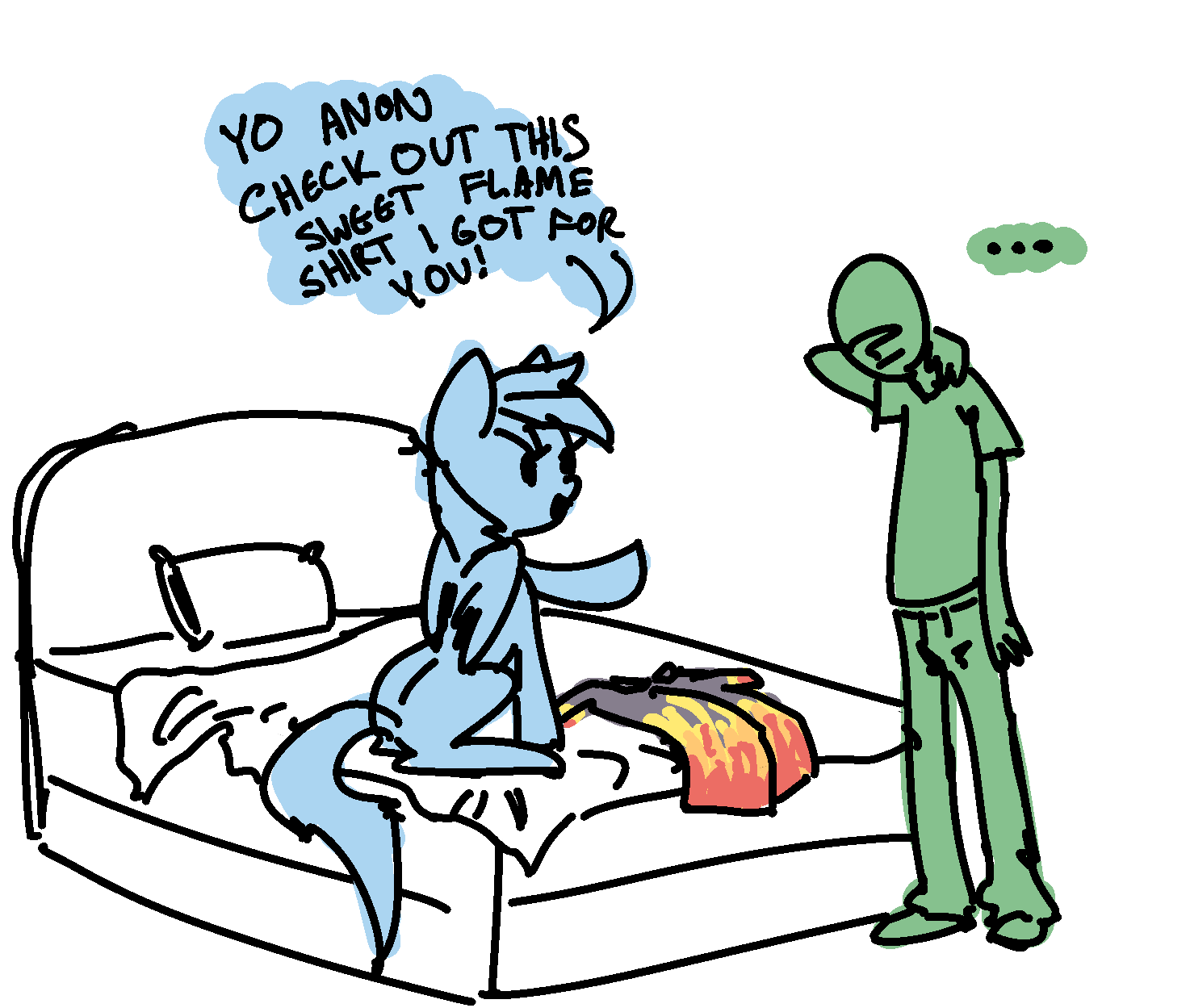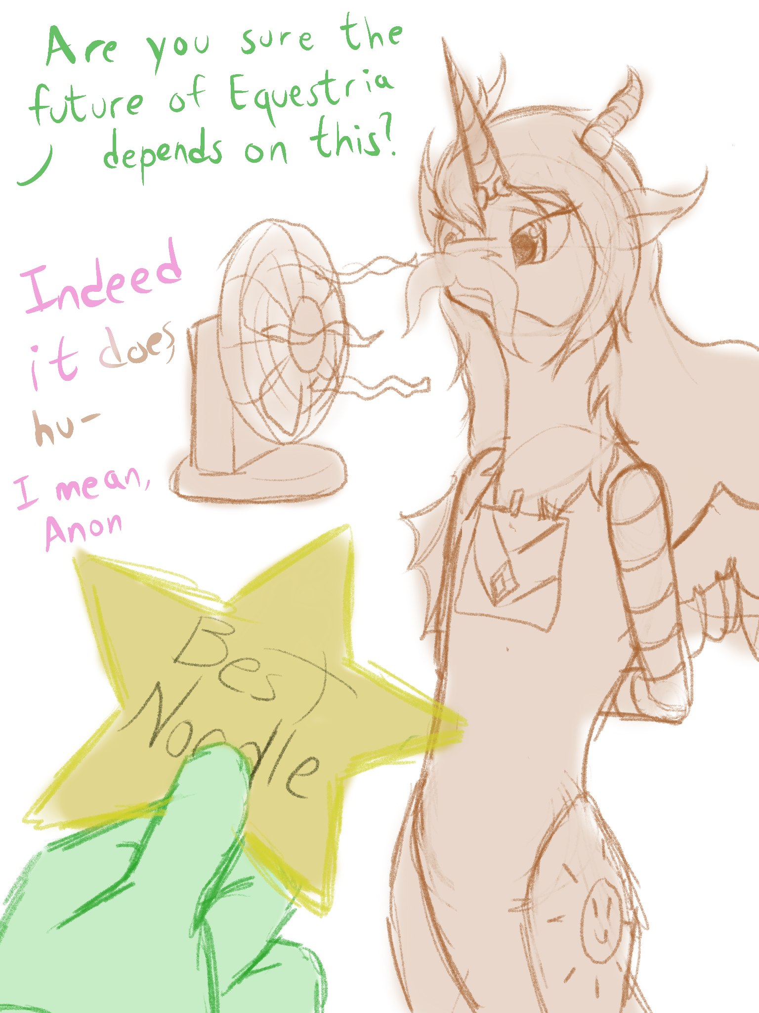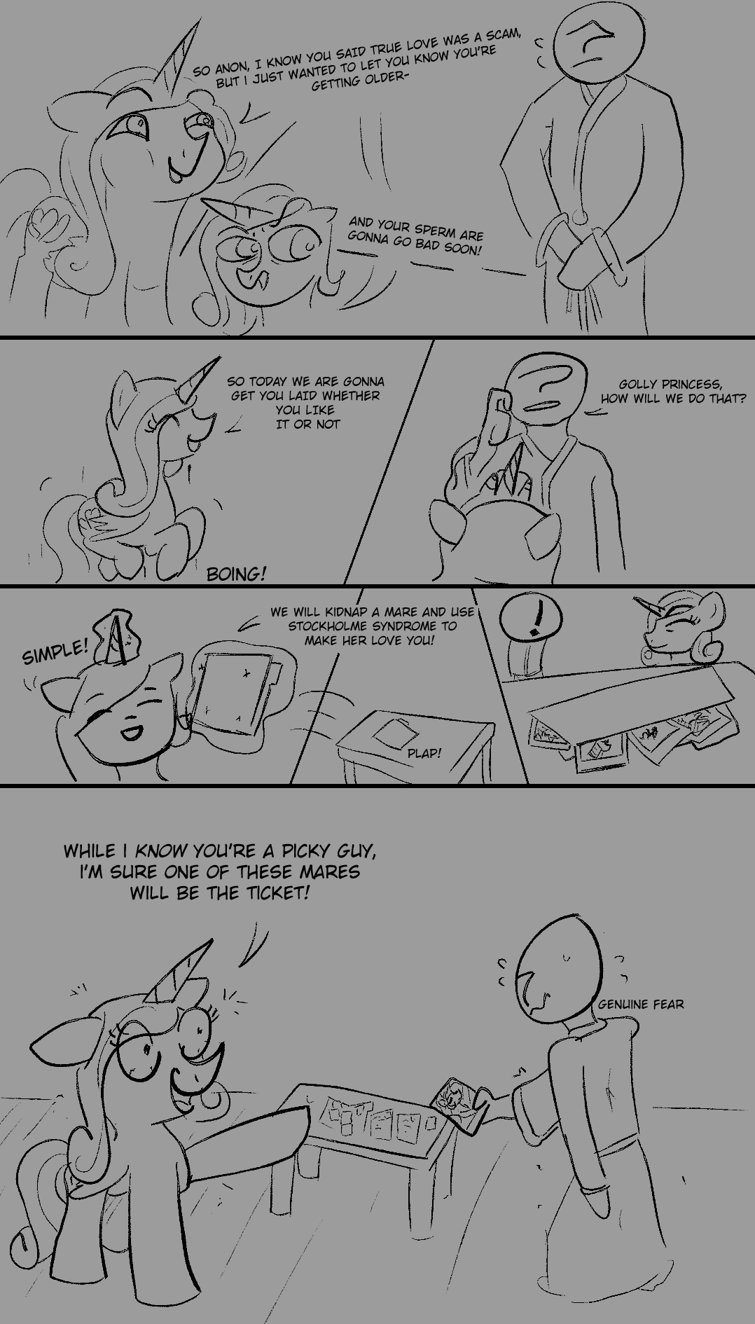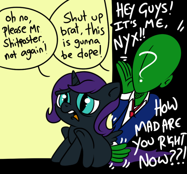 >>43071370"The flightplan I just filed with Canterlot lists me, my waifu, Dr. Sparkle here, but only one of you! The first one to blep gets to stay on my air carriage!">Grabs pegasus and holds her outside carriage as it soars over Ponyville."WHO PAID YOU TO BE THIS CUTE?">Tosses her to the wind, where the mare comfortably flaps away."SHE FLIES PRETTY GOOD, WHOSE NEXT?">Grabs the earth pony mare."TELL ME ABOUT CADANCE? WHY DOES SHE WEAR THE CROWN? A LOTTA ROYALTY FOR AN ORPHANED PEGASUS!"