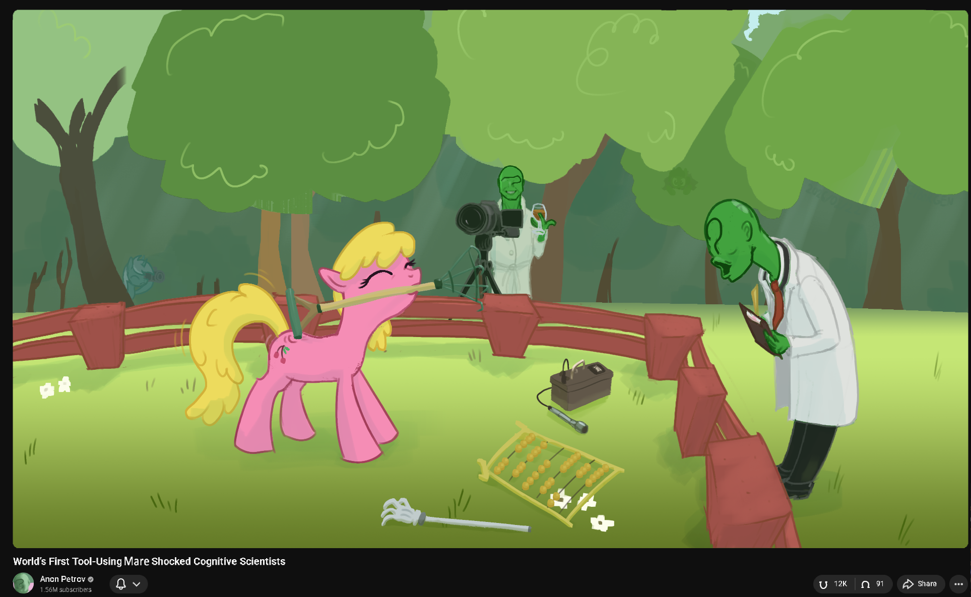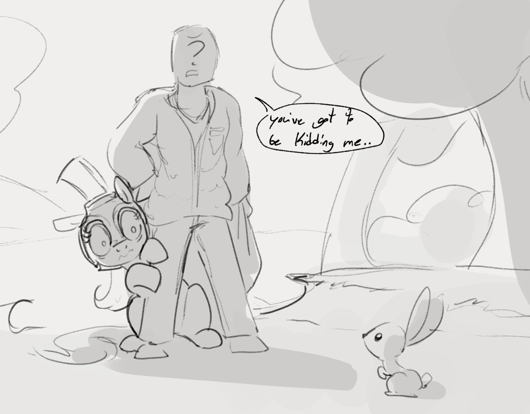 >science Anon is trying to develop a wormhole machine, accidentally punches over into another reality instead>this is, of course, not actually a failure but another excuse to do science>Anon is a decent distance from town, but still quickly encounters ponies>a language barrier exists in the sense he's not even aware they're talking, thinks they're just being unusually horsey>as he didn't see buildings and most ponies move about without any clothes or such, he suspects they're simply very bright animals>time for the tool use, self-identification in a mirror, and object persistence tests!