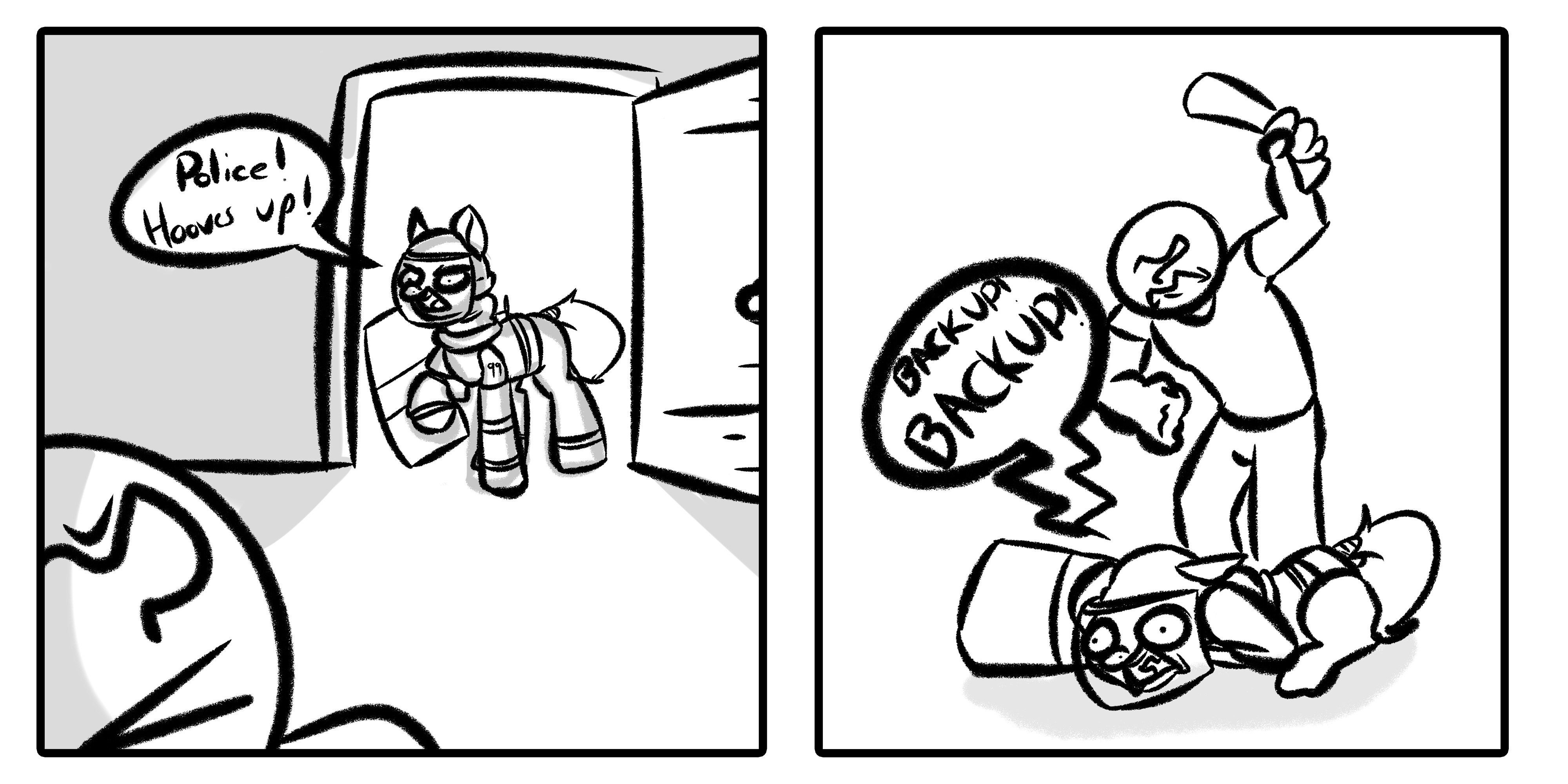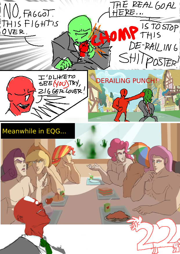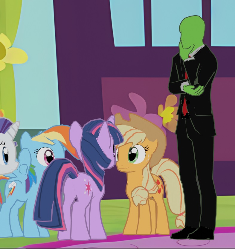 >In any relationship it's important to look out for one another>Showing that you're noticing when someone is in need is the most basic way of letting them know you care about them, after all>"Anon!!">So really, the fact that you've turned this walk into a frantic chase is just your way of noticing your purple princess could stand to burn some more calories is a way of showing you care>(You) are Anonymous, pet of Twilight Sparkle>That's a very literal term by the by, so don't get too excited>Unless heat season comes around and it turns out she shares more in common with white women than being voiced by one>Concerns for later though>For now though it's time to utilize all the Five 'D's>Dodge, Duck, Dip, Dive, and Dodge>Roseluck and her sidekicks scream as you dive over their stall>But that and their subsequent fainting is just their natural state of being so you aren't too concerned>The market's still a bit crowded even this late in the afternoon so you're getting plenty of time to dip between startled ponies>Using their bodies as equine shields to keep Twilight from just nabbing you with her magic>The Princess is gasping for air audibly a few feet back, too worn out to simply overpower you in her current state>Honestly you're starting to think you might need to slow down just so she doesn't lose sight of you>It's not like you're actually trying to escape, after all>"I GOT THAT VARMINT, TWILIGH'!">Oh fuck>Scratch that, time to sprint>You had 1 in 3 odds but it looks like they weren't in your favor today>Applejack's running the family's stall today and she's caught wind of the situation>Big Mac's far too stoic to get involved and Applebloom's too small to be a threat (by herself anyway)>But the Element of Honesty won't hesitate to help out>Plus if (when) she catches you she's going to want to "wrassle">And the way her hooves travel south she's definitely a white woman spiritually>You're pretty sure you can't get married anymore>Either way, you can at least try and mitigate the damage, taking a sharp turn right away from the direction of the Applestall>Forcing Applejack to waste time vaulting over it in an effort to join the chase>Despite the distance the farmpony is in much better shape than your owner>She catches up way too quickly for your liking and lunges>Duck!>The Five 'D's come in clutch once again as you drop to your hands and knees, causing Applejack to soar right over head>That was fast too, she was definitely going to crush you>The farmpone subsequently crashes into another stall, getting herself stuck in the structure>You chuckle darkly to yourself at the sight and prepare to duck into a nearby alley>When your limbs find themselves uncooperative>And the familiar chime of magic rings in your ears as your body is lifted into the air>The aura surrounding you isn't Twilight's magenta>Though the soft blue is still very familiar