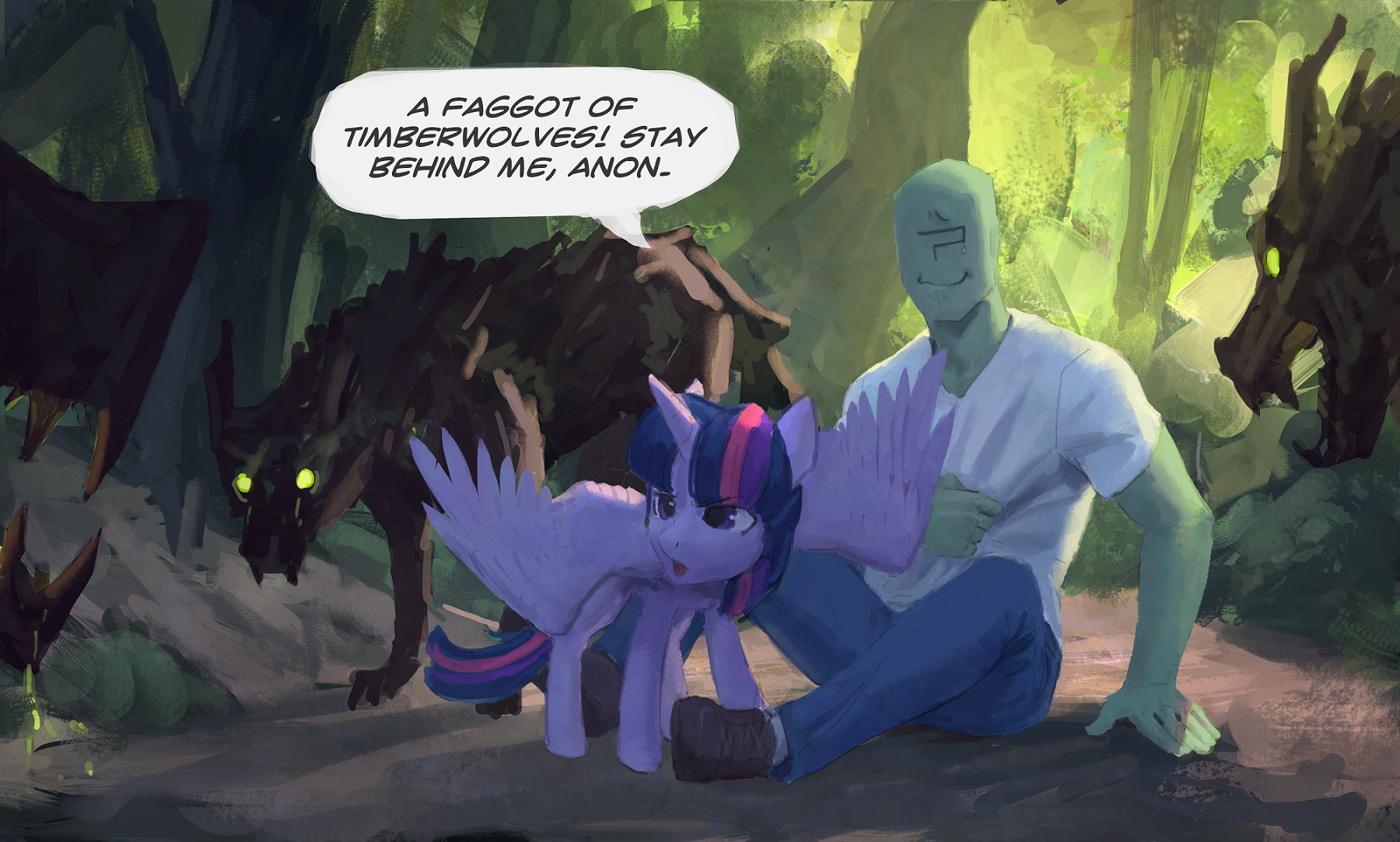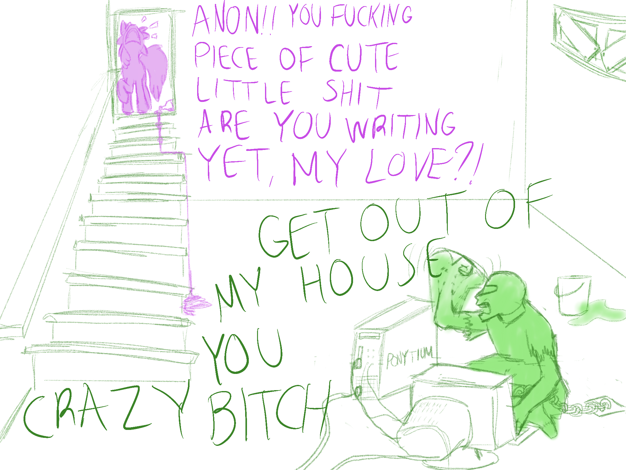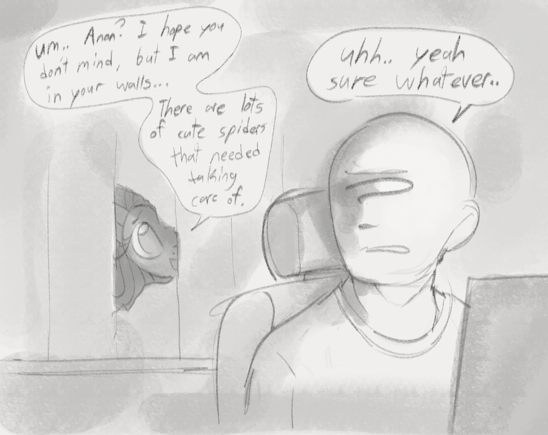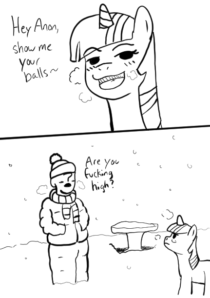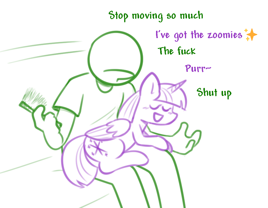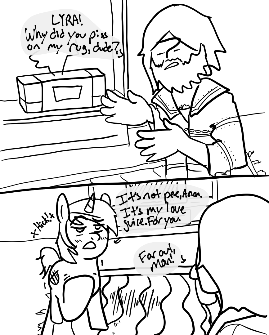 >Alright we're ditching the pithy (You) intro>You're Anonfield, you're Twilight's pet, go>We got a fucking situation here>Which for the most part you've been doing an excellent job avoiding by hiding underneath various bits of furniture>(The amount of clearance Twilight's couches have is fucking insane, who designed this shit?)>FOCUS>As much as you've put this off by fortifying your position>Eventually Twilight and pals are either going to finish refurbishing that dumbass castle or Rainbow's finally going to pitch a fit about how boring the whole endeavor is hard enough to get the rest of them to fold>Just like the group's very short lived book-club once the other five voted to ban Daring Do books after going through 1/3rd of the series>In a row>Even Twilight was getting bored of that shit and she's just as big of a fan of them as Rainbow Da->Dude!>Two feet in the now, please!>Yes, you're avoiding even thinking about it>But this is a problem that isn't going to away by pretending it doesn't exist, like your parents trying to get you to start paying rent:>Fluttershy absolutely wants you to fuck her pet human>(And you're like 90% sure she wants to goddamn watch, if not make some sort of excuse to get all up in that too)>So, get this>Miss "I've never taken care of a human before" has it in her head that because Ruby tried to turn your nuts into applesauce that means she's down bad>There's plenty of other explanations for that!>It could've been a greeting (You've never seen Equestrian humans do that)>It could've been an intimidation tactic (In which case it fucking succeeded)>It could've been a...>A third thing isn't coming to mind but fuck, man>Either way, you're not interested>Don't get it twisted, you like women just fine>Please ignore that you were a virgin in your last life>But the humans here...>It's too much like getting with an animal>There's no soul in there, just base cravings and a lot of hooting>Sometimes in the dead of night you swear you hear that hooting>In a twist of fate you'd honestly rather get down with a mare>They laugh, they talk, they have actual opinions on things>Sapience is pretty much what's getting your dick going these days>And Equestrian Humans absolutely do not have it>(That said Fluttershy's eagerness is off-putting in its' own way, to be honest)>Twilight seems pretty on the fence about the whole thing>Possibly due to aforementioned eagerness weirding her out>But you've heard the two talking during Fluttershy's much more significant visits and you fear she's getting her to come around with the scientific and parental angles she's working