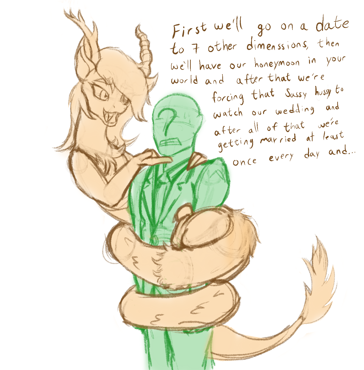 >>43028332>Celestia slowly walks down the aisle, her dress billowing behind her. Holy shit, it was frilly as hell.>The sun seems to shine brighter through the windows at her entrance, something you're sure she had a hand in.>Everyone stays silent as their princess performs her wedding march, everyone save a sniffling Queen Galaxia. To your surprise, Cosmos even had a grin on his face.>Celestia is followed by those creepy blonde quadruplets you had seen around the castle here and there, each with Celestia's banner on their backs and throwing flower petals.>They all spoke at the same time and did the same things, it was fucking creepy.>Celestia takes her place on the altar next to you and mouths "Hey you." underneath the veil.>You mouth it back.>"Gathered friends..." Luan begins. "We are gathered here today to both renew and celebrate the wedding vows these two have shared. While their original wedding was one of...contention to some, we come together here today to do things properly!">Yeah, screw you too, Luna.>"The couple has said that their vows were lost in the haste in which they were first read, so they have each made their own.">IE: You BS'ed your vows in LP and needed to make new ones from scratch.>Celly turns to you. "Mous...You've bothered and bugged me from the moment we met. Our first...intimate moments were the result of a gross invasion of privacy and it shocks me to no end that you continued to entertain my calls after that.">You roll your eyes.>"But...I'm very glad you did." Celestia says with a smile. "You've always been entertaining and I find myself not falling into...past vices when I'm with you. For making me a better mare, I vow to continue to be the wife you deserve from now till the end of my days.""So a shitty one?">Celestia winks. "What you deserve, dear~"