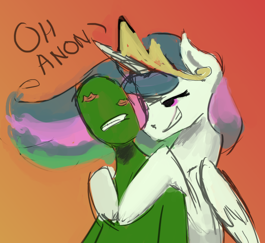 I don't visit these threads often, or read AiE greens for that matter. But i've dreamed about being Anonymous in Equestria this night.The dream starts with me leaving a mix between ponyville, a fort and manehattan, ponies giving me funny looks and i think carrot top really disliked me. So i walk around for a while on some random grassfields and eventually find a giant bird laying on the floor. The creature doesn't show resistance when i try to ride it, so that's what i did and fly to the horizon, where i find a giant house with a giant birdhouse. I land on the roof of the building and then jump from there to the birdhouse (it had multiple openings and was close enough). Inside the birdhouse there were eggs, and one of them hatched once i approached them, revealing what looked like a little chick. It thought i were his mother and i rid him, the flap of his wings being enough for slowing the fall. The giant bird then catched us mid-air on its back and wasn't very content with me about the extra passenger, possibly because of the extra weight. Anyway, we also saw some normal sized ducks flying around and a group of pegasi were one of them that was left behind by the group. Once the pegasi were done with the duck, he began to fall and the other ducks stopped to watch, but didn't help. We tried to catch him and by following his fall we came back to where i started, the hybrid dreamy pony city. At this point in my dream, the falling duck simply disappeared or maybe i just forgot about it. Anyway, when i landed the ponies were very mad at me for whatever reason, and then one of them said the princesses wants to see me. I saw a line of humans while i was going to the castle, which is weird because they weren't here before. I was excited about being called by the princesses and rushed right in. Inside the castle there were multiple catholic church like rooms with the usual church benchs and there were more humans sitting on these benchs. All middle aged humans for whatever reason. Once i finally reached the throne room, expecting to see the alicorn princesses, what i actually found was Celestia as a 70 years old human woman waiting for me on the side of her throne to talk about the problem and luna as a human woman in her 30s busy dealing with a line of ponies. Then i woke up.