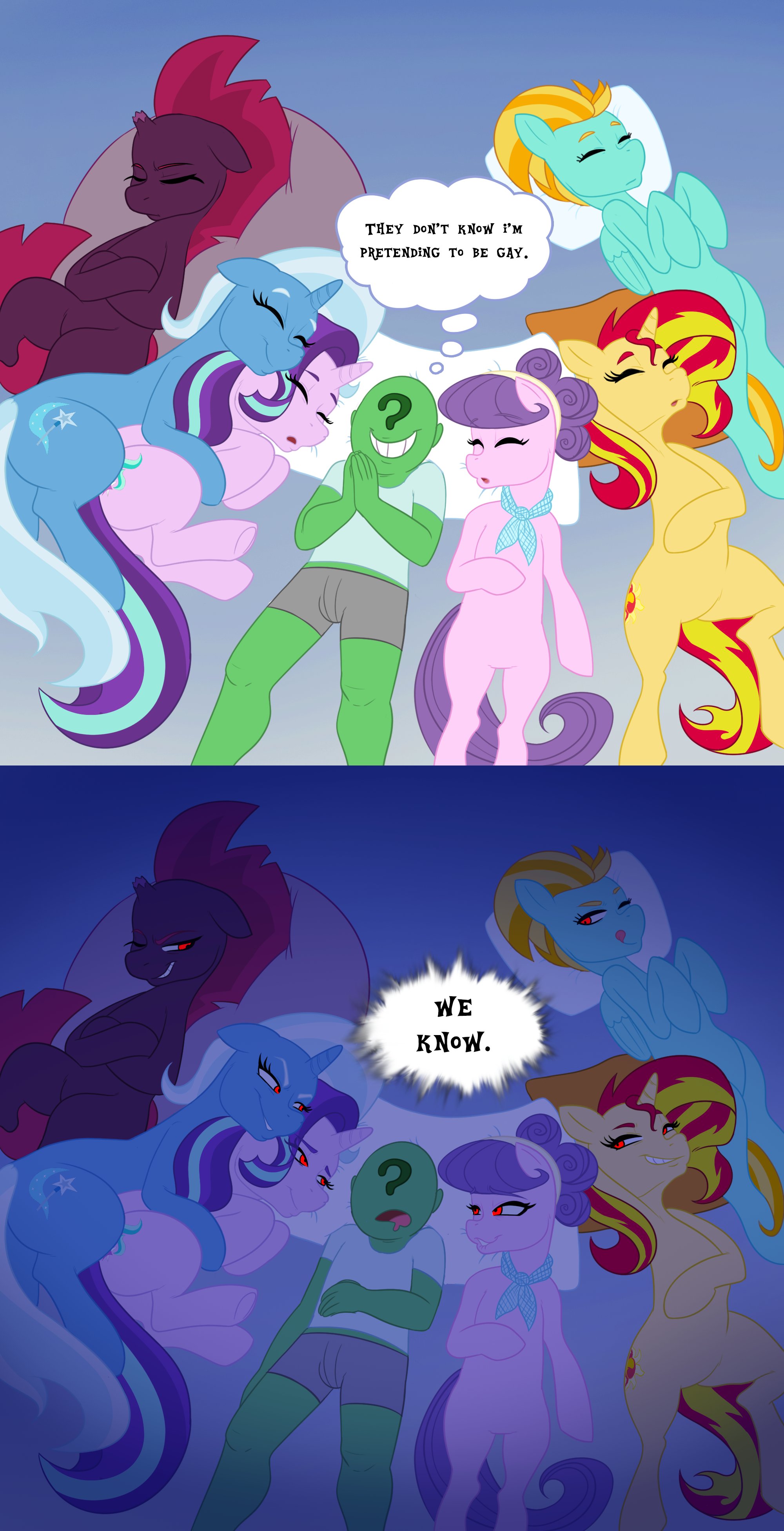 >>43027776I wonder how long it would take, with anon showing up and using all these things that were clearly meant for hands, before some ponies really looked at the objects for the first time and it clicked that they were made for such manipulation. Twilight suddenly has a dozen string boards of conspiracies, running everywhere from "humans are the ancients" to "humans rule the world from the shadows" to "the princesses have a human fetish".