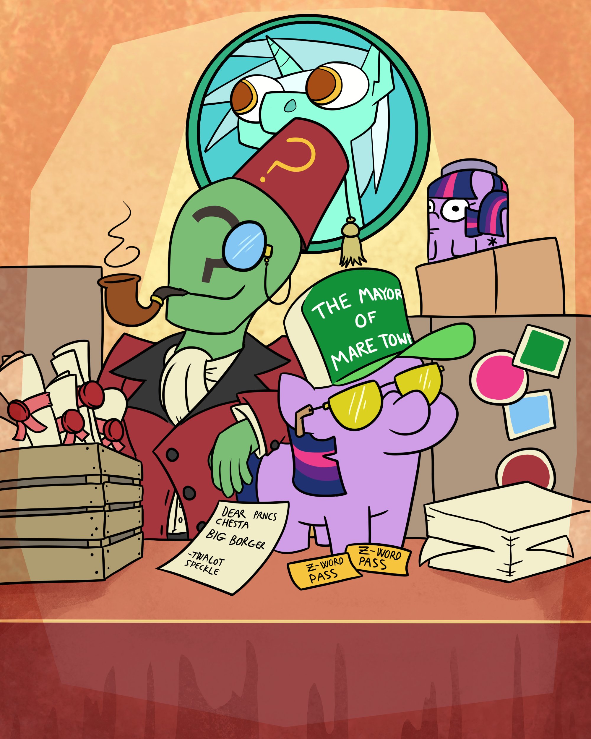 >With a great sigh, you plop yourself down in your favorite couch in the library>Despite your best efforts to mitigate it, the inevitable finally happened:>Rainbow Dash got bored>And when Rainbow gets bored, she gets whiny>(Honestly, you love your friend, but the tantrums she can pull are the sort of thing you wouldn't expect even out of Spike or the Crusaders on their worst days)>That led, naturally, to her brigading the rest of your friend group into siding with her>They tried to calm her down, but unfortunately her will was just stronger than everypony else's>'This castle is going to take a million years to clean up by ourselves!' You doubt she remotely sourced that timeframe, progress was going well!>'I could be practicing right now!' While it was true that Rainbow did practice her routines and such often, you doubted that she didn't just want to take a nap, too>'This is really cutting into our own work, you know?' You... couldn't argue that, true. Rarity had been complaining that the time to complete her boutique's orders was getting very fine>So the Castle Restoration Project is on hold>(You say hold but you know in the depths of your heart that getting the girls to return to it is going to be a difficult task)>That's disappointing, but there's at least one other project that you can really focus on now that you've been looking forward to>Namely, the breeding project with your pet, Anonymous>(You) are Twilight Sparkle, and while you admit you were hesitant at first ->Especially compared to the kind of enthusiasm Fluttershy had ->The whole idea has really grown on you>Beyond the idea of giving Anon an outlet for his energy>(You do feel bad about how often he's left alone in the Library, thanks Rarity)>There's an odd maternal chord in your soul being plucked at the idea of having some human cubs in your home>Your relationship with Spike is... messy>You hate to admit it, but defining it is impossible, even for somepony as obsessed with categorization as you>Little brother, son, friend... employee?>It all worked out, and you love your charge>But this seems like it'd be way more straightforward:>Your pet has babies, so you are Grandma Sparkle>A small shock of excitement at the idea lances through your withers, and your wings shuffle autonomously>Enough to generate a little breeze, that ruffles some papers on the nightstand>You hadn't noticed that in in your commiserating over Dash>It looks like... a letter?>Bearing a somewhat crude drawing of your Cutie Mark >Odd, if Spike had gotten a missive from the Princess or checked the regular mail, he would've handed that off immediately, not just dropped it on a random table and left it unannounced>With a chime of magic the note is unfolded and brought up to your face for perusal>The penponyship is... strange, with an odd slant to it you're not accustomed to>But it's still legible>'Dear Twilight'>'This is going to be one of the hardest letters I ever write'