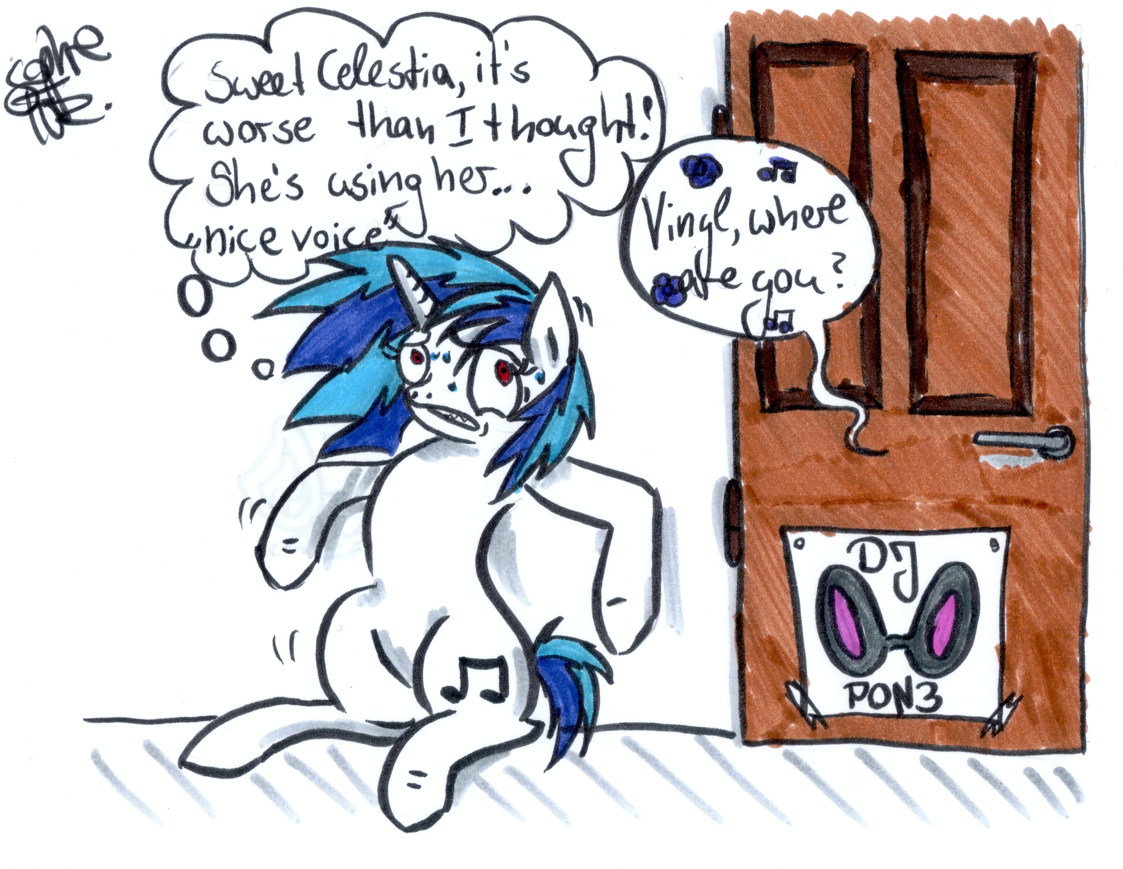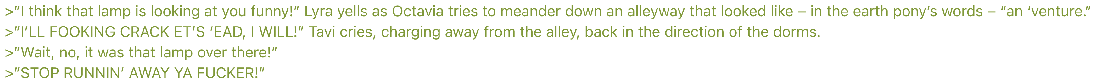 >>43034036Harmonycon is fun. Anyway, have a green. Not happy with the pacing, but ¯_(ツ)_/¯ >Octavia walks in to find the formerly empty half of the room filled with cables, speakers, sound equipment and a very self-satisfied pony standing behind a set of turntables.>Aria walks over to the pony and gives her a kiss on the cheek. She swats at her mom and tries to hide a smile."Ok, sweetie, have fun. Write us if you need anything.">The shock of blue hair bounces as she waves off her parents.>The sharp click of the door brings Octavia somewhat back to her senses.>She had been standing motionless by her bed, dumbfounded at the absurdity of it all.>The sound of speaker static grows slightly in the background and a clip of Matthew McConnahay says"You gonna talk?">Octavia blinks a few times and looks to her apparent new room mate who is looking at her.>Magenta eyes make small movements across Octavia's face, patiently waiting for an answer."Wh-... what?">The pony presses a square on a grid of buttons and the sound byte plays again."You gonna talk?">Octavia blinks and flaps her jaw searching for words that are escaping her."O-oh, um, you're Adagio, correct?">She presses another button. A line delivered by several cut up samples says"I. AM. Vinyl Scratch.">She then taps her student ID which levitates over to Octavia to re-demonstrate her preferred name.>Octavia pushes the card away, her brow furrowing."Yes yes, that's a nice stage name, but you're Adagio Concerto and your parents-">She gets cut off by the ID reappearing in front of her nose. The DJ wiggles it back and forth and replays the sampled voice."I. AM. Vinyl Scratch">Octavia's voice hardens a bit and she swats the ID out of the air."Would you quit that? *You're* the daughter of Beautiful Aria and Crescendo?!">Magenta eyes narrow and she presses another button, playing a short"Yep""Seriously, stop that. Can you take this seriously?">Another sample"Nope">Octavia huffs and paces around the room, inspecting all of the equipment harshly."And what, pray tell, is all of this for? Adagio, you're supposed to be a singer like your parents, there's no need for all of thi-">Octavia is swiftly cut off by the white mare jumping on her and knocking her down.>The magenta eyes which once regarded her with calm curiosity now burn with rage as they stare down at her.>The two stare at each other silently for a moment.>Octavia is the first to speak up."Well? Are you going to say something?">The pony snarls and opens her mouth to scream.>What comes out instead is best described as a scratchy, choked, whisper-yell, like a shi tzu with laryngitis."My name is Vinyl Scratch and I can't talk, you dumb donkey!"