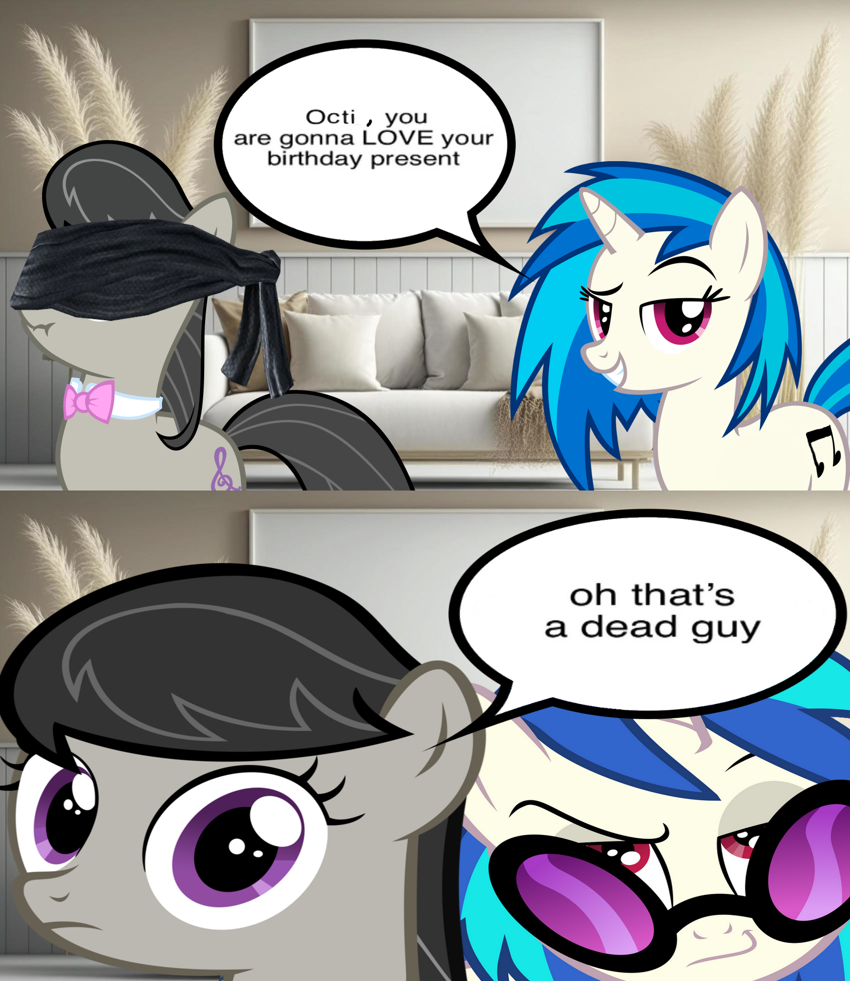 >>43044406>Vinyl does a "bit" where she runs in circles really fast>Octavia, half-asleep on the couch and watching her, simply waves a hoof>Vinyl is knocked out immediately, bashing her head into the wallTavi would have to be careful when she uses her vampire magic around Vinyl, so drinking her blood is probably the safer bet