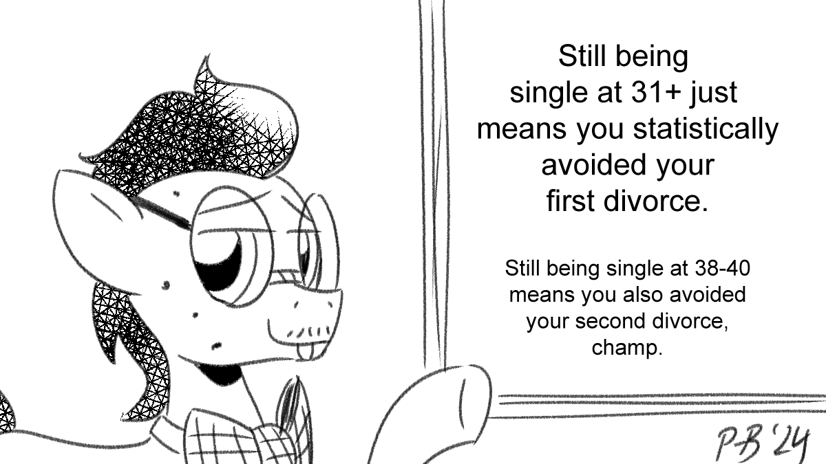 >>43130331He just can't be aware that marriage to a pony would be ideal. Marriage in this reality he's probably got a point.