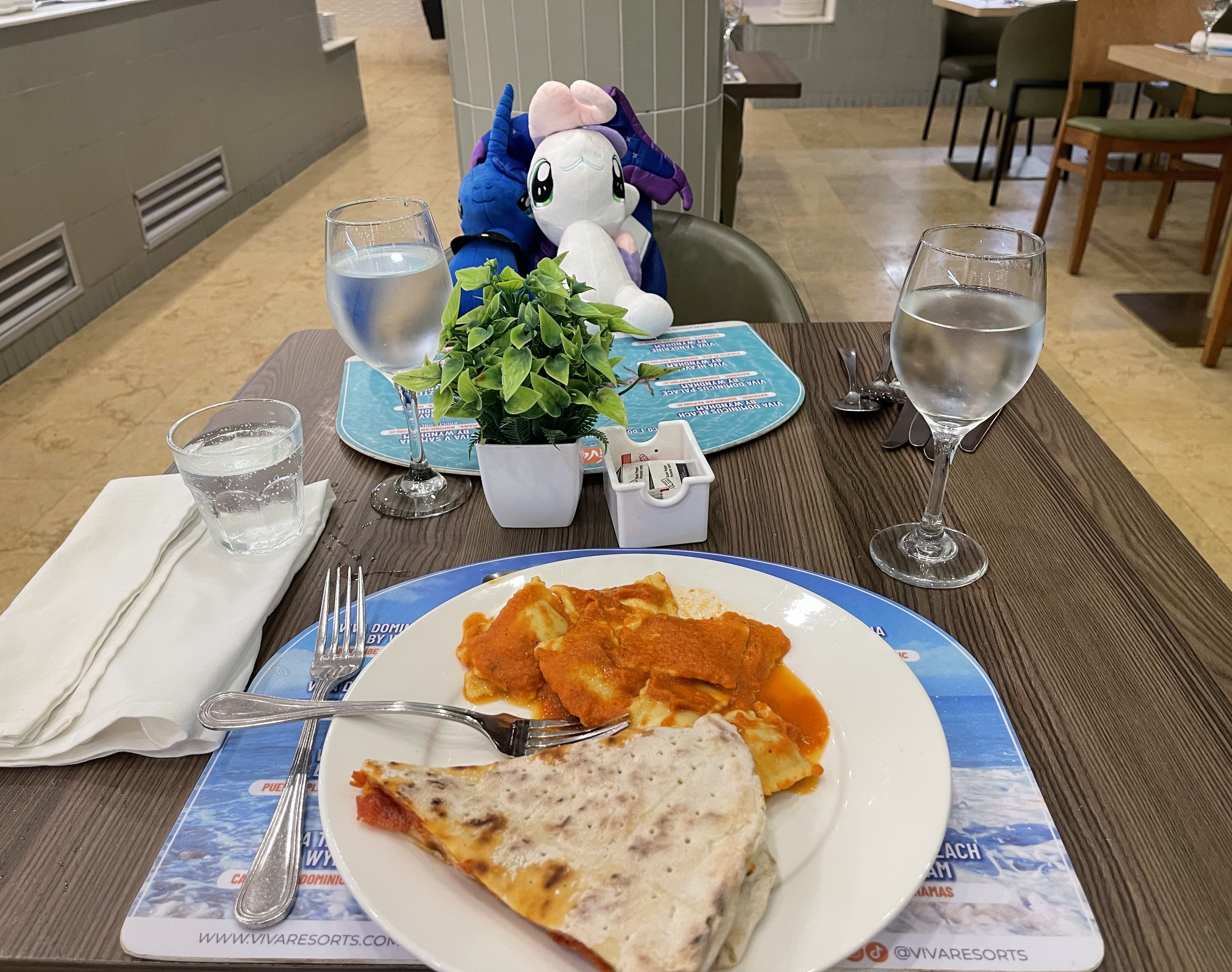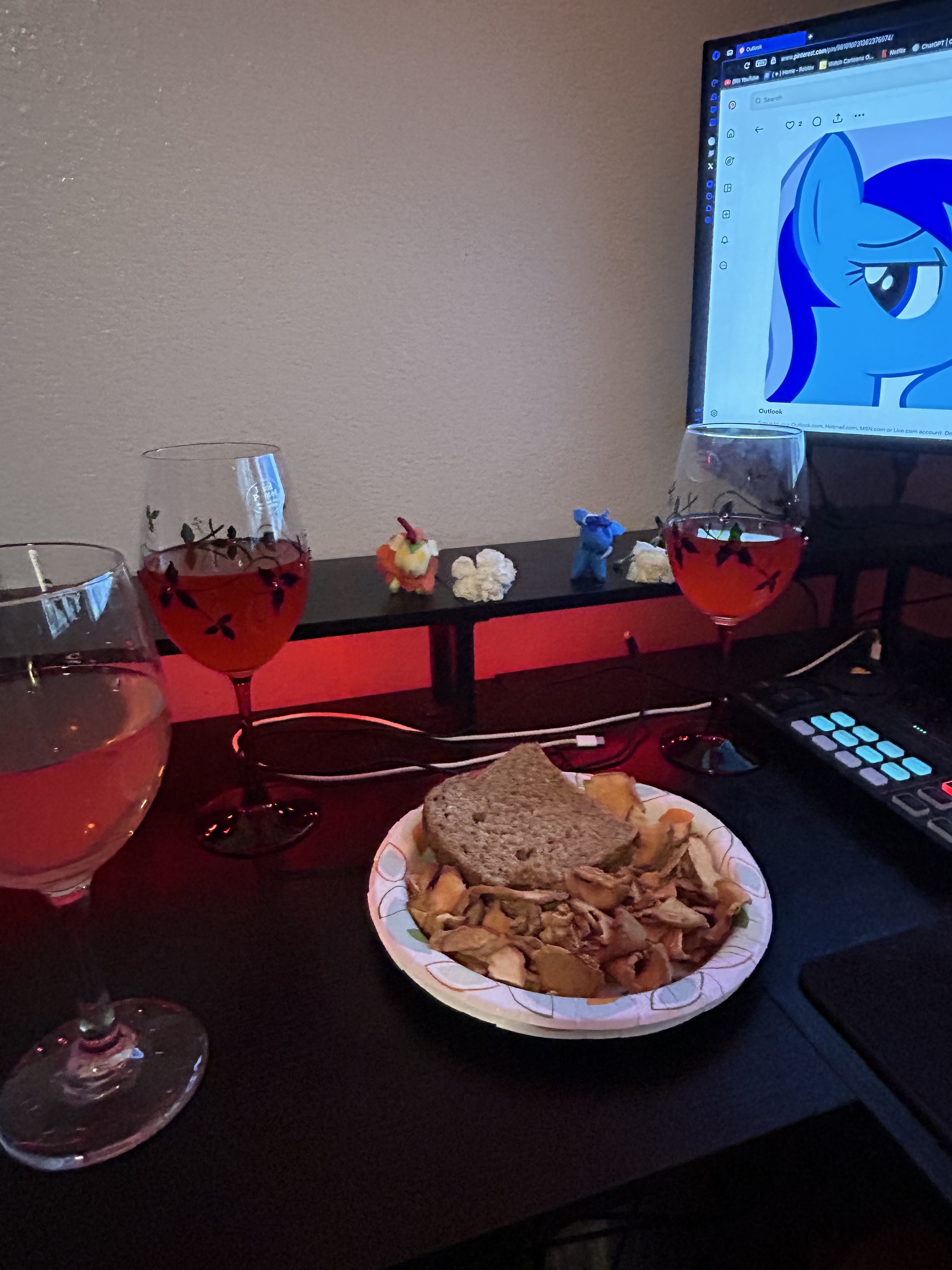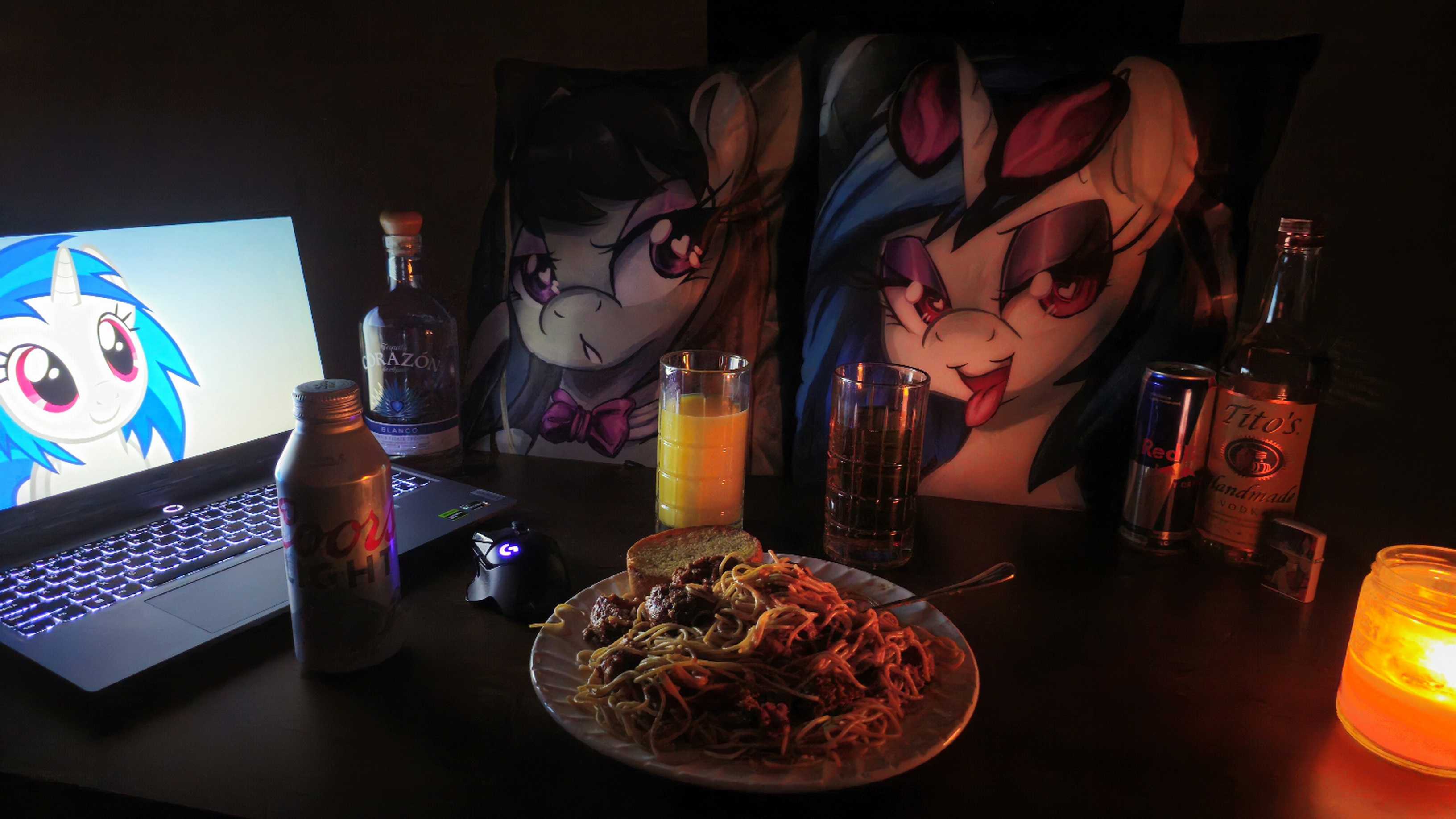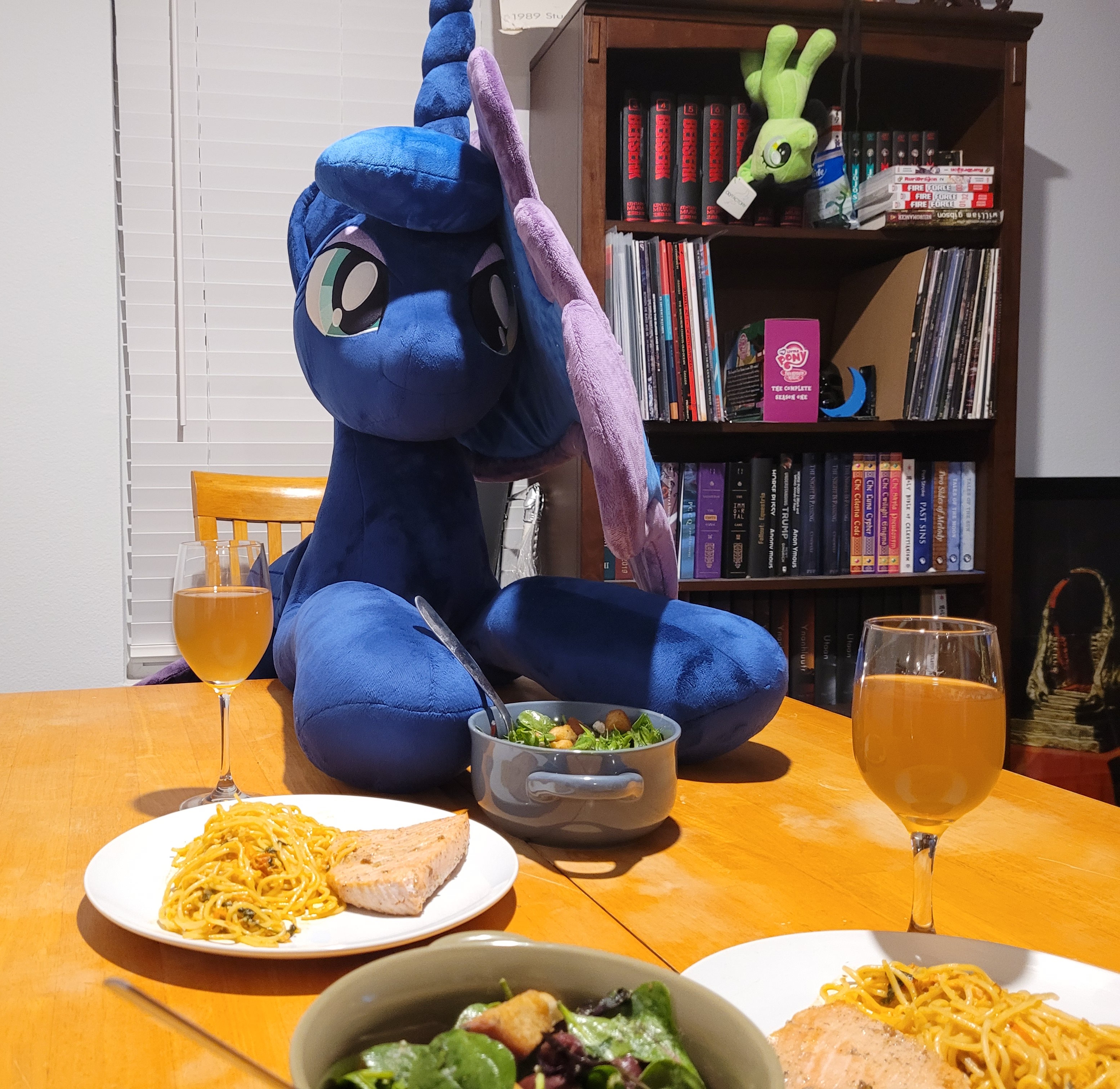 Having spaghet and drinks with my two bass playing mare friends
