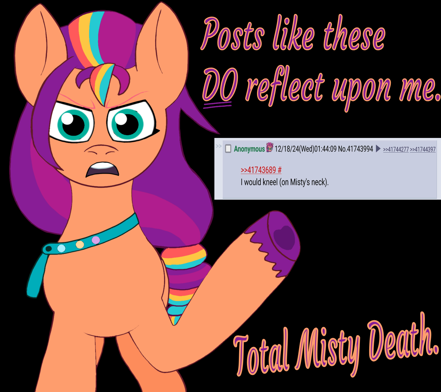 I personally love Misty, just for the record. I think she’s cute, and adorable, and lovable, and relatable, and kino, and snowpityful, and one of the most cutest, bestest, and all around most wondrousful ponies of pure beautiful beauticality to ever grace the corporal world with her lovely existence, even if only through our TV screens, her majesty is still known to us in a very strong, and very truthful way. She proves to us every day that a loving God MUST exist. Her haters will be forgotten like the dust in the wind, or like mosquito squashed underneath an elephant’s ass. No value. No worth. Only bitter hatred at those (like Misty) who DO have true meaning and true purpose.