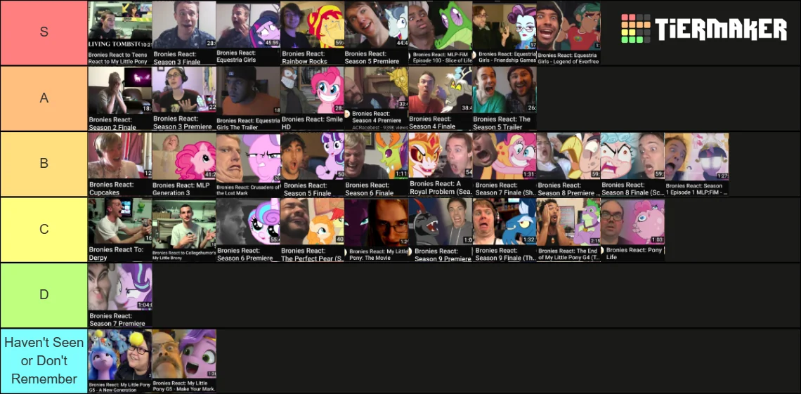 Tier List Rankings Explained:Teens React to MLP: S Tier - Absolutely hilarious and perfectly executed. They critiqued the video well while also not taking themselves seriously at all and providing a bunch of hilarious lines. This series could not have started off better.Derpy/College Humor My Little Brony: C Tier - Mainly just a discussion about these topics. Cool time capsules and the guys made good points, but besides that not much interesting or comedic here.Cupcakes: B Tier - Only first few minutes are reactions to the actual video, which were hilarious. The rest of it is just a discussion about it. Pretty fun overall, especially Saberspark’s disgust.Season 2 Finale/Season 3 Premiere: A Tier - First couple episode reactions, and very fun. I wish they were longer and they feel rushed. However, that is understandable since these was the first ones, and its really cool to see all these guys react first time to such old episodesSeason 3 Finale: S Tier - We have now hit the sweet spot in the pacing of the episode reacts. Has enough reactions so that everything interesting is covered without feeling rushed but few enough so that it doesn’t drag on and is very rewatchable. AcRacebest’s theories and how he edited those segments were the highlight here. The gold standard to follow for these.Equestria Girls Trailer: A Tier - Really good mix of comedy and serious discussion on the topic at hand. An interesting variety of takes, with a good overall message about how the drama was overblown and the best solution was to wait and see if the movie would be good.Equestria Girls Movie: S Tier - Once again, great pacing for an episode react, and since this movie is so easy to make fun of they had great material to work with. And BlackGryph0n literally skydived on video just to complain about Flash Sentry. Nuff said.(2/5)
