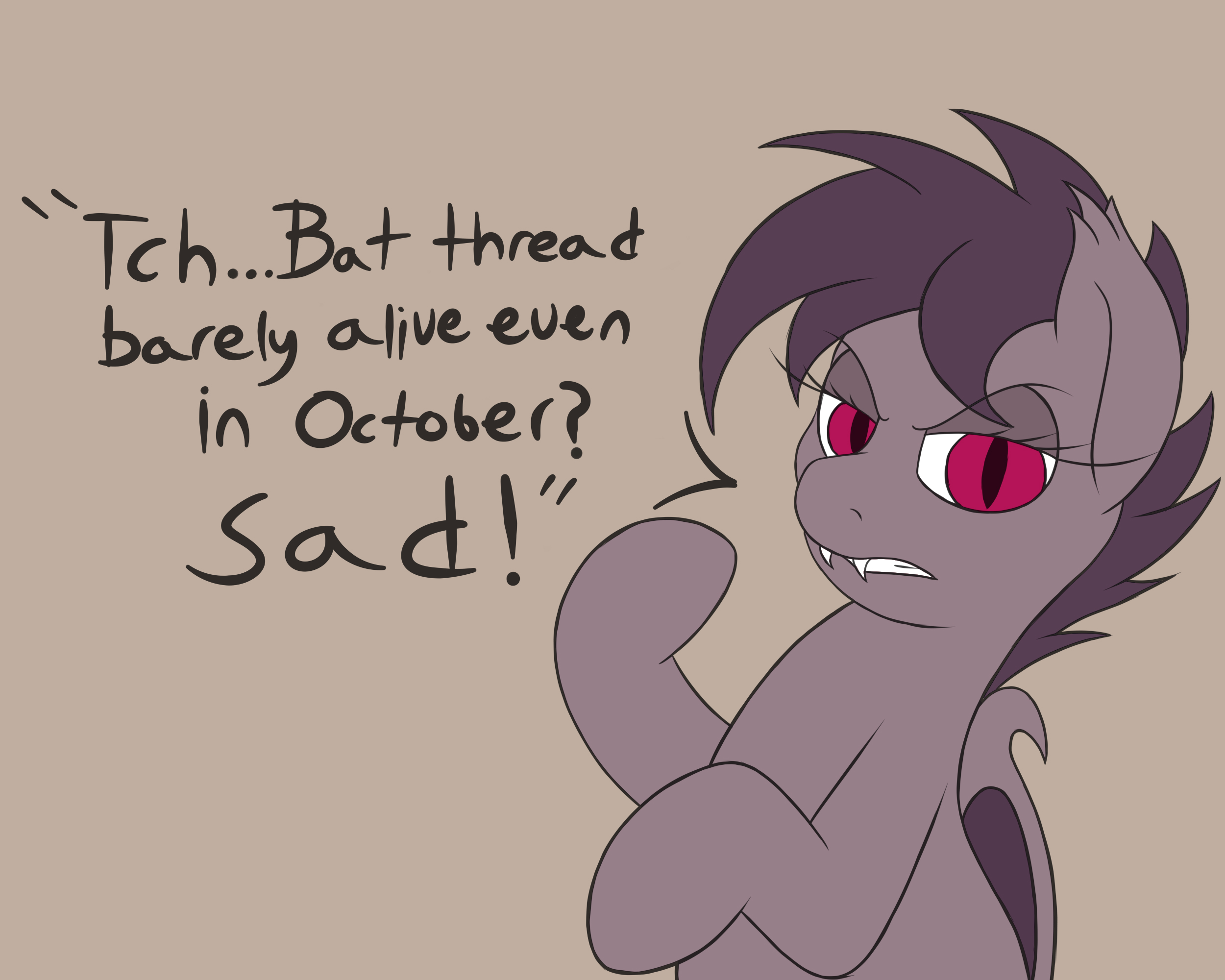 >Bat pony breaks into your house.>You try to get her out but she's too tricky.>Bat pony starts sitting on your lap any time you sit down and sleeping in your bed. Trying to sleep on the couch just means she sleeps on the couch too.>Can't get her off the bed. Cuddling is now mandatory.>You hold off for months... then make a single mistake one night.>One nut is all she needs. Bat gets pregnant from a single load like a total Stacy. She will never stop bragging about that.>And now?>You're stuck raising a bat pony daughter. And if you're not careful, well one more 'mistake' means you're gonna have two of them to take care of.